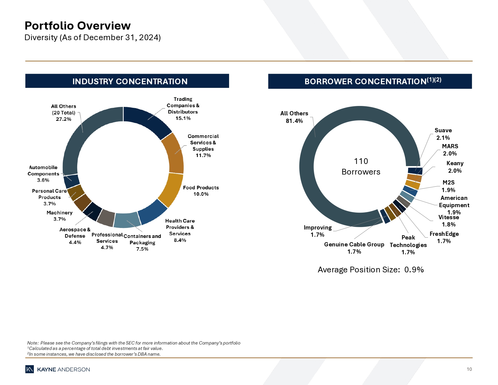 9 Portfolio Overview Key Statistics 1 1Q’24 – 4Q’24 includes investments in broadly syndicated loans; as of 4Q’24, KBDC held $253 million of such investments (fair va lue) across 21 borrowers. Quarters prior to 1Q’24 presented above included no investments in broadly syndicated loans. KEY PORTFOLIO STATISTICS ($ IN MILLIONS) (1) Dec 31, 2024 Sep 30, 2024 Jun 30, 2024 Mar 31, 2024 Dec 31, 2023 Portfolio Highlights Funded Investments at Fair Value $1,995 $1,943 $1,847 $1,784 $1,363 Number of Portfolio Companies 110 110 106 103 76 Average Position Size at Fair Value ($) $18.1 $17.7 $17.4 $17.3 $17.9 Average Position Size at Fair Value (%) 0.9% 0.9% 0.9% 1.0% 1.3% Portfolio Composition (at fair value) First Lien 98% 98% 98% 98% 97% Second Lien 0% 0% 0% 0% 0% Subordinated 1% 1% 1% 1% 2% Equity 1% 1% 1% 1% 1% Loans by Interest Rate Type % Floating Rate Debt Investments 100.0% 100.0% 100.0% 100.0% 100.0% % Fixed Rate Debt Investments 0.0% 0.0% 0.0% 0.0% 0.0% Asset Level Yields (at fair value) Weighted Average Yield on Private Credit Loans 11.1% 11.9% 12.3% 12.4% 12.5% Weighted Average Yield on Broadly Syndicated Loans 7.1% 7.8% 8.3% 8.4% N/A Weighted Average Yield on Debt Investments 10.6% 11.3% 11.7% 11.7% 12.5% Non-accrual Debt Investments (at fair value) Non-accrual Investments $25.0 $19.2 $18.9 $7.0 $5.9 Non-accrual Investments as a % of Debt Investments 1.3% 1.0% 1.0% 0.4% 0.4% Number of Investments on Non-accrual 3 2 2 1 1