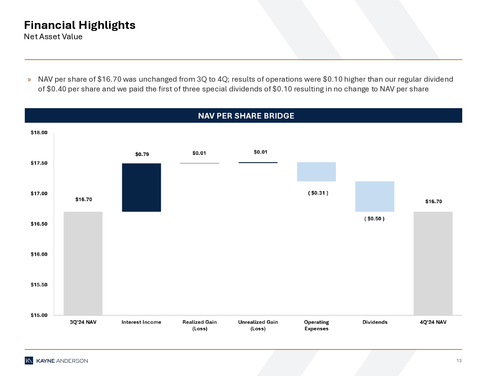 13 Financial Highlights Net Asset Value NAV PER SHARE BRIDGE » NAV per share of $16.70 was unchanged from 3Q to 4Q; results of operations were $0.10 higher than our regular dividend of $0.40 per share and we paid the first of three special dividends of $0.10 resulting in no change to NAV per share