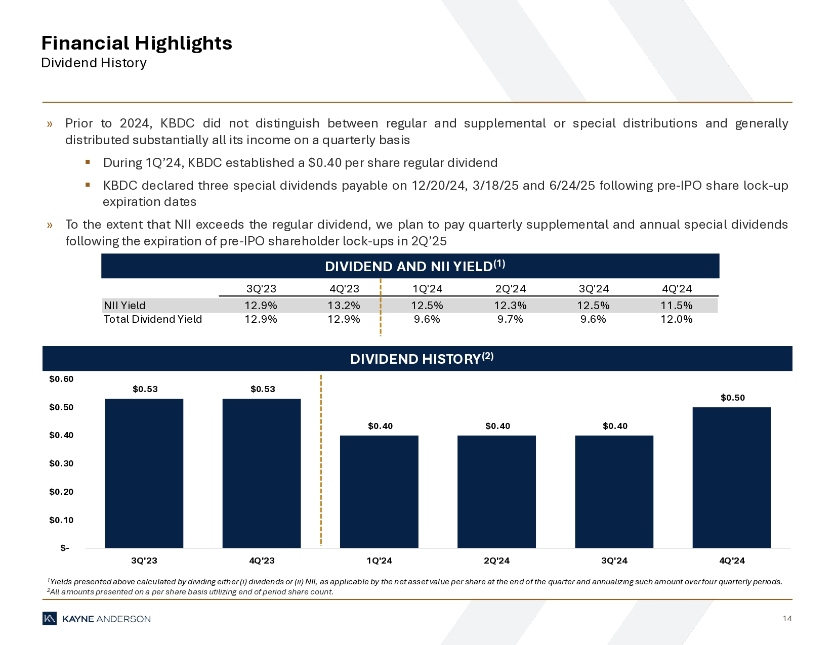 14 $0.53 $0.53 $0.40 $0.40 $0.40 $0.50 $- $0.10 $0.20 $0.30 $0.40 $0.50 $0.60 3Q'23 4Q'23 1Q'24 2Q'24 3Q'24 4Q'24 3Q'23 4Q'23 1Q'24 2Q'24 3Q'24 4Q'24 NII Yield 12.9% 13.2% 12.5% 12.3% 12.5% 11.5% Total Dividend Yield 12.9% 12.9% 9.6% 9.7% 9.6% 12.0% Financial Highlights Dividend History 1 Yields presented above calculated by dividing either (i) dividends or (ii) NII, as applicable by the net asset value per shar e a t the end of the quarter and annualizing such amount over four quarterly periods. 2 All amounts presented on a per share basis utilizing end of period share count. DIVIDEND HISTORY (2) DIVIDEND AND NII YIELD (1) » Prior to 2024 , KBDC did not distinguish between regular and supplemental or special distributions and generally distributed substantially all its income on a quarterly basis ▪ During 1 Q’ 24 , KBDC established a $ 0 . 40 per share regular dividend ▪ KBDC declared three special dividends payable on 12 / 20 / 24 , 3 / 18 / 25 and 6 / 24 / 25 following pre - IPO share lock - up expiration dates » To the extent that NII exceeds the regular dividend, we plan to pay quarterly supplemental and annual special dividends following the expiration of pre - IPO shareholder lock - ups in 2 Q’ 25