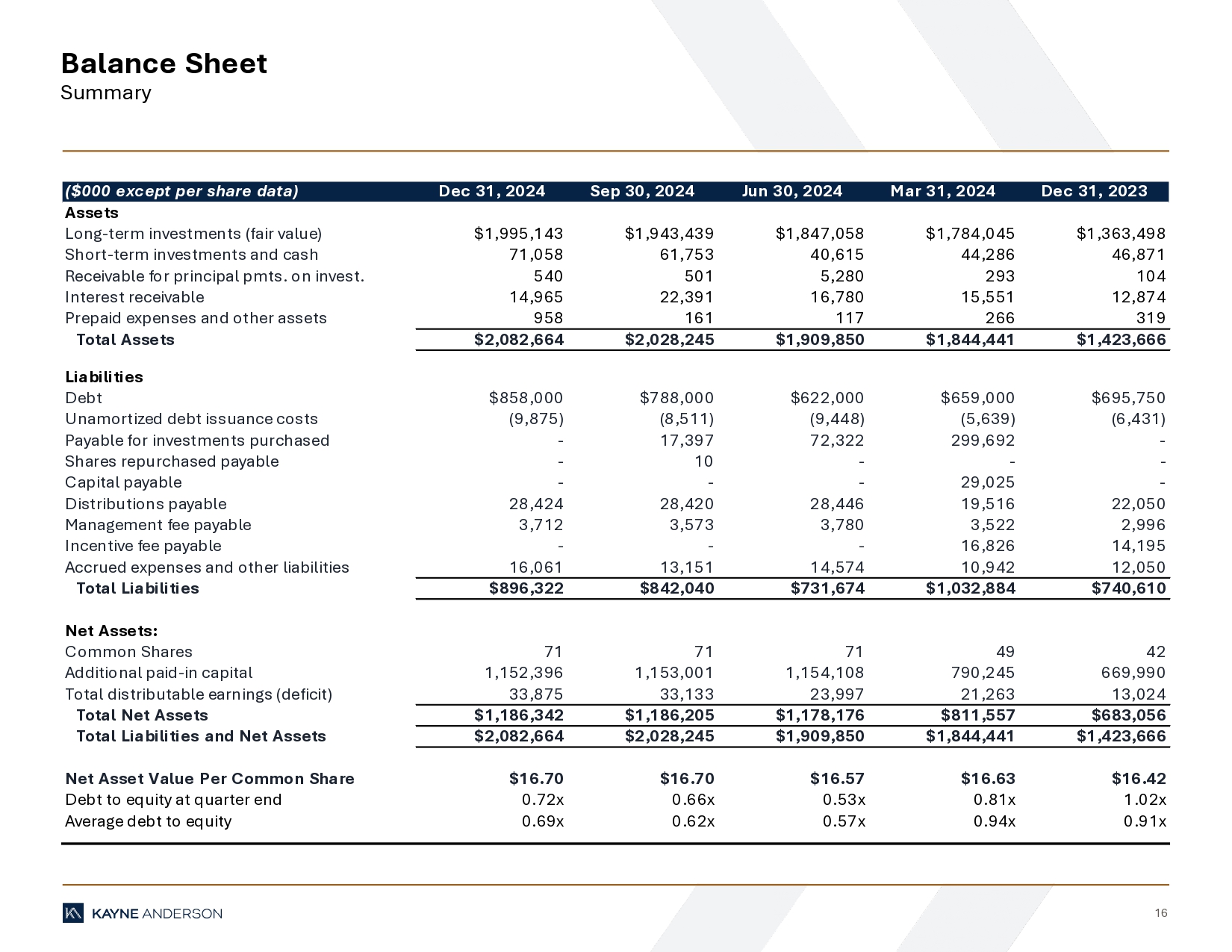 16 Balance Sheet Summary ($000 except per share data) Dec 31, 2024 Sep 30, 2024 Jun 30, 2024 Mar 31, 2024 Dec 31, 2023 Assets Long-term investments (fair value) $1,995,143 $1,943,439 $1,847,058 $1,784,045 $1,363,498 Short-term investments and cash 71,058 61,753 40,615 44,286 46,871 Receivable for principal pmts. on invest. 540 501 5,280 293 104 Interest receivable 14,965 22,391 16,780 15,551 12,874 Prepaid expenses and other assets 958 161 117 266 319 Total Assets $2,082,664 $2,028,245 $1,909,850 $1,844,441 $1,423,666 Liabilities Debt $858,000 $788,000 $622,000 $659,000 $695,750 Unamortized debt issuance costs (9,875) (8,511) (9,448) (5,639) (6,431) Payable for investments purchased - 17,397 72,322 299,692 - Shares repurchased payable - 10 - - - Capital payable - - - 29,025 - Distributions payable 28,424 28,420 28,446 19,516 22,050 Management fee payable 3,712 3,573 3,780 3,522 2,996 Incentive fee payable - - - 16,826 14,195 Accrued expenses and other liabilities 16,061 13,151 14,574 10,942 12,050 Total Liabilities $896,322 $842,040 $731,674 $1,032,884 $740,610 Net Assets: Common Shares 71 71 71 49 42 Additional paid-in capital 1,152,396 1,153,001 1,154,108 790,245 669,990 Total distributable earnings (deficit) 33,875 33,133 23,997 21,263 13,024 Total Net Assets $1,186,342 $1,186,205 $1,178,176 $811,557 $683,056 Total Liabilities and Net Assets $2,082,664 $2,028,245 $1,909,850 $1,844,441 $1,423,666 Net Asset Value Per Common Share $16.70 $16.70 $16.57 $16.63 $16.42 Debt to equity at quarter end 0.72x 0.66x 0.53x 0.81x 1.02x Average debt to equity 0.69x 0.62x 0.57x 0.94x 0.91x