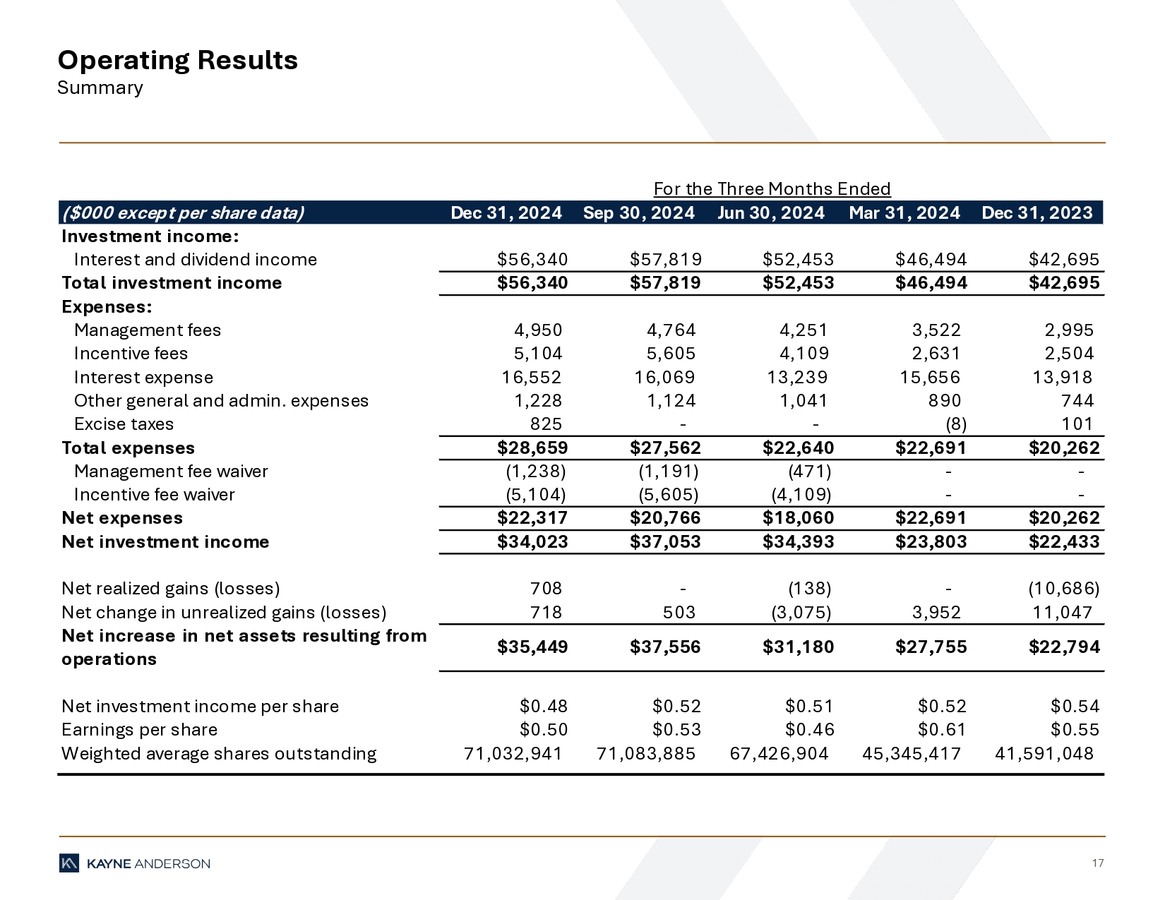 17 Operating Results Summary ($000 except per share data) Dec 31, 2024 Sep 30, 2024 Jun 30, 2024 Mar 31, 2024 Dec 31, 2023 Investment income: Interest and dividend income $56,340 $57,819 $52,453 $46,494 $42,695 Total investment income $56,340 $57,819 $52,453 $46,494 $42,695 Expenses: Management fees 4,950 4,764 4,251 3,522 2,995 Incentive fees 5,104 5,605 4,109 2,631 2,504 Interest expense 16,552 16,069 13,239 15,656 13,918 Other general and admin. expenses 1,228 1,124 1,041 890 744 Excise taxes 825 - - (8) 101 Total expenses $28,659 $27,562 $22,640 $22,691 $20,262 Management fee waiver (1,238) (1,191) (471) - - Incentive fee waiver (5,104) (5,605) (4,109) - - Net expenses $22,317 $20,766 $18,060 $22,691 $20,262 Net investment income $34,023 $37,053 $34,393 $23,803 $22,433 Net realized gains (losses) 708 - (138) - (10,686) Net change in unrealized gains (losses) 718 503 (3,075) 3,952 11,047 Net increase in net assets resulting from operations $35,449 $37,556 $31,180 $27,755 $22,794 Net investment income per share $0.48 $0.52 $0.51 $0.52 $0.54 Earnings per share $0.50 $0.53 $0.46 $0.61 $0.55 Weighted average shares outstanding 71,032,941 71,083,885 67,426,904 45,345,417 41,591,048 For the Three Months Ended