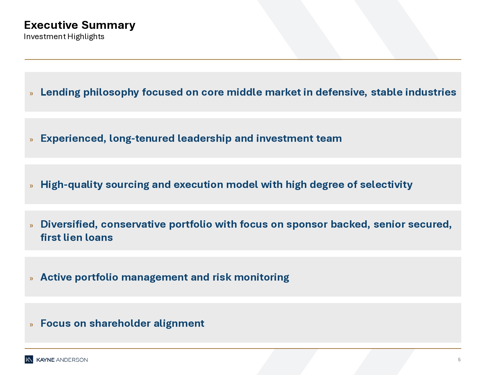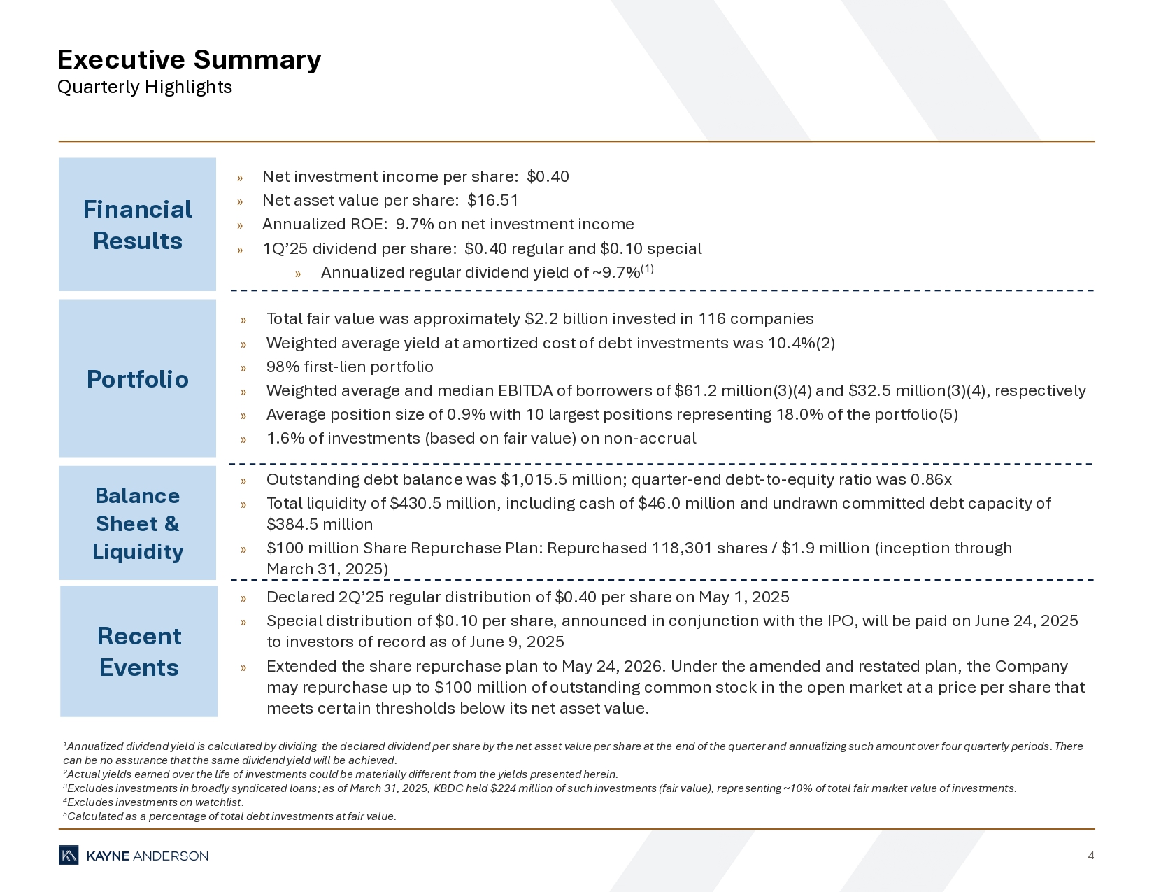 4 Executive Summary Quarterly Highlights 1 Annualized dividend yield is calculated by dividing the declared dividend per share by the net asset value per share at the end of the quarter and annualizing such amount over four quarterly periods. There can be no assurance that the same dividend yield will be achieved. 2 Actual yields earned over the life of investments could be materially different from the yields presented herein. 3 Excludes investments in broadly syndicated loans; as of March 31, 2025, KBDC held $224 million of such investments (fair value), repre se nting ~10% of total fair market value of investments. 4 Excludes investments on watchlist. 5 Calculated as a percentage of total debt investments at fair value. Financial Results Portfolio Balance Sheet & Liquidity Recent Events » Net investment income per share: $0.40 » Net asset value per share: $16.51 » Annualized ROE: 9.7% on net investment income » 1Q’25 dividend per share: $0.40 regular and $0.10 special » Annualized regular dividend yield of ~9.7% (1) » Total fair value was approximately $2.2 billion invested in 116 companies » Weighted average yield at amortized cost of debt investments was 10.4%(2) » 98% first - lien portfolio » Weighted average and median EBITDA of borrowers of $61.2 million(3)(4) and $32.5 million(3)(4), respectively » Average position size of 0.9% with 10 largest positions representing 18.0% of the portfolio(5) » 1.6% of investments (based on fair value) on non - accrual » Outstanding debt balance was $1,015.5 million; quarter - end debt - to - equity ratio was 0.86x » Total liquidity of $430.5 million, including cash of $46.0 million and undrawn committed debt capacity of $384.5 million » $100 million Share Repurchase Plan: Repurchased 118,301 shares / $1.9 million (inception through March 31, 2025) » Declared 2Q’25 regular distribution of $0.40 per share on May 1, 2025 » Special distribution of $0.10 per share, announced in conjunction with the IPO, will be paid on June 24, 2025 to investors of record as of June 9, 2025 » Extended the share repurchase plan to May 24, 2026. Under the amended and restated plan, the Company may repurchase up to $100 million of outstanding common stock in the open market at a price per share that meets certain thresholds below its net asset value.