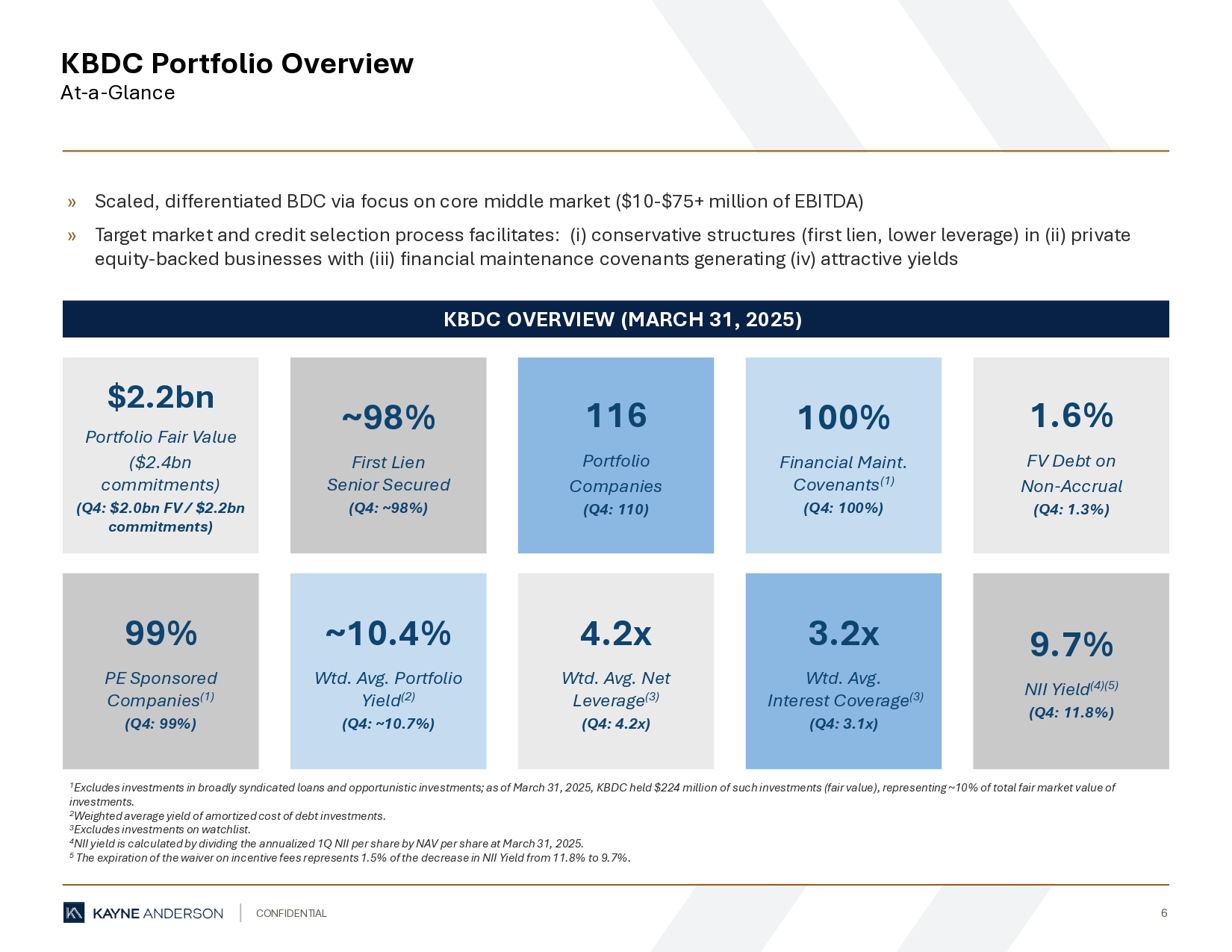 CONFIDENTIAL 6 » Scaled, differentiated BDC via focus on core middle market ($10 - $75+ million of EBITDA) » Target market and credit selection process facilitates: (i) conservative structures (first lien, lower leverage) in (ii) pri vat e equity - backed businesses with (iii) financial maintenance covenants generating (iv) attractive yields KBDC Portfolio Overview At - a - Glance 1 Excludes investments in broadly syndicated loans and opportunistic investments; as of March 31, 2025, KBDC held $224 million of such investments (fair value), representing ~10% of total fair market value of investments. 2 Weighted average yield of amortized cost of debt investments. 3 Excludes investments on watchlist. 4 NII yield is calculated by dividing the annualized 1Q NII per share by NAV per share at March 31, 2025. 5 T he expiration of the waiver on incentive fees represents 1.5% of the decrease in NII Yield from 11.8% to 9.7% . $2.2bn Portfolio Fair Value ($2.4bn commitments) (Q4: $2.0bn FV / $2.2bn commitments) 100% Financial Maint. Covenants (1) (Q4: 100%) ~98% First Lien Senior Secured (Q4: ~98%) 99% PE Sponsored Companies (1) (Q4: 99%) 116 Portfolio Companies (Q4: 110) 3.2x Wtd. Avg. Interest Coverage (3) (Q4: 3.1x) ~10.4% Wtd. Avg. Portfolio Yield (2) (Q4: ~10.7%) 4.2x Wtd. Avg. Net Leverage (3) (Q4: 4.2x) KBDC OVERVIEW (MARCH 31, 2025) 1.6% FV Debt on Non - Accrual (Q4: 1.3%) 9.7% NII Yield (4)(5) (Q4: 11.8%)