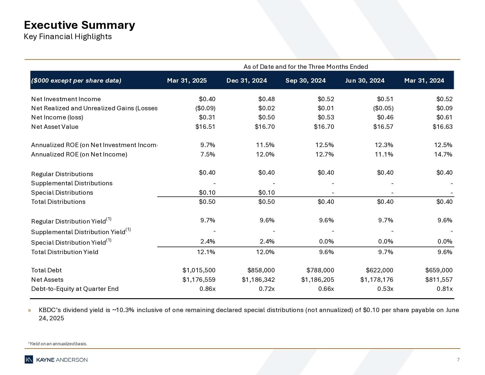7 Executive Summary Key Financial Highlights » KBDC’s dividend yield is ~ 10 . 3 % inclusive of one remaining declared special distributions (not annualized) of $ 0 . 10 per share payable on June 24 , 2025 1 Yield on an annualized basis. ($000 except per share data) Mar 31, 2025 Dec 31, 2024 Sep 30, 2024 Jun 30, 2024 Mar 31, 2024 Net Investment Income $0.40 $0.48 $0.52 $0.51 $0.52 Net Realized and Unrealized Gains (Losses) ($0.09) $0.02 $0.01 ($0.05) $0.09 Net Income (loss) $0.31 $0.50 $0.53 $0.46 $0.61 Net Asset Value $16.51 $16.70 $16.70 $16.57 $16.63 Annualized ROE (on Net Investment Income) 9.7% 11.5% 12.5% 12.3% 12.5% Annualized ROE (on Net Income) 7.5% 12.0% 12.7% 11.1% 14.7% Regular Distributions $0.40 $0.40 $0.40 $0.40 $0.40 Supplemental Distributions - - - - - Special Distributions $0.10 $0.10 - - - Total Distributions $0.50 $0.50 $0.40 $0.40 $0.40 Regular Distribution Yield (1) 9.7% 9.6% 9.6% 9.7% 9.6% Supplemental Distribution Yield (1) - - - - - Special Distribution Yield (1) 2.4% 2.4% 0.0% 0.0% 0.0% Total Distribution Yield 12.1% 12.0% 9.6% 9.7% 9.6% Total Debt $1,015,500 $858,000 $788,000 $622,000 $659,000 Net Assets $1,176,559 $1,186,342 $1,186,205 $1,178,176 $811,557 Debt-to-Equity at Quarter End 0.86x 0.72x 0.66x 0.53x 0.81x As of Date and for the Three Months Ended