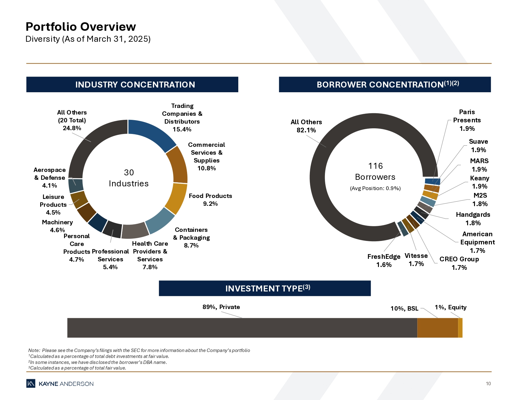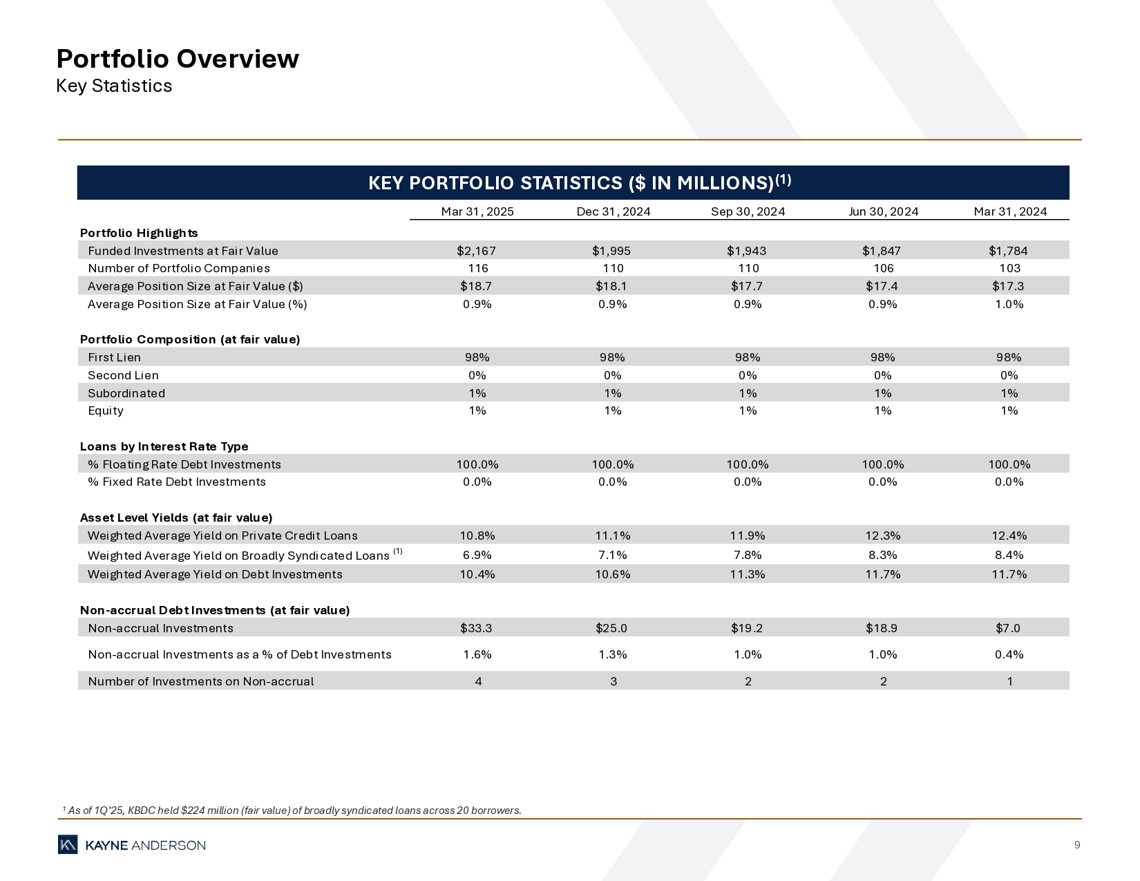 9 Portfolio Overview Key Statistics 1 As of 1Q’25, KBDC held $224 million (fair value) of broadly syndicated loans across 20 borrowers. KEY PORTFOLIO STATISTICS ($ IN MILLIONS) (1) Mar 31, 2025 Dec 31, 2024 Sep 30, 2024 Jun 30, 2024 Mar 31, 2024 Portfolio Highlights Funded Investments at Fair Value $2,167 $1,995 $1,943 $1,847 $1,784 Number of Portfolio Companies 116 110 110 106 103 Average Position Size at Fair Value ($) $18.7 $18.1 $17.7 $17.4 $17.3 Average Position Size at Fair Value (%) 0.9% 0.9% 0.9% 0.9% 1.0% Portfolio Composition (at fair value) First Lien 98% 98% 98% 98% 98% Second Lien 0% 0% 0% 0% 0% Subordinated 1% 1% 1% 1% 1% Equity 1% 1% 1% 1% 1% Loans by Interest Rate Type % Floating Rate Debt Investments 100.0% 100.0% 100.0% 100.0% 100.0% % Fixed Rate Debt Investments 0.0% 0.0% 0.0% 0.0% 0.0% Asset Level Yields (at fair value) Weighted Average Yield on Private Credit Loans 10.8% 11.1% 11.9% 12.3% 12.4% Weighted Average Yield on Broadly Syndicated Loans (1) 6.9% 7.1% 7.8% 8.3% 8.4% Weighted Average Yield on Debt Investments 10.4% 10.6% 11.3% 11.7% 11.7% Non-accrual Debt Investments (at fair value) Non-accrual Investments $33.3 $25.0 $19.2 $18.9 $7.0 Non-accrual Investments as a % of Debt Investments 1.6% 1.3% 1.0% 1.0% 0.4% Number of Investments on Non-accrual 4 3 2 2 1