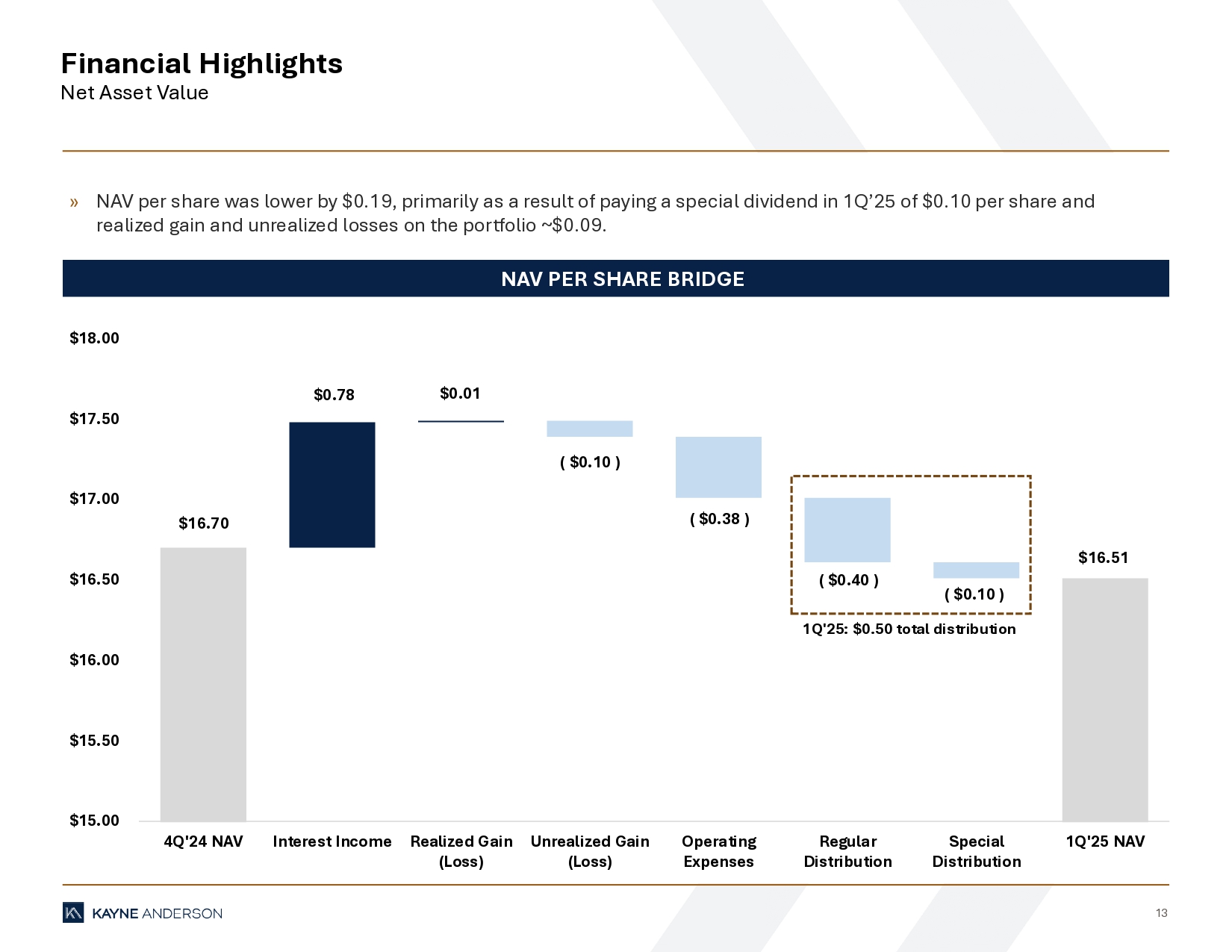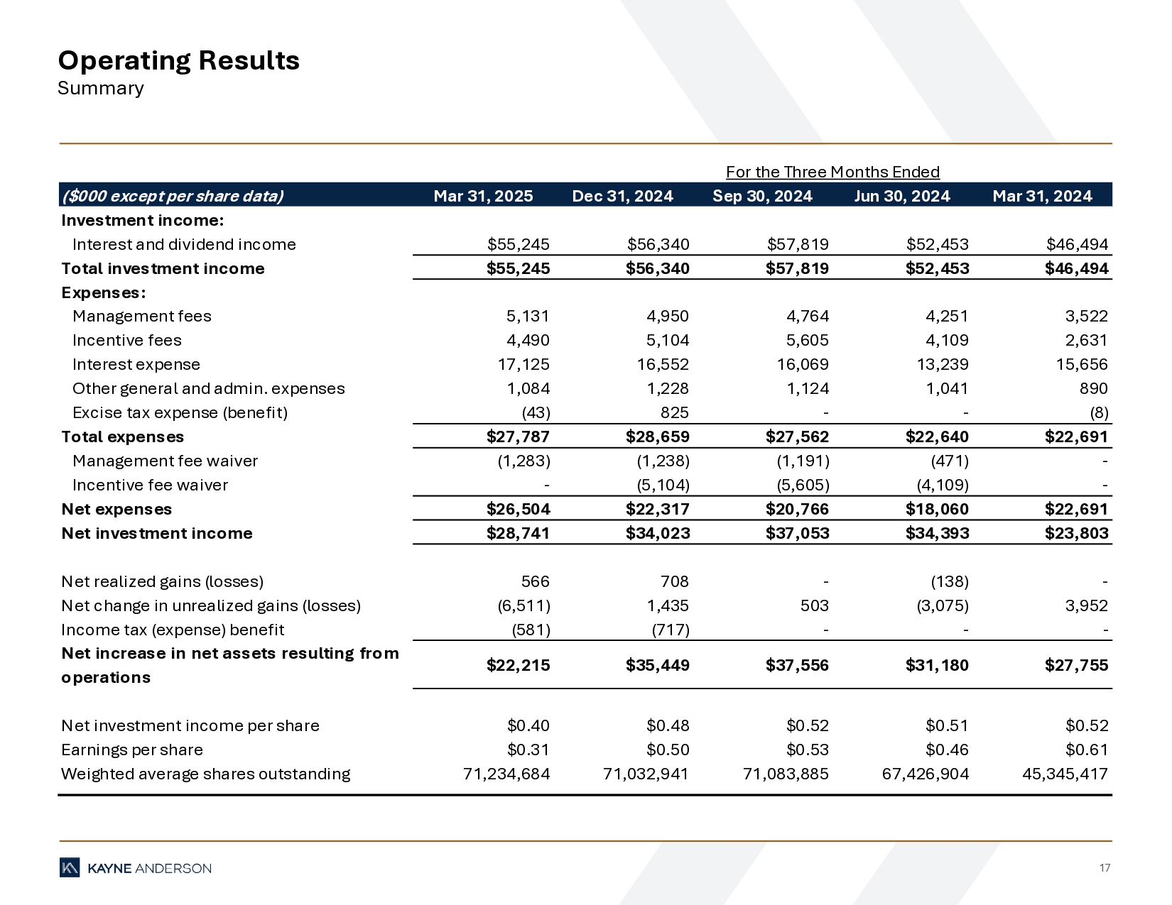 17 Operating Results Summary ($000 except per share data) Mar 31, 2025 Dec 31, 2024 Sep 30, 2024 Jun 30, 2024 Mar 31, 2024 Investment income: Interest and dividend income $55,245 $56,340 $57,819 $52,453 $46,494 Total investment income $55,245 $56,340 $57,819 $52,453 $46,494 Expenses: Management fees 5,131 4,950 4,764 4,251 3,522 Incentive fees 4,490 5,104 5,605 4,109 2,631 Interest expense 17,125 16,552 16,069 13,239 15,656 Other general and admin. expenses 1,084 1,228 1,124 1,041 890 Excise tax expense (benefit) (43) 825 - - (8) Total expenses $27,787 $28,659 $27,562 $22,640 $22,691 Management fee waiver (1,283) (1,238) (1,191) (471) - Incentive fee waiver - (5,104) (5,605) (4,109) - Net expenses $26,504 $22,317 $20,766 $18,060 $22,691 Net investment income $28,741 $34,023 $37,053 $34,393 $23,803 Net realized gains (losses) 566 708 - (138) - Net change in unrealized gains (losses) (6,511) 1,435 503 (3,075) 3,952 Income tax (expense) benefit (581) (717) - - - Net increase in net assets resulting from operations $22,215 $35,449 $37,556 $31,180 $27,755 Net investment income per share $0.40 $0.48 $0.52 $0.51 $0.52 Earnings per share $0.31 $0.50 $0.53 $0.46 $0.61 Weighted average shares outstanding 71,234,684 71,032,941 71,083,885 67,426,904 45,345,417 For the Three Months Ended