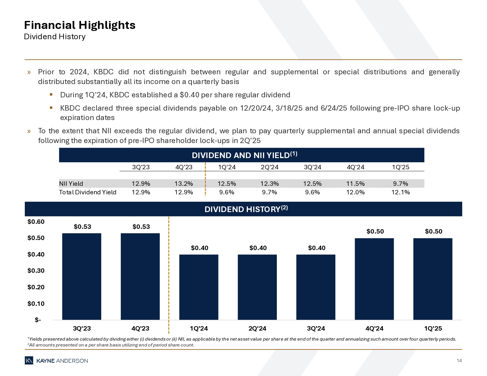 14 Financial Highlights Dividend History 1 Yields presented above calculated by dividing either (i) dividends or (ii) NII, as applicable by the net asset value per shar e a t the end of the quarter and annualizing such amount over four quarterly periods. 2 All amounts presented on a per share basis utilizing end of period share count. DIVIDEND HISTORY (2) DIVIDEND AND NII YIELD (1) » Prior to 2024 , KBDC did not distinguish between regular and supplemental or special distributions and generally distributed substantially all its income on a quarterly basis ▪ During 1 Q’ 24 , KBDC established a $ 0 . 40 per share regular dividend ▪ KBDC declared three special dividends payable on 12 / 20 / 24 , 3 / 18 / 25 and 6 / 24 / 25 following pre - IPO share lock - up expiration dates » To the extent that NII exceeds the regular dividend, we plan to pay quarterly supplemental and annual special dividends following the expiration of pre - IPO shareholder lock - ups in 2 Q’ 25 $0.53 $0.53 $0.40 $0.40 $0.40 $0.50 $0.50 $- $0.10 $0.20 $0.30 $0.40 $0.50 $0.60 3Q'23 4Q'23 1Q'24 2Q'24 3Q'24 4Q'24 1Q'25 1Q'25 4Q'24 3Q'24 2Q'24 1Q'24 4Q'23 3Q'23 9.7% 11.5% 12.5% 12.3% 12.5% 13.2% 12.9% NII Yield 12.1% 12.0% 9.6% 9.7% 9.6% 12.9% 12.9% Total Dividend Yield