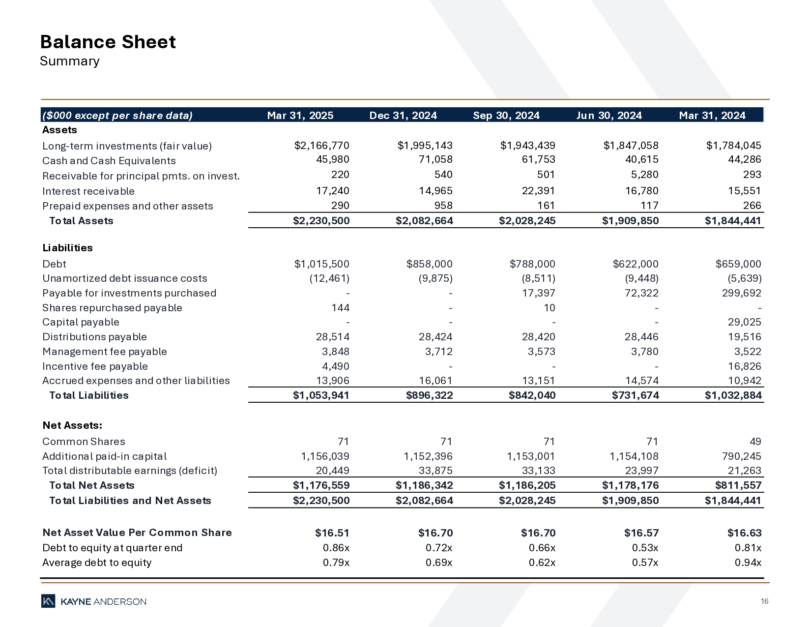 16 Balance Sheet Summary ($000 except per share data) Mar 31, 2025 Dec 31, 2024 Sep 30, 2024 Jun 30, 2024 Mar 31, 2024 Assets Long-term investments (fair value) $2,166,770 $1,995,143 $1,943,439 $1,847,058 $1,784,045 Cash and Cash Equivalents 45,980 71,058 61,753 40,615 44,286 Receivable for principal pmts. on invest. 220 540 501 5,280 293 Interest receivable 17,240 14,965 22,391 16,780 15,551 Prepaid expenses and other assets 290 958 161 117 266 Total Assets $2,230,500 $2,082,664 $2,028,245 $1,909,850 $1,844,441 Liabilities Debt $1,015,500 $858,000 $788,000 $622,000 $659,000 Unamortized debt issuance costs (12,461) (9,875) (8,511) (9,448) (5,639) Payable for investments purchased - - 17,397 72,322 299,692 Shares repurchased payable 144 - 10 - - Capital payable - - - - 29,025 Distributions payable 28,514 28,424 28,420 28,446 19,516 Management fee payable 3,848 3,712 3,573 3,780 3,522 Incentive fee payable 4,490 - - - 16,826 Accrued expenses and other liabilities 13,906 16,061 13,151 14,574 10,942 Total Liabilities $1,053,941 $896,322 $842,040 $731,674 $1,032,884 Net Assets: Common Shares 71 71 71 71 49 Additional paid-in capital 1,156,039 1,152,396 1,153,001 1,154,108 790,245 Total distributable earnings (deficit) 20,449 33,875 33,133 23,997 21,263 Total Net Assets $1,176,559 $1,186,342 $1,186,205 $1,178,176 $811,557 Total Liabilities and Net Assets $2,230,500 $2,082,664 $2,028,245 $1,909,850 $1,844,441 Net Asset Value Per Common Share $16.51 $16.70 $16.70 $16.57 $16.63 Debt to equity at quarter end 0.86x 0.72x 0.66x 0.53x 0.81x Average debt to equity 0.79x 0.69x 0.62x 0.57x 0.94x
