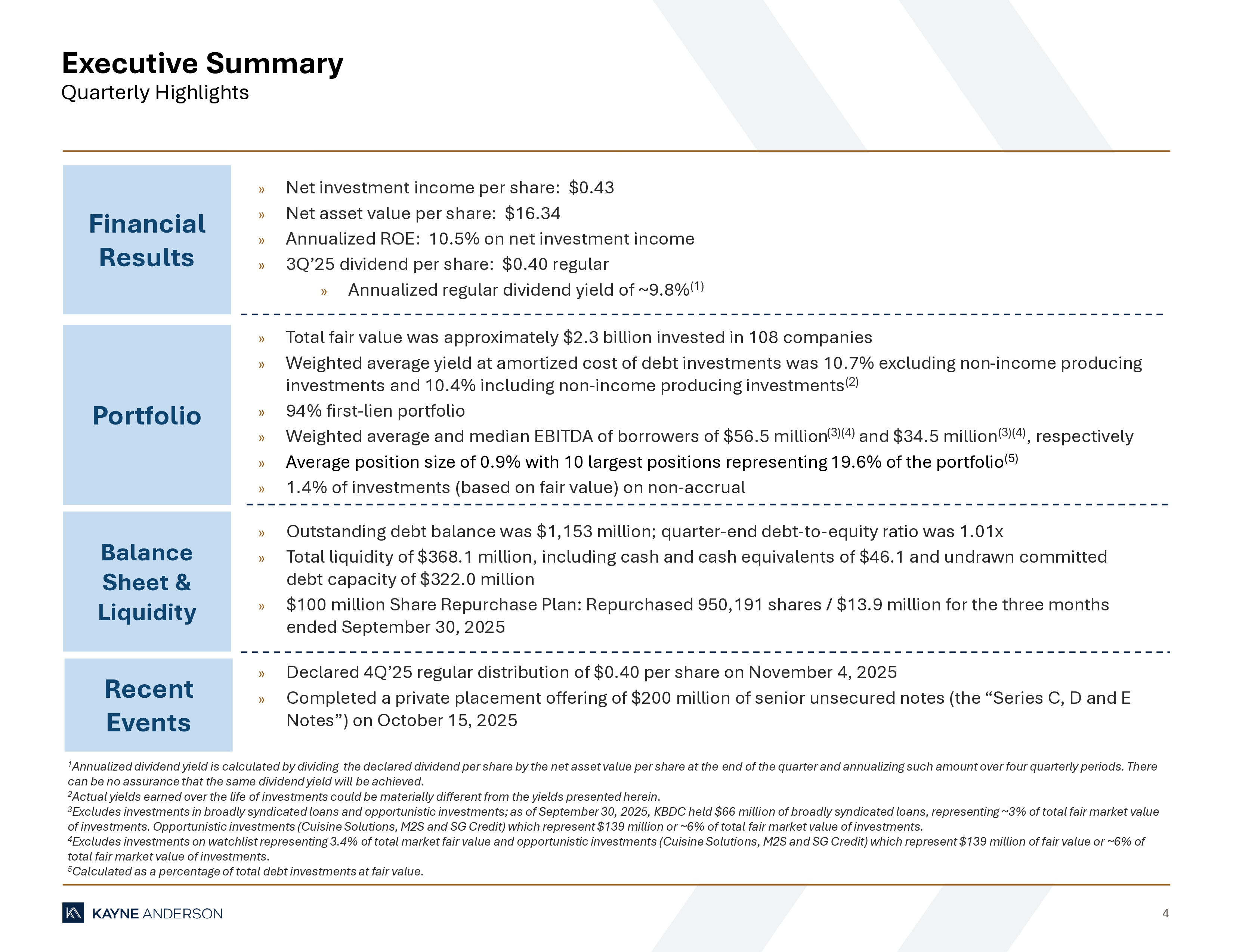 4 Executive Summary Quarterly Highlights 1 Annualized dividend yield is calculated by dividing the declared dividend per share by the net asset value per share at the end of the quarter and annualizing such amount over four quarterly periods. There can be no assurance that the same dividend yield will be achieved. 2 Actual yields earned over the life of investments could be materially different from the yields presented herein. 3 Excludes investments in broadly syndicated loans and opportunistic investments; as of September 30, 2025, KBDC held $66 milli on of broadly syndicated loans, representing ~3% of total fair market value of investments. Opportunistic investments (Cuisine Solutions, M2S and SG Credit) which represent $139 million or ~6% of total fa ir market value of investments. 4 Excludes investments on watchlist representing 3.4% of total market fair value and opportunistic investments (Cuisine Solutio ns, M2S and SG Credit) which represent $139 million of fair value or ~6% of total fair market value of investments. 5 Calculated as a percentage of total debt investments at fair value. Financial Results Portfolio Balance Sheet & Liquidity Recent Events » Net investment income per share: $0.43 » Net asset value per share: $16.34 » Annualized ROE: 10.5% on net investment income » 3Q’25 dividend per share: $0.40 regular » Annualized regular dividend yield of ~9.8% (1) » Total fair value was approximately $2.3 billion invested in 108 companies » Weighted average yield at amortized cost of debt investments was 10.7% excluding non - income producing investments and 10.4% including non - income producing investments (2) » 94% first - lien portfolio » Weighted average and median EBITDA of borrowers of $56.5 million (3)(4) and $34.5 million (3)(4) , respectively » Average position size of 0.9% with 10 largest positions representing 19.6% of the portfolio (5) » 1.4% of investments (based on fair value) on non - accrual » Outstanding debt balance was $1,153 million; quarter - end debt - to - equity ratio was 1.01x » Total liquidity of $368.1 million, including cash and cash equivalents of $46.1 and undrawn committed debt capacity of $322.0 million » $100 million Share Repurchase Plan: Repurchased 950,191 shares / $13.9 million for the three months ended September 30, 2025 » Declared 4Q’25 regular distribution of $0.40 per share on November 4, 2025 » Completed a private placement offering of $200 million of senior unsecured notes (the “Series C, D and E Notes”) on October 15, 2025