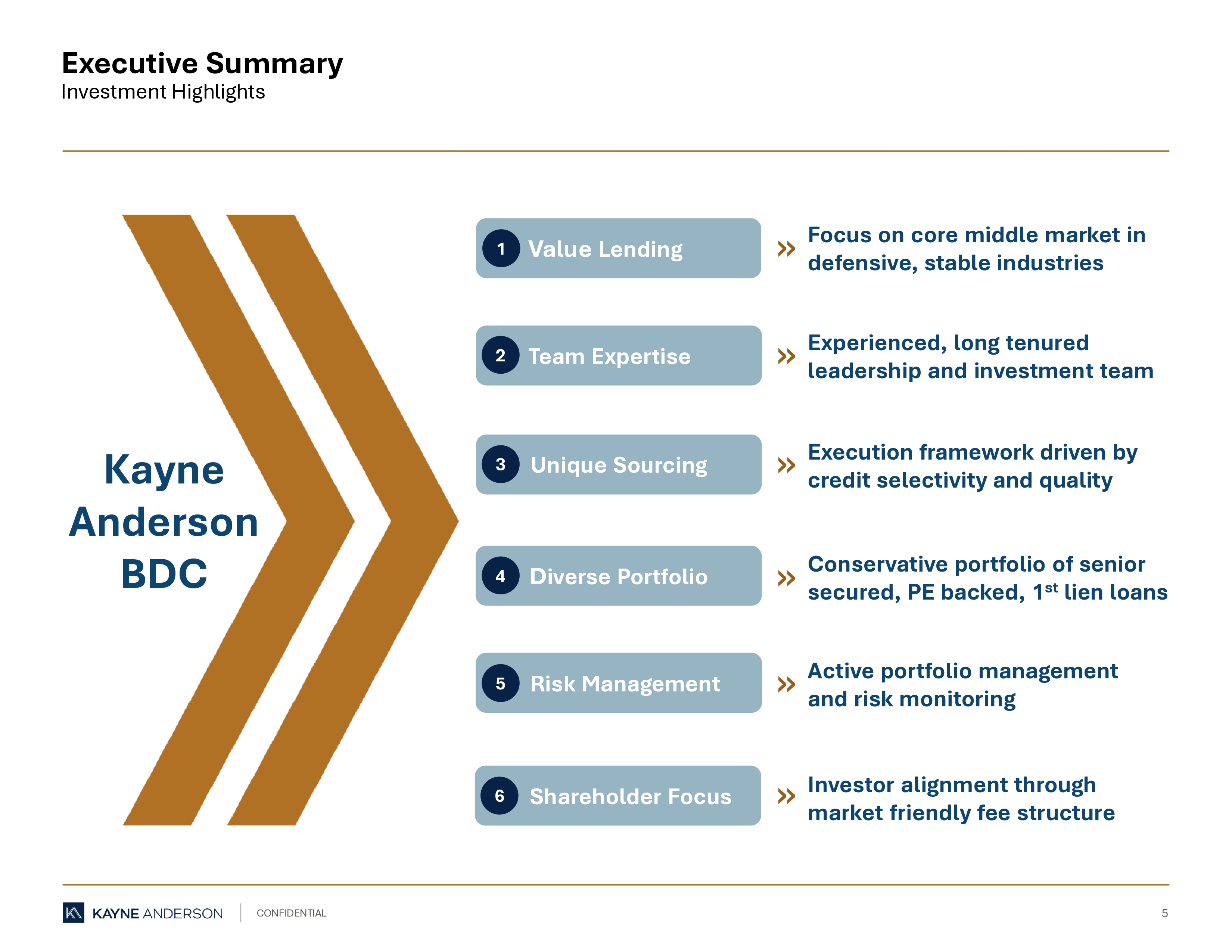 5 CONFIDENTIAL 5 Team Expertise Unique Sourcing D iverse Portfolio Risk Management Shareholder Focus Executive Summary Investment Highlights Kayne Anderson BDC 2 3 4 5 6 Focus on core middle market in defensive, stable industries Experienced, long tenured leadership and investment team Execution framework driven by credit selectivity and quality Conservative portfolio of senior secured, PE backed, 1 st lien loans Active portfolio management and risk monitoring Investor alignment through market friendly fee structure » » » » » » » Value Lending 1