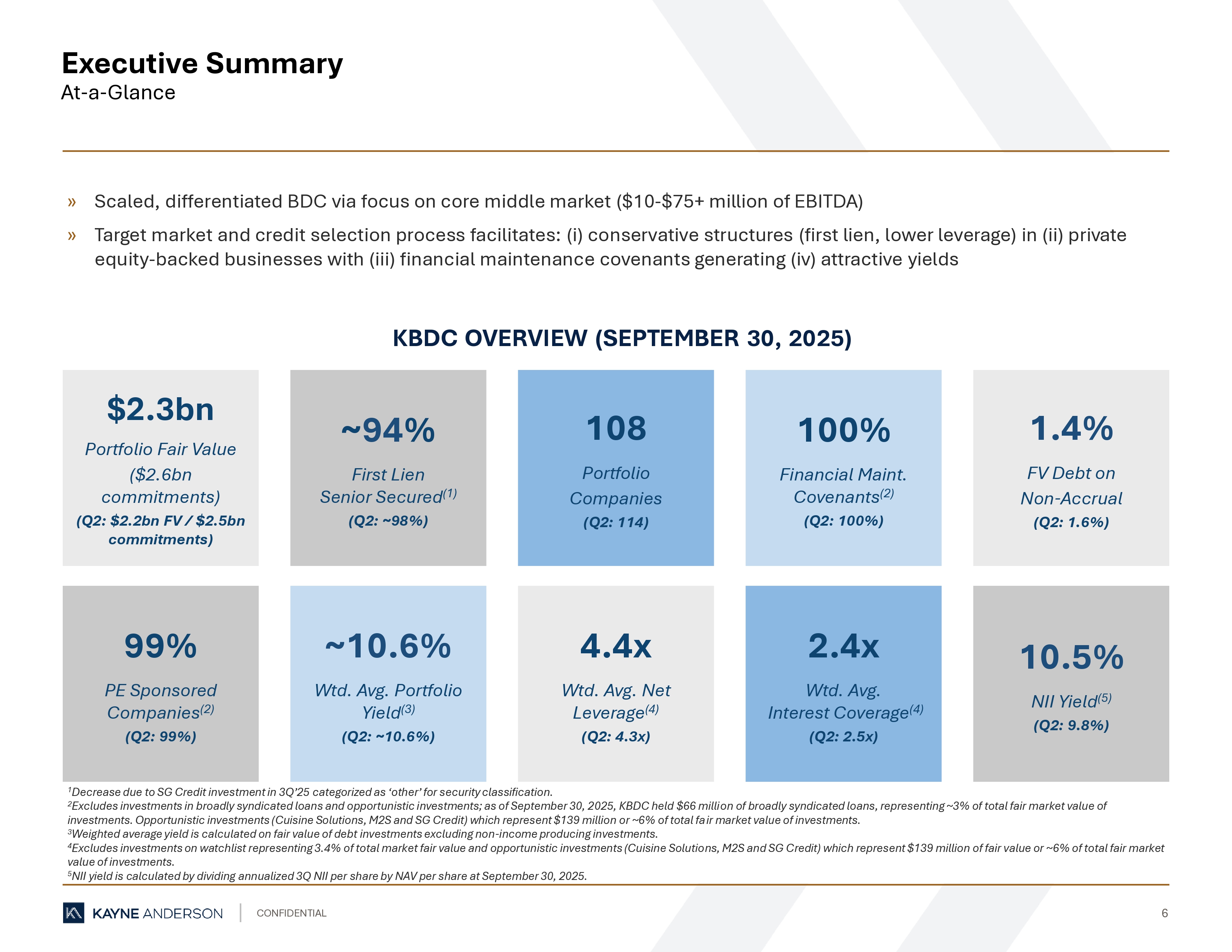 CONFIDENTIAL 6 » Scaled, differentiated BDC via focus on core middle market ($10 - $75+ million of EBITDA) » Target market and credit selection process facilitates: (i) conservative structures (first lien, lower leverage) in (ii) priv ate equity - backed businesses with (iii) financial maintenance covenants generating (iv) attractive yields Executive Summary At - a - Glance 1 Decrease due to SG Credit investment in 3Q’25 categorized as ‘other’ for security classification. 2 Excludes investments in broadly syndicated loans and opportunistic investments; as of September 30, 2025, KBDC held $66 milli on of broadly syndicated loans, representing ~3% of total fair market value of investments. Opportunistic investments (Cuisine Solutions, M2S and SG Credit) which represent $139 million or ~6% of total fa ir market value of investments. 3 Weighted average yield is calculated on fair value of debt investments excluding non - income producing investments. 4 Excludes investments on watchlist representing 3.4% of total market fair value and opportunistic investments (Cuisine Solutio ns, M2S and SG Credit) which represent $139 million of fair value or ~6% of total fair market value of investments. 5 NII yield is calculated by dividing annualized 3Q NII per share by NAV per share at September 30, 2025. KBDC OVERVIEW (SEPTEMBER 30, 2025) $2.3bn Portfolio Fair Value ($2.6bn commitments) (Q2: $2.2bn FV / $2.5bn commitments) 100% Financial Maint. Covenants (2) (Q2: 100%) ~ 94 % First Lien Senior Secured (1) (Q2: ~98%) 99% PE Sponsored Companies (2) (Q2: 99%) 108 Portfolio Companies (Q2: 114) 2.4x Wtd. Avg. Interest Coverage (4) (Q2: 2.5x) ~10.6% Wtd. Avg. Portfolio Yield (3) (Q2: ~10.6%) 4.4x Wtd. Avg. Net Leverage (4) (Q2: 4.3x) 1.4% FV Debt on Non - Accrual (Q2: 1.6%) 10.5% NII Yield (5) (Q2: 9.8%)