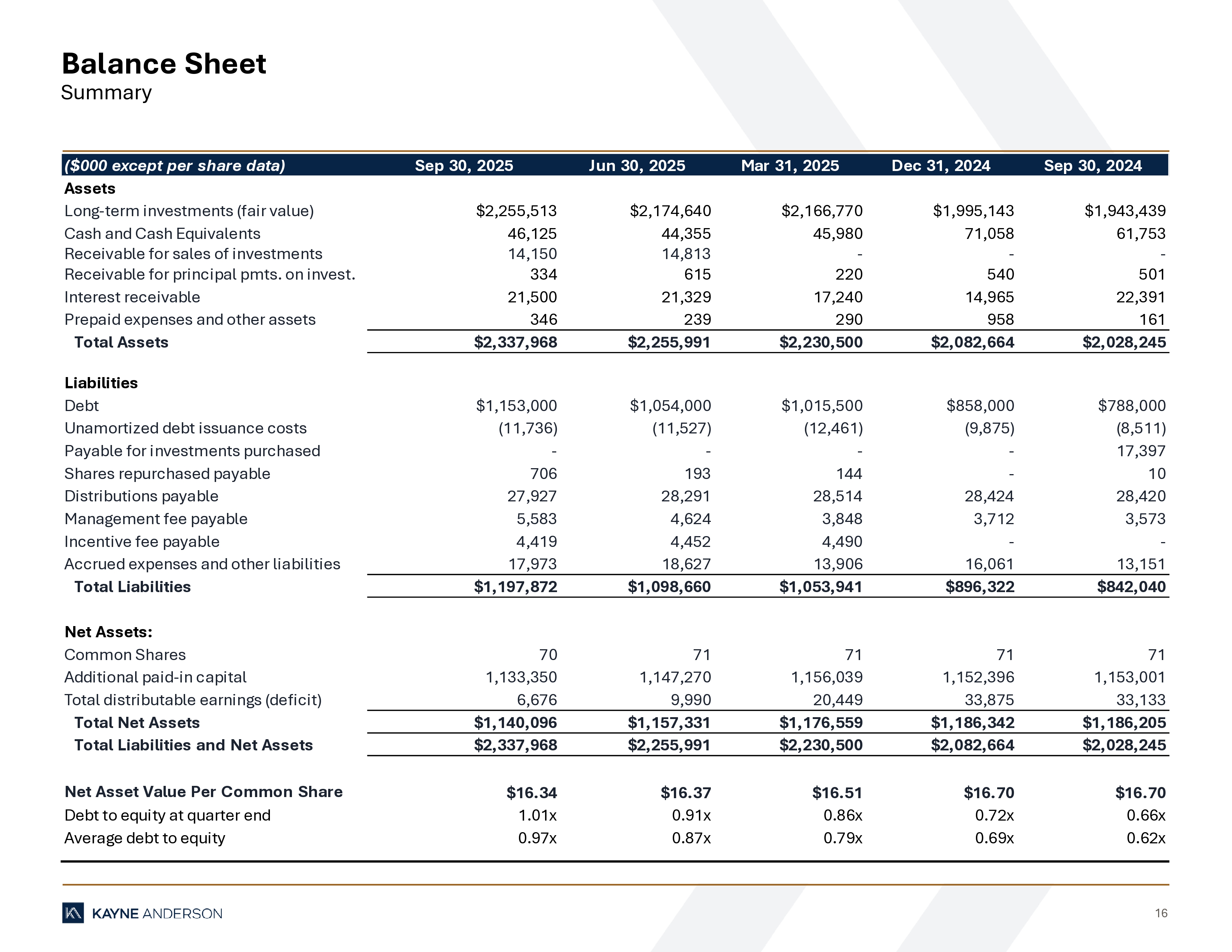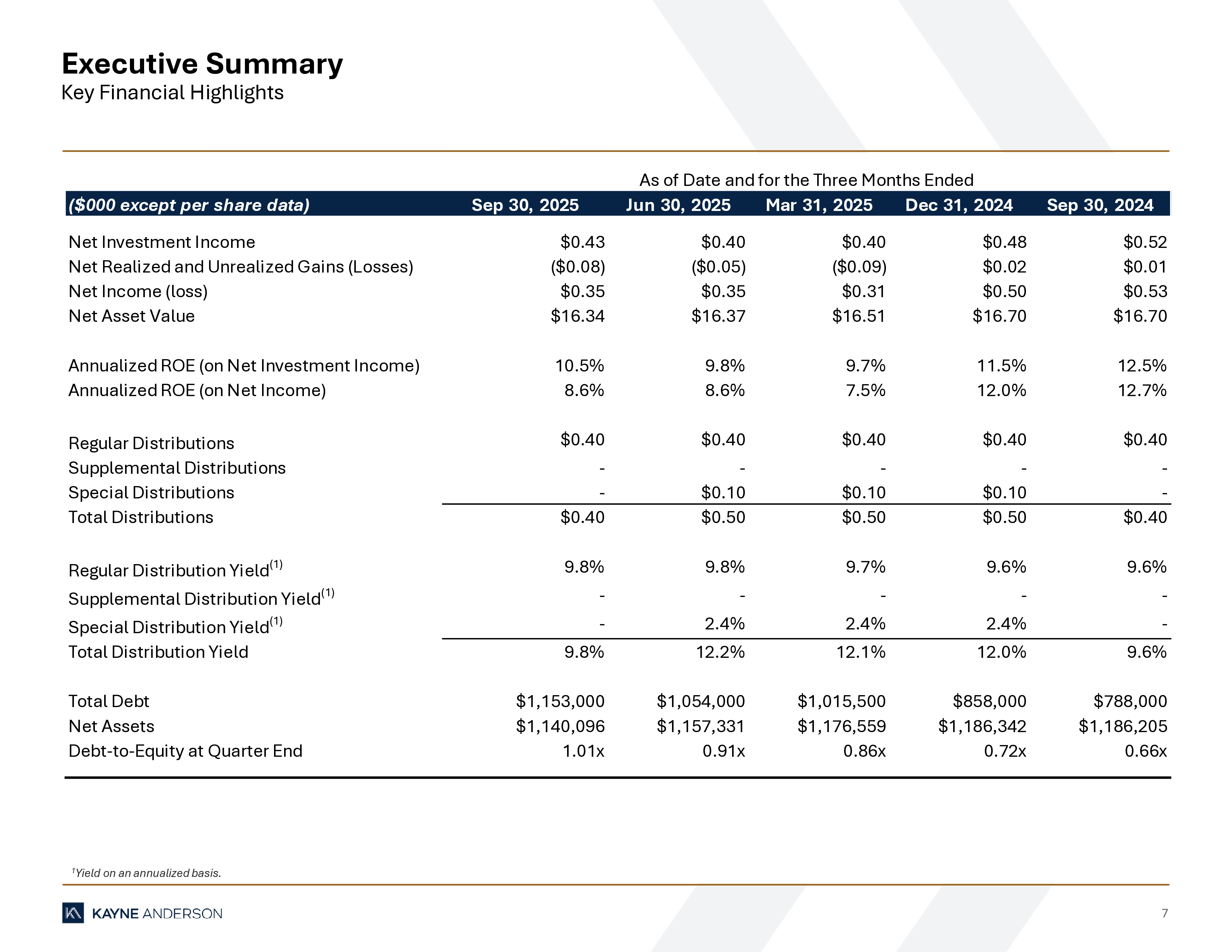 7 Executive Summary Key Financial Highlights 1 Yield on an annualized basis. ($000 except per share data) Sep 30, 2025 Jun 30, 2025 Mar 31, 2025 Dec 31, 2024 Sep 30, 2024 Net Investment Income $0.43 $0.40 $0.40 $0.48 $0.52 Net Realized and Unrealized Gains (Losses) ($0.08) ($0.05) ($0.09) $0.02 $0.01 Net Income (loss) $0.35 $0.35 $0.31 $0.50 $0.53 Net Asset Value $16.34 $16.37 $16.51 $16.70 $16.70 Annualized ROE (on Net Investment Income) 10.5% 9.8% 9.7% 11.5% 12.5% Annualized ROE (on Net Income) 8.6% 8.6% 7.5% 12.0% 12.7% Regular Distributions $0.40 $0.40 $0.40 $0.40 $0.40 Supplemental Distributions - - - - - Special Distributions - $0.10 $0.10 $0.10 - Total Distributions $0.40 $0.50 $0.50 $0.50 $0.40 Regular Distribution Yield (1) 9.8% 9.8% 9.7% 9.6% 9.6% Supplemental Distribution Yield (1) - - - - - Special Distribution Yield (1) - 2.4% 2.4% 2.4% - Total Distribution Yield 9.8% 12.2% 12.1% 12.0% 9.6% Total Debt $1,153,000 $1,054,000 $1,015,500 $858,000 $788,000 Net Assets $1,140,096 $1,157,331 $1,176,559 $1,186,342 $1,186,205 Debt-to-Equity at Quarter End 1.01x 0.91x 0.86x 0.72x 0.66x As of Date and for the Three Months Ended
