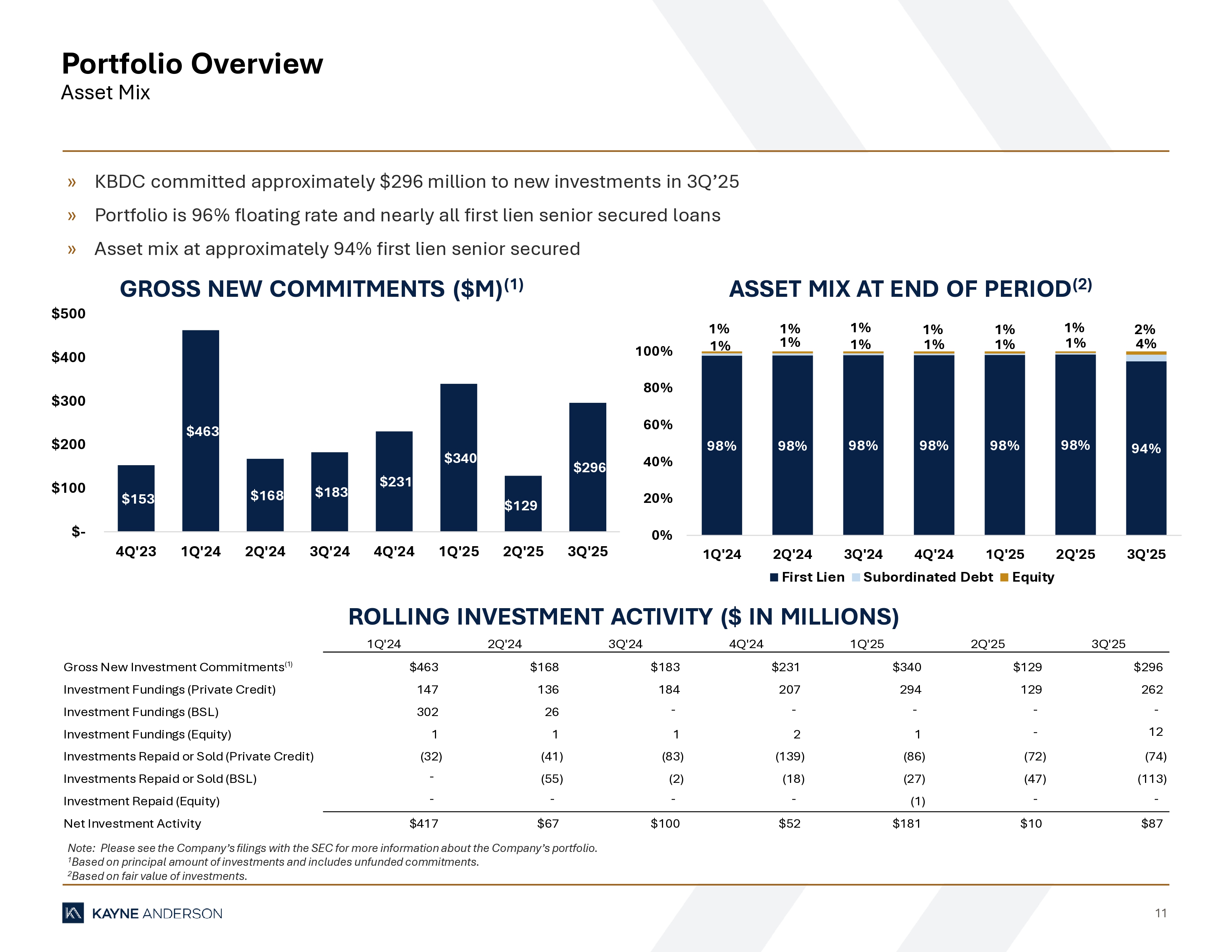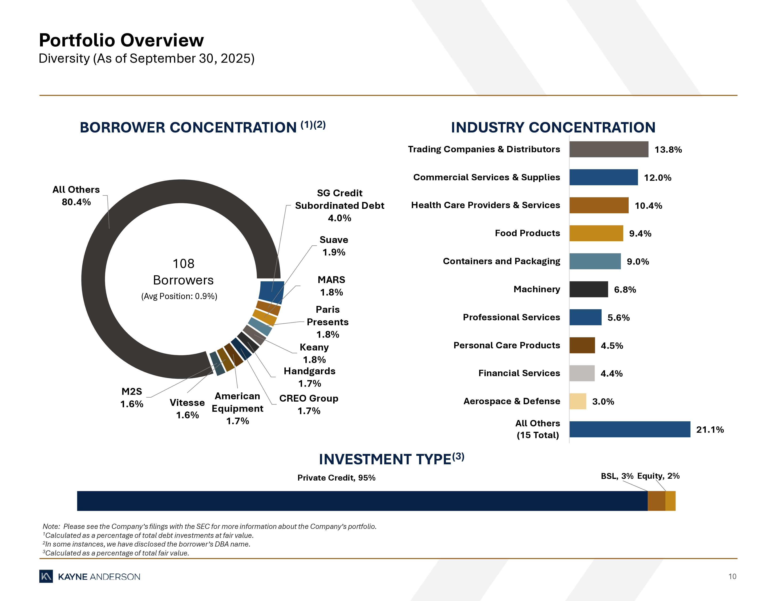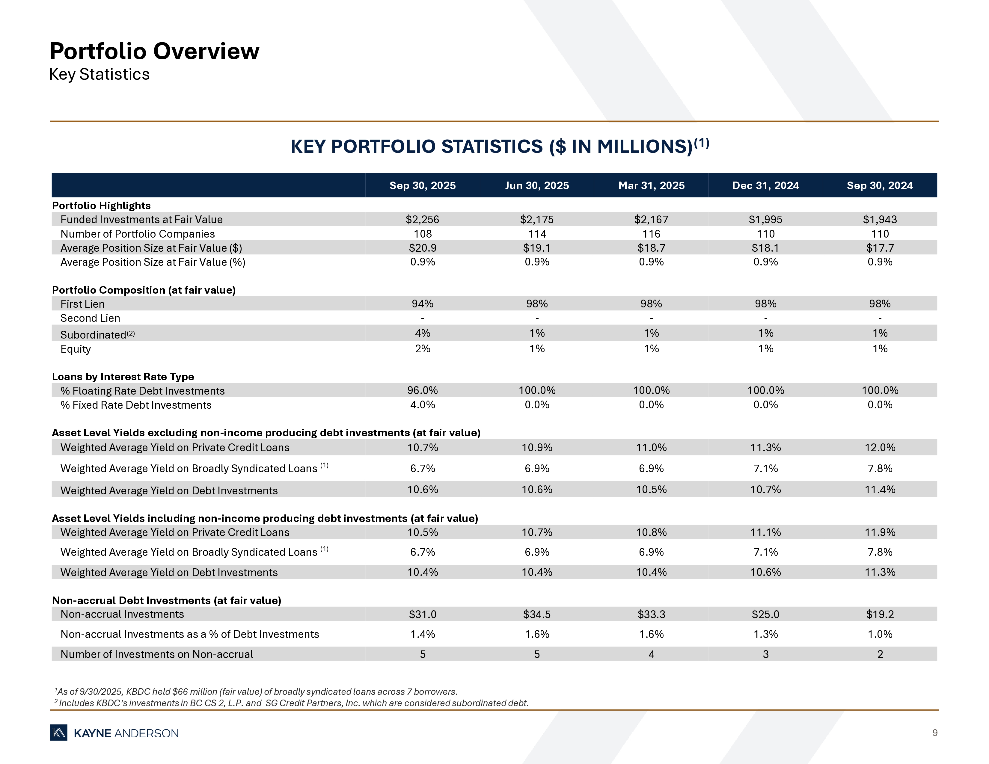9 Portfolio Overview Key Statistics 1 As of 9/30/2025, KBDC held $66 million (fair value) of broadly syndicated loans across 7 borrowers. 2 Includes KBDC’s investments in BC CS 2, L.P. and SG Credit Partners, Inc. which are considered subordinated debt. KEY PORTFOLIO STATISTICS ($ IN MILLIONS) (1) Sep 30, 2024 Dec 31, 2024 Mar 31, 2025 Jun 30, 2025 Sep 30, 2025 Portfolio Highlights $1,943 $1,995 $2,167 $2,175 $2,256 Funded Investments at Fair Value 110 110 116 114 108 Number of Portfolio Companies $17.7 $18.1 $18.7 $19.1 $20.9 Average Position Size at Fair Value ($) 0.9% 0.9% 0.9% 0.9% 0.9% Average Position Size at Fair Value (%) Portfolio Composition (at fair value) 98% 98% 98% 98% 94% First Lien - - - - - Second Lien 1% 1% 1% 1% 4% Subordinated (2) 1% 1% 1% 1% 2% Equity Loans by Interest Rate Type 100.0% 100.0% 100.0% 100.0% 96.0% % Floating Rate Debt Investments 0.0% 0.0% 0.0% 0.0% 4.0% % Fixed Rate Debt Investments Asset Level Yields excluding non - income producing debt investments (at fair value) 12.0% 11.3% 11.0% 10.9% 10.7% Weighted Average Yield on Private Credit Loans 7.8% 7.1% 6.9% 6.9% 6.7% Weighted Average Yield on Broadly Syndicated Loans (1) 11.4% 10.7% 10.5% 10.6% 10.6% Weighted Average Yield on Debt Investments Asset Level Yields including non - income producing debt investments (at fair value) 11.9% 11.1% 10.8% 10.7% 10.5% Weighted Average Yield on Private Credit Loans 7.8% 7.1% 6.9% 6.9% 6.7% Weighted Average Yield on Broadly Syndicated Loans (1) 11.3% 10.6% 10.4% 10.4% 10.4% Weighted Average Yield on Debt Investments Non - accrual Debt Investments (at fair value) $19.2 $25.0 $33.3 $34.5 $31.0 Non - accrual Investments 1.0% 1.3% 1.6% 1.6% 1.4% Non - accrual Investments as a % of Debt Investments 2 3 4 5 5 Number of Investments on Non - accrual