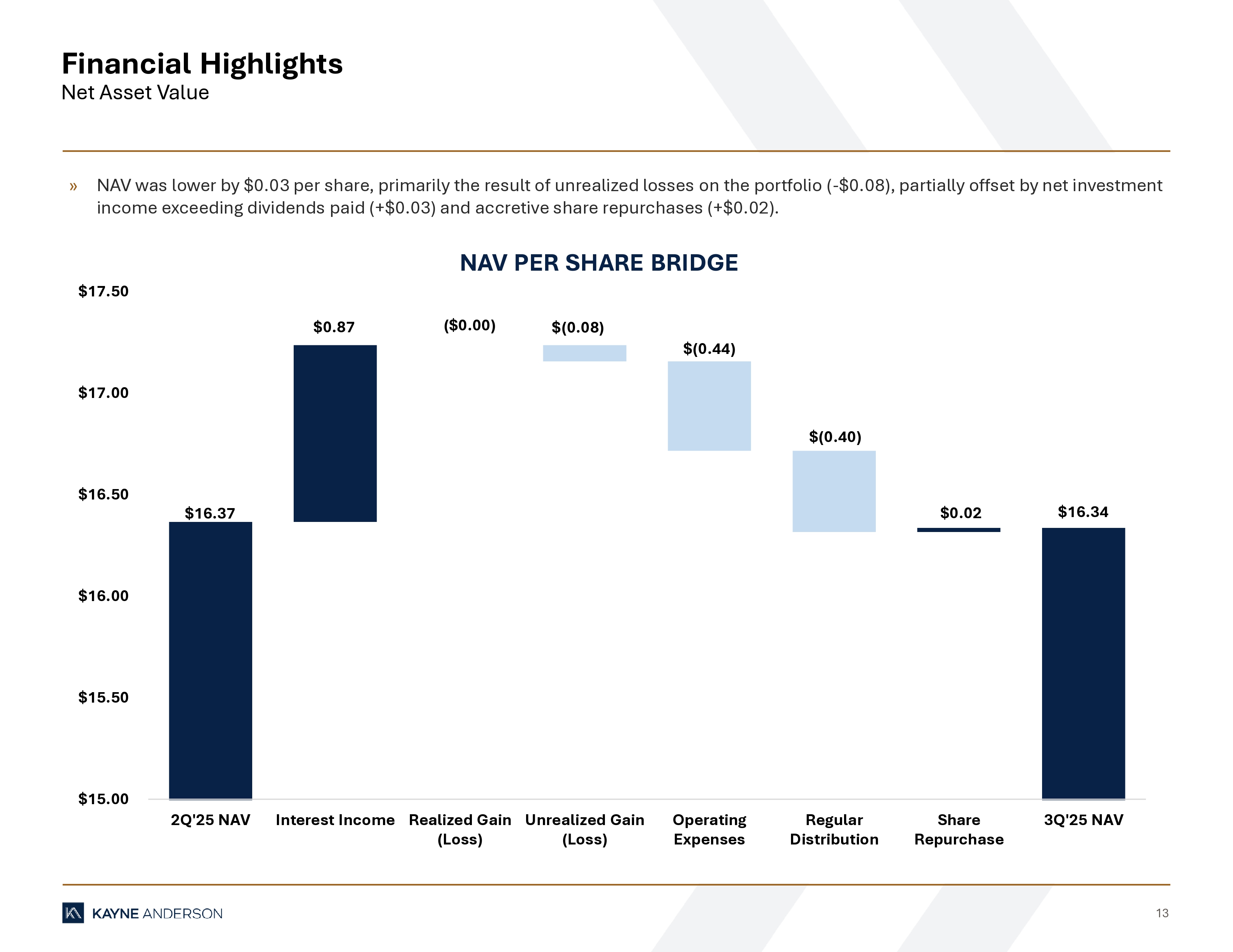 13 Financial Highlights Net Asset Value NAV PER SHARE BRIDGE » NAV was lower by $0.03 per share, primarily the result of unrealized losses on the portfolio ( - $0.08), partially offset by net i nvestment income exceeding dividends paid (+$0.03) and accretive share repurchases (+$0.02). $16.37 $0.87 ($0.00) $(0.08) $(0.44) $(0.40) $0.02 $16.34 $15.00 $15.50 $16.00 $16.50 $17.00 $17.50 2Q'25 NAV Interest Income Realized Gain (Loss) Unrealized Gain (Loss) Operating Expenses Regular Distribution Share Repurchase 3Q'25 NAV