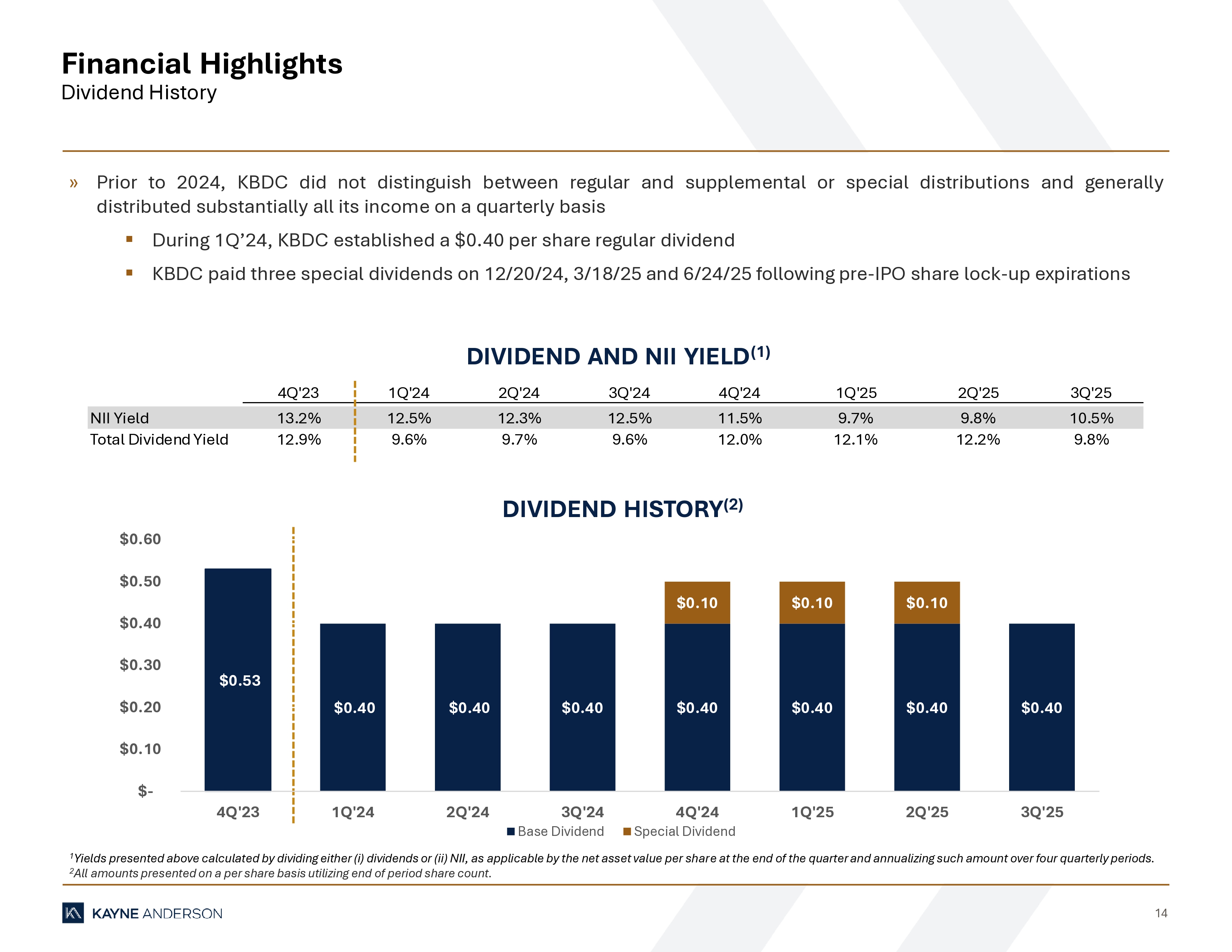 14 Financial Highlights Dividend History 1 Yields presented above calculated by dividing either (i) dividends or (ii) NII, as applicable by the net asset value per shar e a t the end of the quarter and annualizing such amount over four quarterly periods. 2 All amounts presented on a per share basis utilizing end of period share count. DIVIDEND HISTORY (2) DIVIDEND AND NII YIELD (1) » Prior to 2024 , KBDC did not distinguish between regular and supplemental or special distributions and generally distributed substantially all its income on a quarterly basis ▪ During 1 Q’ 24 , KBDC established a $ 0 . 40 per share regular dividend ▪ KBDC paid three special dividends on 12 / 20 / 24 , 3 / 18 / 25 and 6 / 24 / 25 following pre - IPO share lock - up expirations 4Q'23 1Q'24 2Q'24 3Q'24 4Q'24 1Q'25 2Q'25 3Q'25 NII Yield 13.2% 12.5% 12.3% 12.5% 11.5% 9.7% 9.8% 10.5% Total Dividend Yield 12.9% 9.6% 9.7% 9.6% 12.0% 12.1% 12.2% 9.8% $0.53 $0.40 $0.40 $0.40 $0.40 $0.40 $0.40 $0.40 $0.10 $0.10 $0.10 $- $0.10 $0.20 $0.30 $0.40 $0.50 $0.60 4Q'23 1Q'24 2Q'24 3Q'24 4Q'24 1Q'25 2Q'25 3Q'25 Base Dividend Special Dividend
