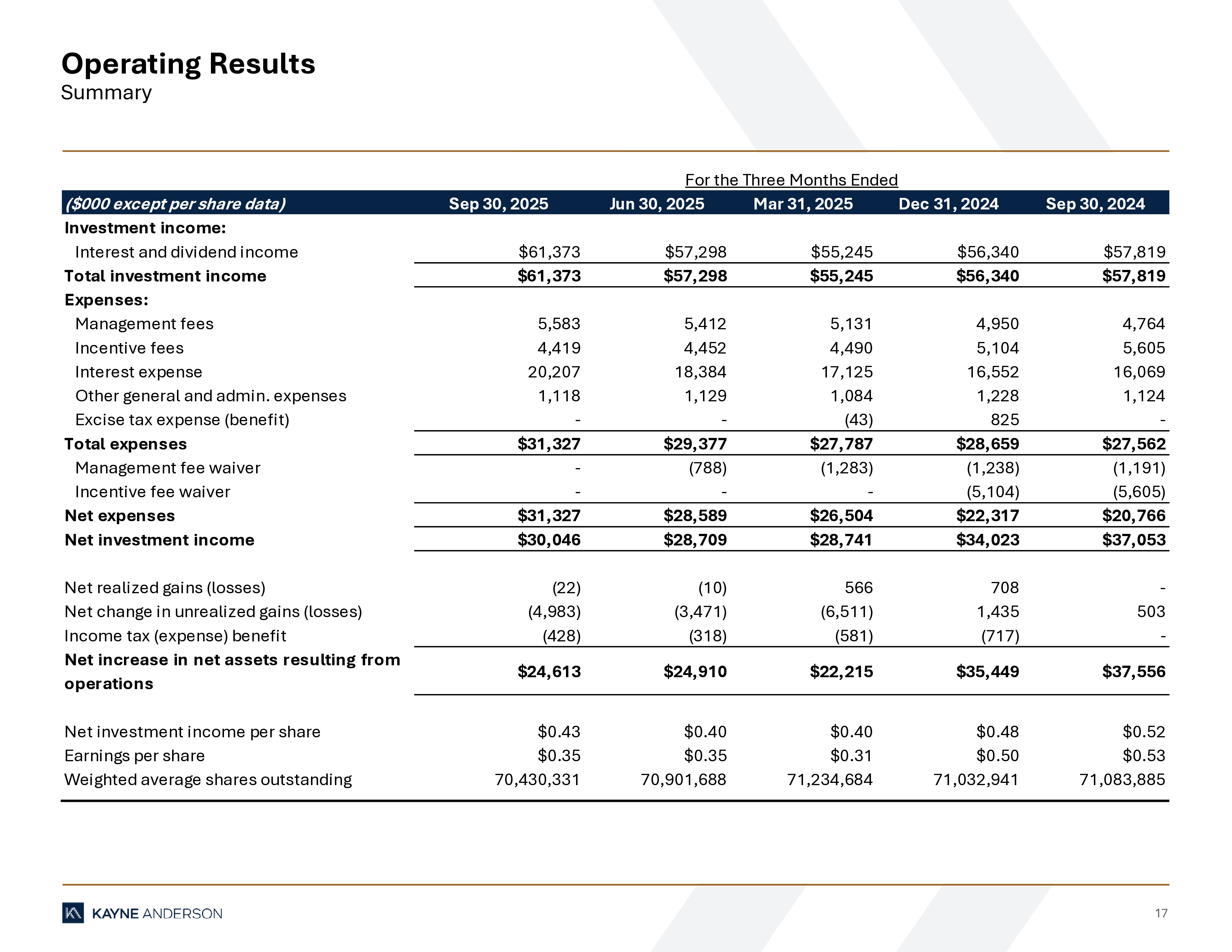 17 Operating Results Summary ($000 except per share data) Sep 30, 2025 Jun 30, 2025 Mar 31, 2025 Dec 31, 2024 Sep 30, 2024 Investment income: Interest and dividend income $61,373 $57,298 $55,245 $56,340 $57,819 Total investment income $61,373 $57,298 $55,245 $56,340 $57,819 Expenses: Management fees 5,583 5,412 5,131 4,950 4,764 Incentive fees 4,419 4,452 4,490 5,104 5,605 Interest expense 20,207 18,384 17,125 16,552 16,069 Other general and admin. expenses 1,118 1,129 1,084 1,228 1,124 Excise tax expense (benefit) - - (43) 825 - Total expenses $31,327 $29,377 $27,787 $28,659 $27,562 Management fee waiver - (788) (1,283) (1,238) (1,191) Incentive fee waiver - - - (5,104) (5,605) Net expenses $31,327 $28,589 $26,504 $22,317 $20,766 Net investment income $30,046 $28,709 $28,741 $34,023 $37,053 Net realized gains (losses) (22) (10) 566 708 - Net change in unrealized gains (losses) (4,983) (3,471) (6,511) 1,435 503 Income tax (expense) benefit (428) (318) (581) (717) - Net increase in net assets resulting from operations $24,613 $24,910 $22,215 $35,449 $37,556 Net investment income per share $0.43 $0.40 $0.40 $0.48 $0.52 Earnings per share $0.35 $0.35 $0.31 $0.50 $0.53 Weighted average shares outstanding 70,430,331 70,901,688 71,234,684 71,032,941 71,083,885 For the Three Months Ended
