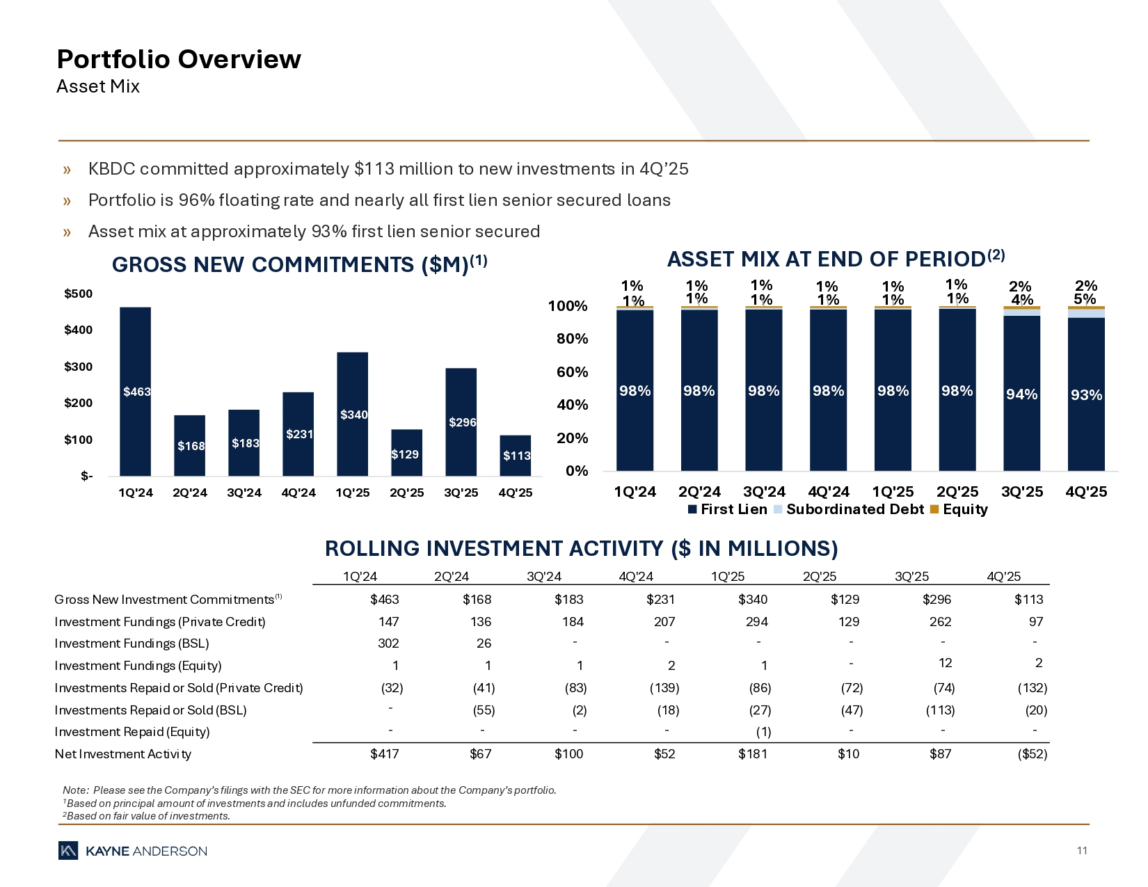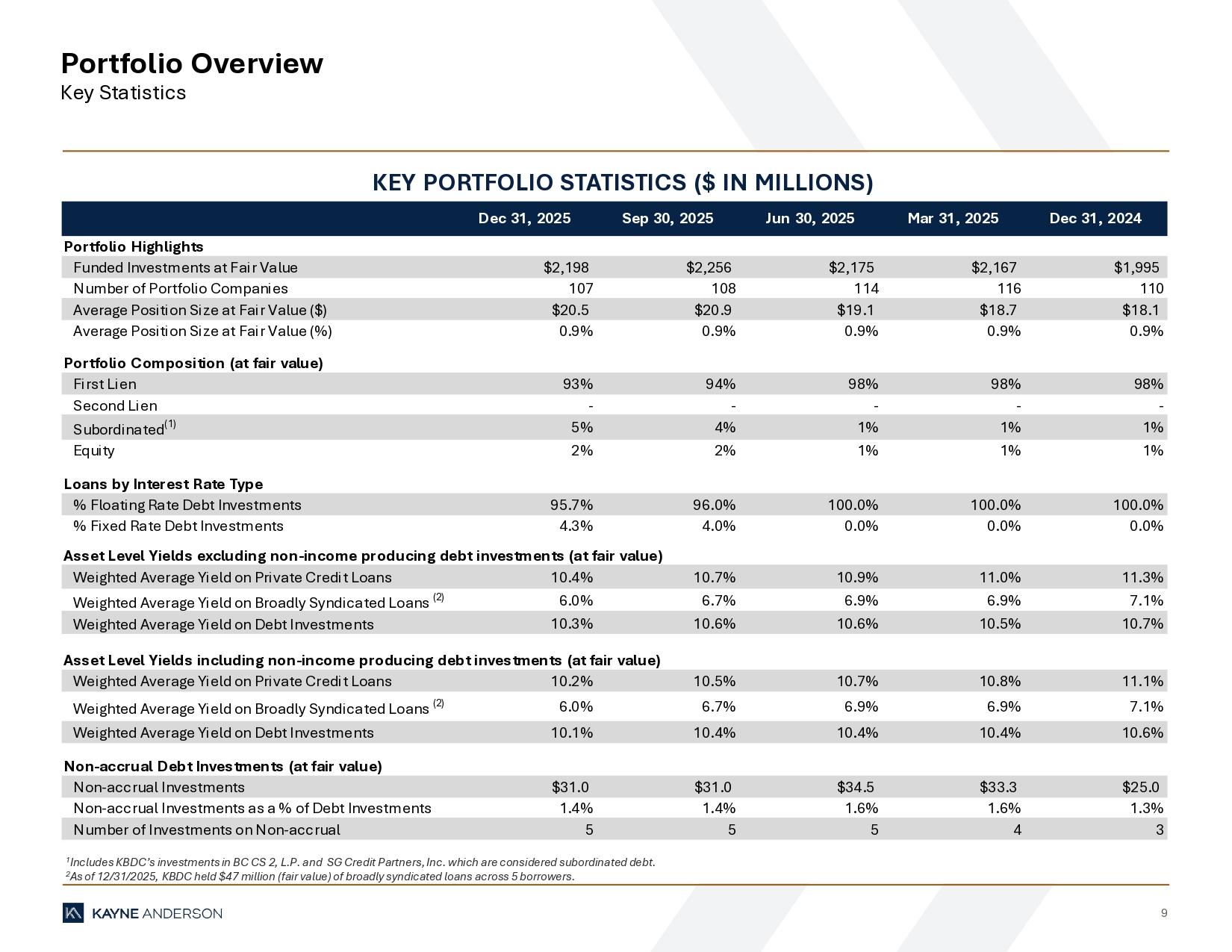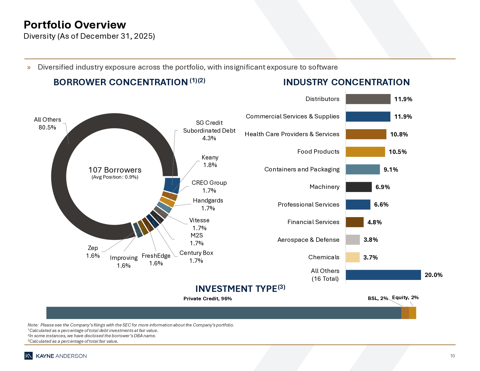 9 Portfolio Overview Key Statistics 1 Includes KBDC’s investments in BC CS 2, L.P. and SG Credit Partners, Inc. which are considered subordinated debt. 2 As of 12/31/2025, KBDC held $47 million (fair value) of broadly syndicated loans across 5 borrowers. KEY PORTFOLIO STATISTICS ($ IN MILLIONS) Dec 31, 2025 Sep 30, 2025 Jun 30, 2025 Mar 31, 2025 Dec 31, 2024 Portfolio Highlights Funded Investments at Fair Value $2,198 $2,256 $2,175 $2,167 $1,995 Number of Portfolio Companies 107 108 114 116 110 Average Position Size at Fair Value ($) $20.5 $20.9 $19.1 $18.7 $18.1 Average Position Size at Fair Value (%) 0.9% 0.9% 0.9% 0.9% 0.9% Portfolio Composition (at fair value) First Lien 93% 94% 98% 98% 98% Second Lien - - - - - Subordinated (1) 5% 4% 1% 1% 1% Equity 2% 2% 1% 1% 1% Loans by Interest Rate Type % Floating Rate Debt Investments 95.7% 96.0% 100.0% 100.0% 100.0% % Fixed Rate Debt Investments 4.3% 4.0% 0.0% 0.0% 0.0% Asset Level Yields excluding non-income producing debt investments (at fair value) Weighted Average Yield on Private Credit Loans 10.4% 10.7% 10.9% 11.0% 11.3% Weighted Average Yield on Broadly Syndicated Loans (2) 6.0% 6.7% 6.9% 6.9% 7.1% Weighted Average Yield on Debt Investments 10.3% 10.6% 10.6% 10.5% 10.7% Asset Level Yields including non-income producing debt investments (at fair value) Weighted Average Yield on Private Credit Loans 10.2% 10.5% 10.7% 10.8% 11.1% Weighted Average Yield on Broadly Syndicated Loans (2) 6.0% 6.7% 6.9% 6.9% 7.1% Weighted Average Yield on Debt Investments 10.1% 10.4% 10.4% 10.4% 10.6% Non-accrual Debt Investments (at fair value) Non-accrual Investments $31.0 $31.0 $34.5 $33.3 $25.0 Non-accrual Investments as a % of Debt Investments 1.4% 1.4% 1.6% 1.6% 1.3% Number of Investments on Non-accrual 5 5 5 4 3