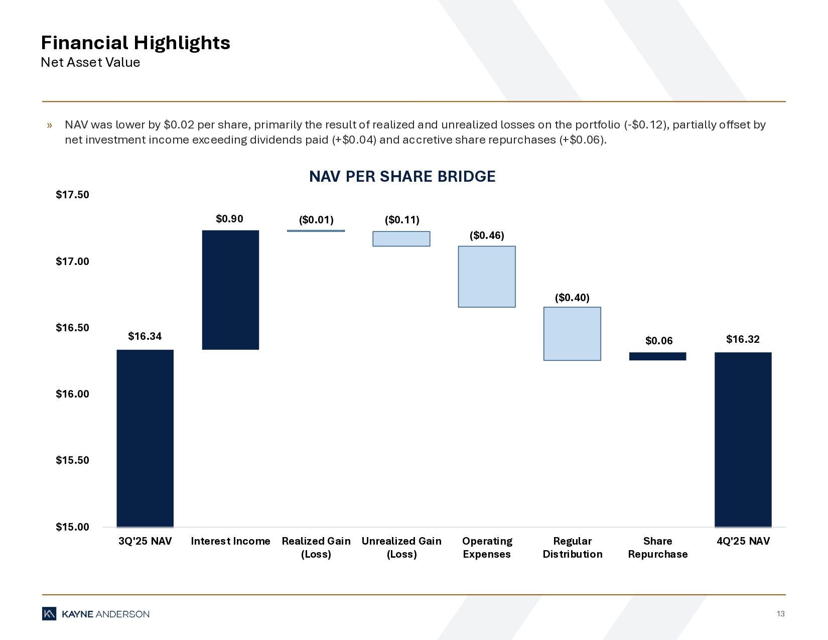 13 Financial Highlights Net Asset Value NAV PER SHARE BRIDGE » NAV was lower by $0.02 per share, primarily the result of realized and unrealized losses on the portfolio ( - $0.12), partially of fset by net investment income exceeding dividends paid (+$0.04) and accretive share repurchases (+$0.06). $16.34 $0.90 ($0.01) ($0.11) ($0.46) ($0.40) $0.06 $16.32 $15.00 $15.50 $16.00 $16.50 $17.00 $17.50 3Q'25 NAV Interest Income Realized Gain (Loss) Unrealized Gain (Loss) Operating Expenses Regular Distribution Share Repurchase 4Q'25 NAV