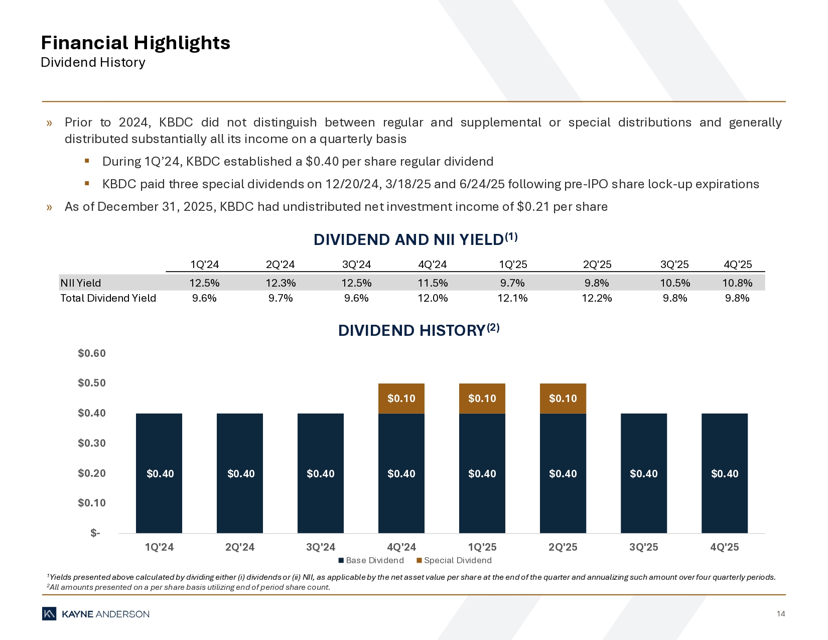 14 Financial Highlights Dividend History 1 Yields presented above calculated by dividing either (i) dividends or (ii) NII, as applicable by the net asset value per shar e a t the end of the quarter and annualizing such amount over four quarterly periods. 2 All amounts presented on a per share basis utilizing end of period share count. DIVIDEND HISTORY (2) DIVIDEND AND NII YIELD (1) » Prior to 2024 , KBDC did not distinguish between regular and supplemental or special distributions and generally distributed substantially all its income on a quarterly basis ▪ During 1 Q’ 24 , KBDC established a $ 0 . 40 per share regular dividend ▪ KBDC paid three special dividends on 12 / 20 / 24 , 3 / 18 / 25 and 6 / 24 / 25 following pre - IPO share lock - up expirations » As of December 31 , 2025 , KBDC had undistributed net investment income of $ 0 . 21 per share 1Q'24 2Q'24 3Q'24 4Q'24 1Q'25 2Q'25 3Q'25 4Q'25 NII Yield 12.5% 12.3% 12.5% 11.5% 9.7% 9.8% 10.5% 10.8% Total Dividend Yield 9.6% 9.7% 9.6% 12.0% 12.1% 12.2% 9.8% 9.8% $0.40 $0.40 $0.40 $0.40 $0.40 $0.40 $0.40 $0.40 $0.10 $0.10 $0.10 $- $0.10 $0.20 $0.30 $0.40 $0.50 $0.60 1Q'24 2Q'24 3Q'24 4Q'24 1Q'25 2Q'25 3Q'25 4Q'25 Base Dividend Special Dividend