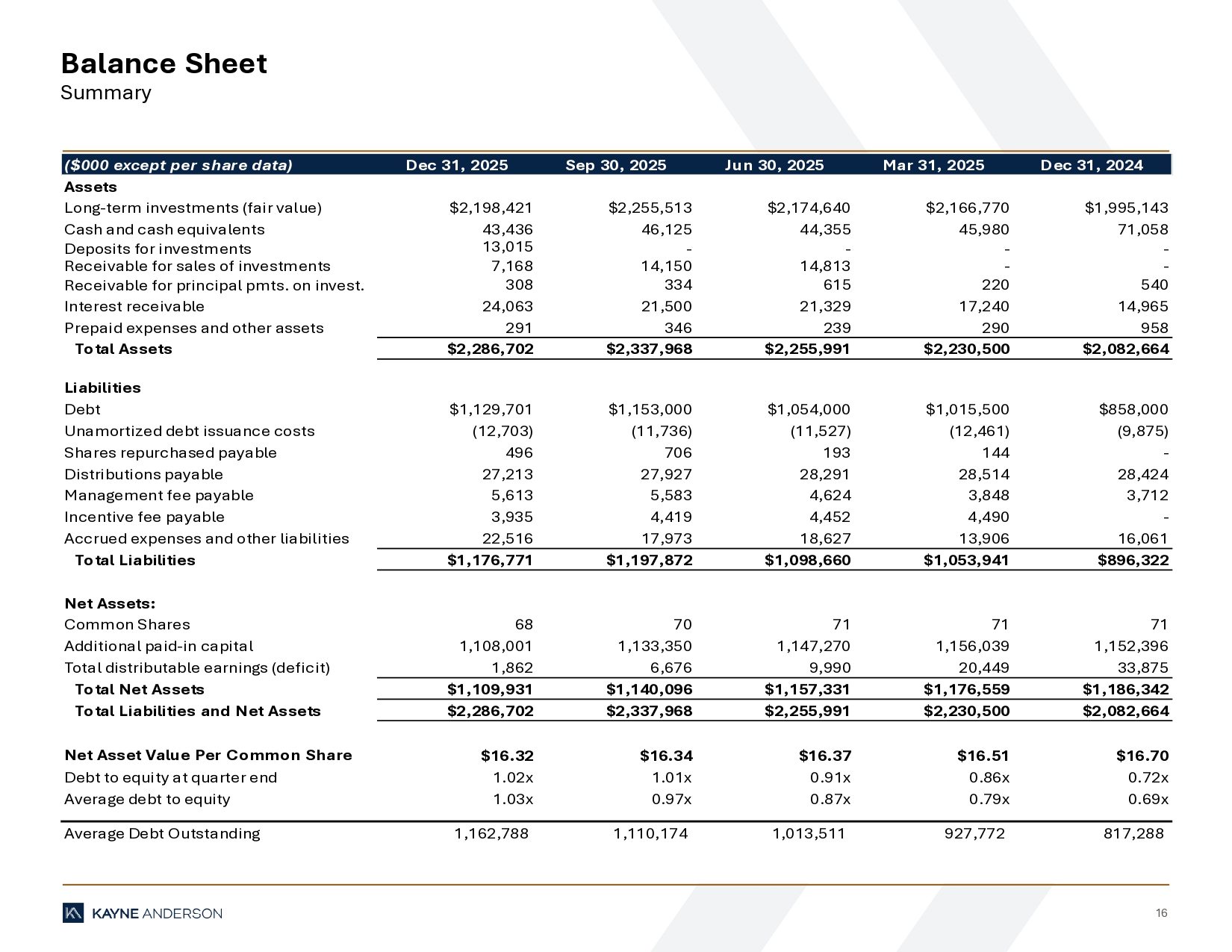 16 Balance Sheet Summary ($000 except per share data) Dec 31, 2025 Sep 30, 2025 Jun 30, 2025 Mar 31, 2025 Dec 31, 2024 Assets Long-term investments (fair value) $2,198,421 $2,255,513 $2,174,640 $2,166,770 $1,995,143 Cash and cash equivalents 43,436 46,125 44,355 45,980 71,058 Deposits for investments 13,015 - - - - Receivable for sales of investments 7,168 14,150 14,813 - - Receivable for principal pmts. on invest. 308 334 615 220 540 Interest receivable 24,063 21,500 21,329 17,240 14,965 Prepaid expenses and other assets 291 346 239 290 958 Total Assets $2,286,702 $2,337,968 $2,255,991 $2,230,500 $2,082,664 Liabilities Debt $1,129,701 $1,153,000 $1,054,000 $1,015,500 $858,000 Unamortized debt issuance costs (12,703) (11,736) (11,527) (12,461) (9,875) Shares repurchased payable 496 706 193 144 - Distributions payable 27,213 27,927 28,291 28,514 28,424 Management fee payable 5,613 5,583 4,624 3,848 3,712 Incentive fee payable 3,935 4,419 4,452 4,490 - Accrued expenses and other liabilities 22,516 17,973 18,627 13,906 16,061 Total Liabilities $1,176,771 $1,197,872 $1,098,660 $1,053,941 $896,322 Net Assets: Common Shares 68 70 71 71 71 Additional paid-in capital 1,108,001 1,133,350 1,147,270 1,156,039 1,152,396 Total distributable earnings (deficit) 1,862 6,676 9,990 20,449 33,875 Total Net Assets $1,109,931 $1,140,096 $1,157,331 $1,176,559 $1,186,342 Total Liabilities and Net Assets $2,286,702 $2,337,968 $2,255,991 $2,230,500 $2,082,664 Net Asset Value Per Common Share $16.32 $16.34 $16.37 $16.51 $16.70 Debt to equity at quarter end 1.02x 1.01x 0.91x 0.86x 0.72x Average debt to equity 1.03x 0.97x 0.87x 0.79x 0.69x Average Debt Outstanding 1,162,788 1,110,174 1,013,511 927,772 817,288