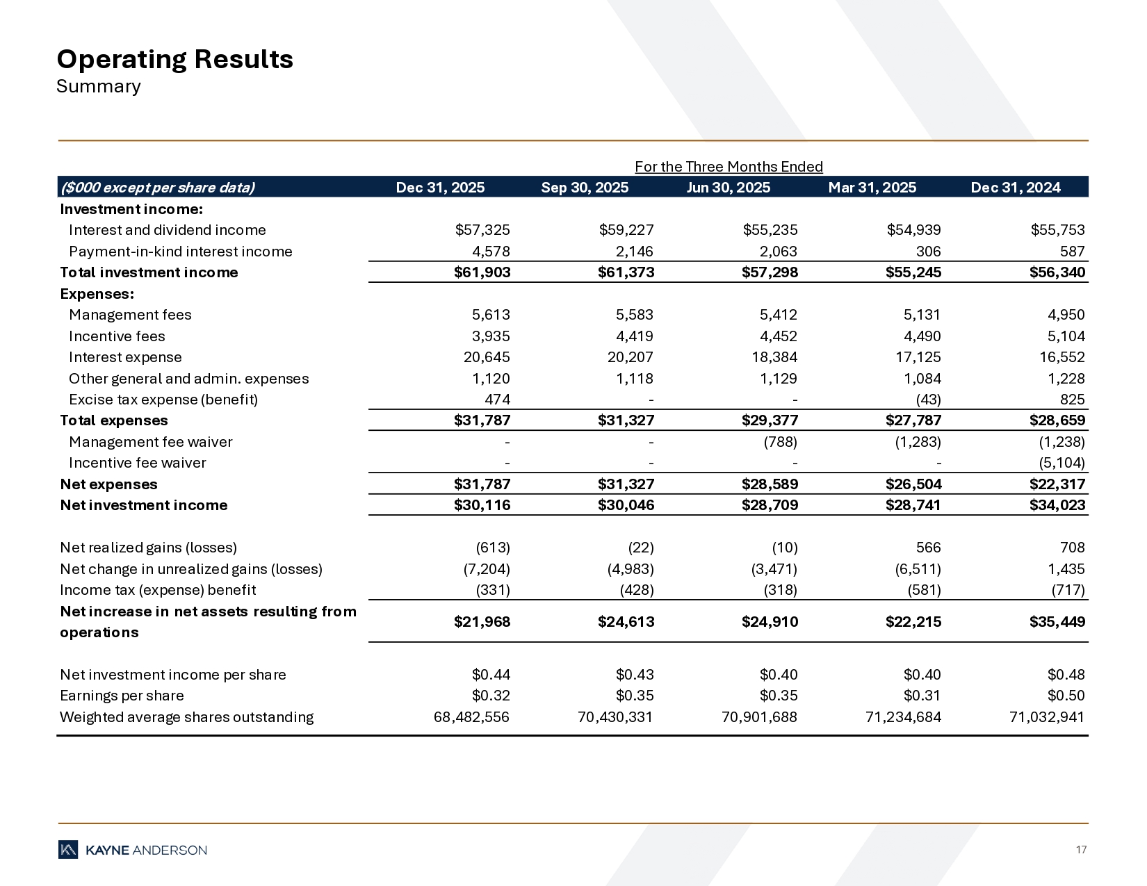 17 Operating Results Summary ($000 except per share data) Dec 31, 2025 Sep 30, 2025 Jun 30, 2025 Mar 31, 2025 Dec 31, 2024 Investment income: Interest and dividend income $57,325 $59,227 $55,235 $54,939 $55,753 Payment-in-kind interest income 4,578 2,146 2,063 306 587 Total investment income $61,903 $61,373 $57,298 $55,245 $56,340 Expenses: Management fees 5,613 5,583 5,412 5,131 4,950 Incentive fees 3,935 4,419 4,452 4,490 5,104 Interest expense 20,645 20,207 18,384 17,125 16,552 Other general and admin. expenses 1,120 1,118 1,129 1,084 1,228 Excise tax expense (benefit) 474 - - (43) 825 Total expenses $31,787 $31,327 $29,377 $27,787 $28,659 Management fee waiver - - (788) (1,283) (1,238) Incentive fee waiver - - - - (5,104) Net expenses $31,787 $31,327 $28,589 $26,504 $22,317 Net investment income $30,116 $30,046 $28,709 $28,741 $34,023 Net realized gains (losses) (613) (22) (10) 566 708 Net change in unrealized gains (losses) (7,204) (4,983) (3,471) (6,511) 1,435 Income tax (expense) benefit (331) (428) (318) (581) (717) Net increase in net assets resulting from operations $21,968 $24,613 $24,910 $22,215 $35,449 Net investment income per share $0.44 $0.43 $0.40 $0.40 $0.48 Earnings per share $0.32 $0.35 $0.35 $0.31 $0.50 Weighted average shares outstanding 68,482,556 70,430,331 70,901,688 71,234,684 71,032,941 For the Three Months Ended