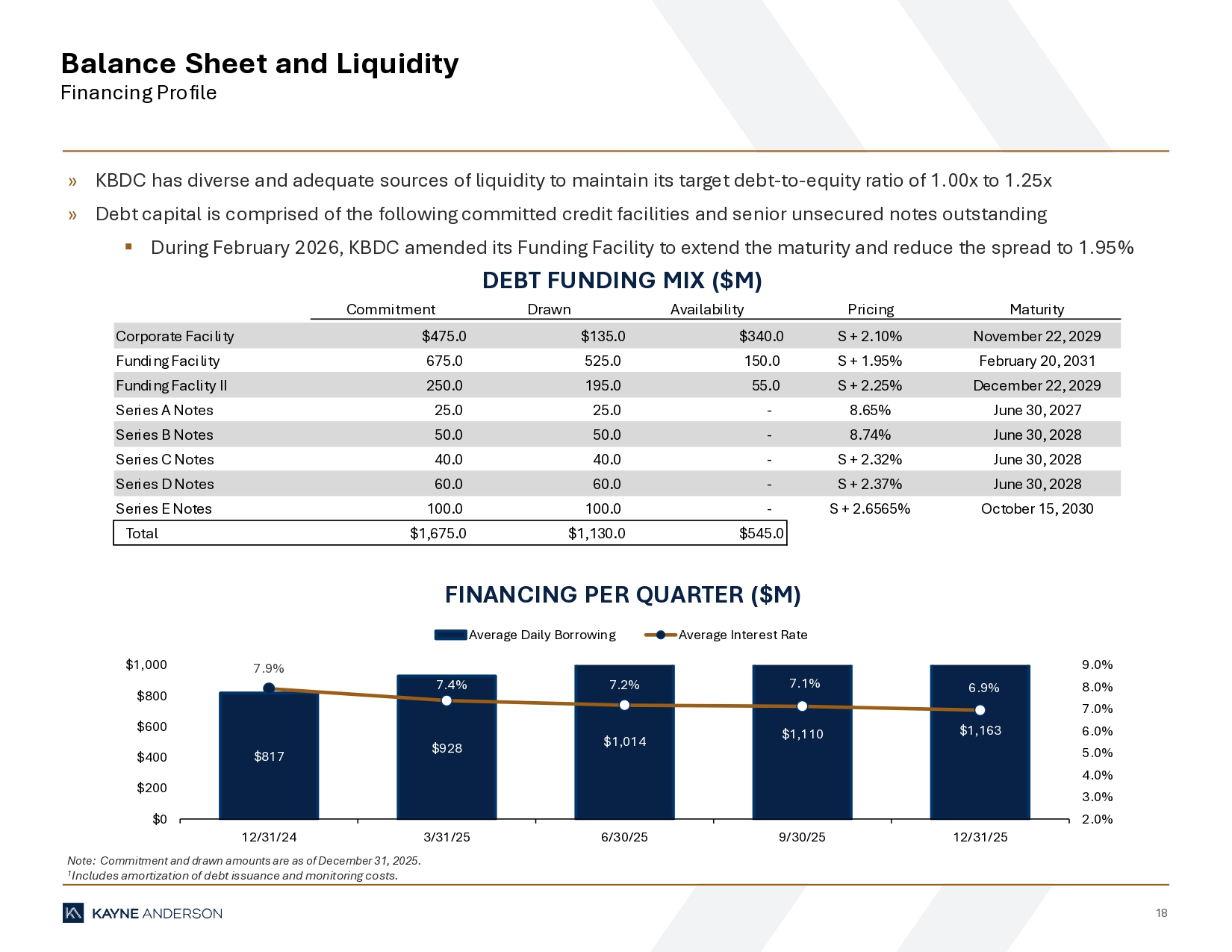18 Balance Sheet and Liquidity Financing Profile Note: Commitment and drawn amounts are as of December 31, 2025. 1 Includes amortization of debt issuance and monitoring costs. DEBT FUNDING MIX ($M) FINANCING PER QUARTER ($M) » KBDC has diverse and adequate sources of liquidity to maintain its target debt - to - equity ratio of 1.00x to 1.25x » Debt capital is comprised of the following committed credit facilities and senior unsecured notes outstanding ▪ During February 2026, KBDC amended its Funding Facility to extend the maturity and reduce the spread to 1.95% Commitment Drawn Availability Pricing Maturity Corporate Facility $475.0 $135.0 $340.0 S + 2.10% November 22, 2029 Funding Facility 675.0 525.0 150.0 S + 1.95% February 20, 2031 Funding Faclity II 250.0 195.0 55.0 S + 2.25% December 22, 2029 Series A Notes 25.0 25.0 - 8.65% June 30, 2027 Series B Notes 50.0 50.0 - 8.74% June 30, 2028 Series C Notes 40.0 40.0 - S + 2.32% June 30, 2028 Series D Notes 60.0 60.0 - S + 2.37% June 30, 2028 Series E Notes 100.0 100.0 - S + 2.6565% October 15, 2030 Total $1,675.0 $1,130.0 $545.0 $817 $928 $1,014 $1,110 $1,163 7.9% 7.4% 7.2% 7.1% 6.9% 2.0% 3.0% 4.0% 5.0% 6.0% 7.0% 8.0% 9.0% $0 $200 $400 $600 $800 $1,000 12/31/24 3/31/25 6/30/25 9/30/25 12/31/25 Average Daily Borrowing Average Interest Rate