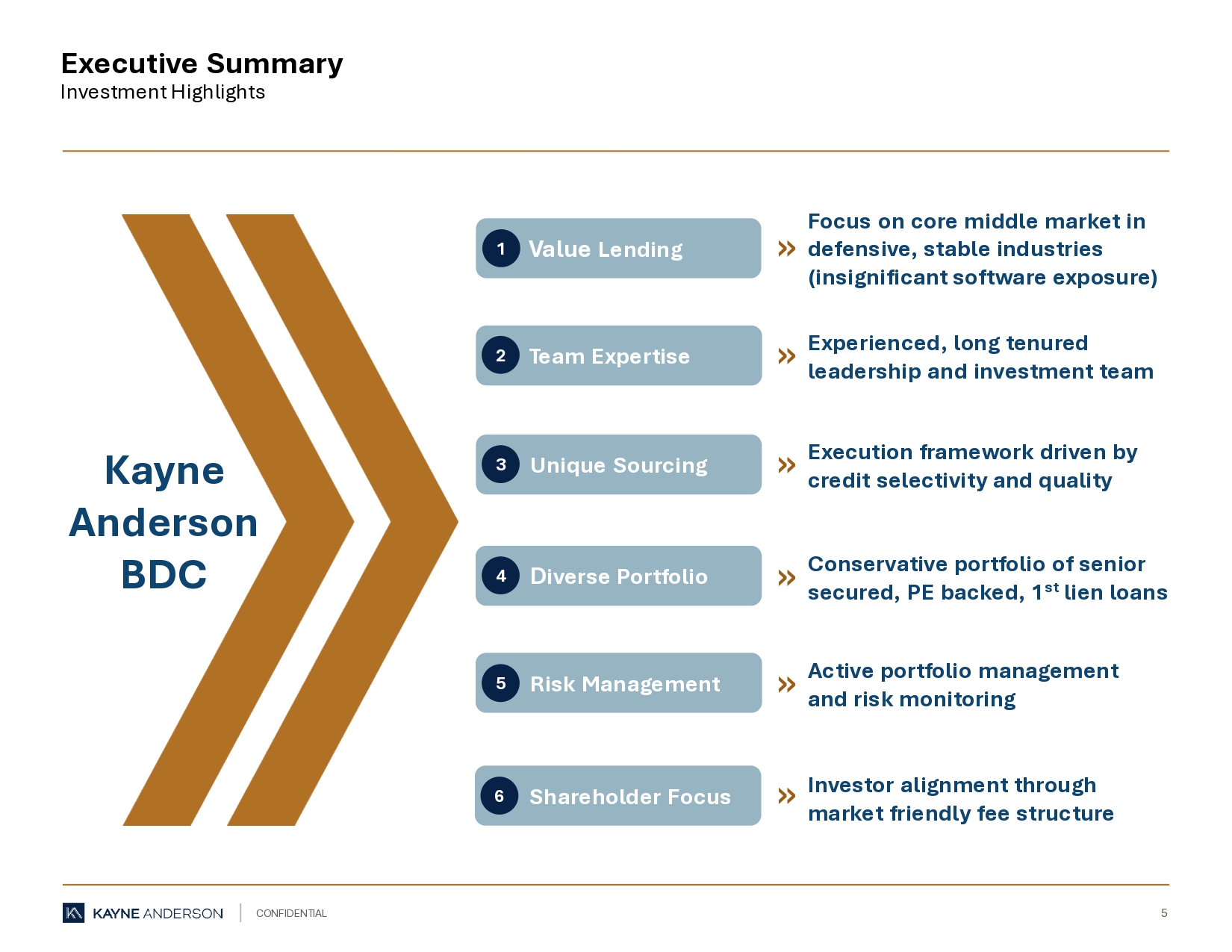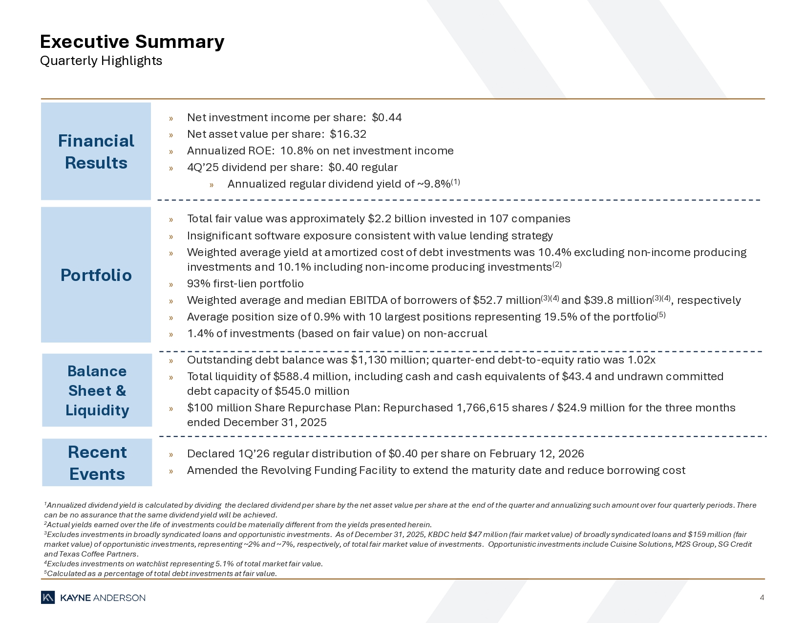 4 Executive Summary Quarterly Highlights 1 Annualized dividend yield is calculated by dividing the declared dividend per share by the net asset value per share at the end of the quarter and annualizing such amount over four quarterly periods. There can be no assurance that the same dividend yield will be achieved. 2 Actual yields earned over the life of investments could be materially different from the yields presented herein. 3 Excludes investments in broadly syndicated loans and opportunistic investments. As of December 31, 2025, KBDC held $47 milli on (fair market value) of broadly syndicated loans and $159 million (fair market value) of opportunistic investments, representing ~2% and ~7%, respectively, of total fair market value of investments . Opportunistic investments include Cuisine Solutions, M2S Group, SG Credit and Texas Coffee Partners. 4 Excludes investments on watchlist representing 5.1% of total market fair value. 5 Calculated as a percentage of total debt investments at fair value. Financial Results Portfolio Balance Sheet & Liquidity Recent Events » Net investment income per share: $0.44 » Net asset value per share: $16.32 » Annualized ROE: 10.8% on net investment income » 4Q’25 dividend per share: $0.40 regular » Annualized regular dividend yield of ~9.8% (1) » Total fair value was approximately $2.2 billion invested in 107 companies » Insignificant software exposure consistent with value lending strategy » Weighted average yield at amortized cost of debt investments was 10.4% excluding non - income producing investments and 10.1% including non - income producing investments (2) » 93% first - lien portfolio » Weighted average and median EBITDA of borrowers of $52.7 million (3)(4) and $39.8 million (3)(4) , respectively » Average position size of 0.9% with 10 largest positions representing 19.5% of the portfolio (5) » 1.4% of investments (based on fair value) on non - accrual » Outstanding debt balance was $1,130 million; quarter - end debt - to - equity ratio was 1.02x » Total liquidity of $588.4 million, including cash and cash equivalents of $43.4 and undrawn committed debt capacity of $545.0 million » $100 million Share Repurchase Plan: Repurchased 1,766,615 shares / $24.9 million for the three months ended December 31, 2025 » Declared 1Q’26 regular distribution of $0.40 per share on February 12, 2026 » Amended the Revolving Funding Facility to extend the maturity date and reduce borrowing cost