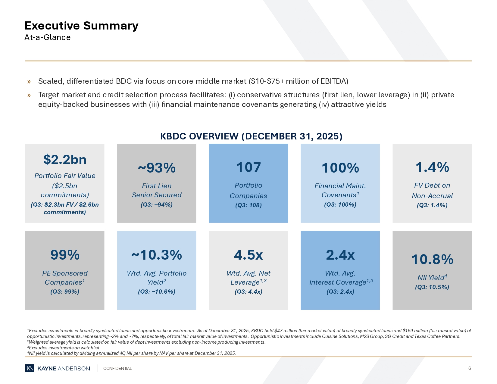 CONFIDENTIAL 6 » Scaled, differentiated BDC via focus on core middle market ($10 - $75+ million of EBITDA) » Target market and credit selection process facilitates: (i) conservative structures (first lien, lower leverage) in (ii) priv ate equity - backed businesses with (iii) financial maintenance covenants generating (iv) attractive yields Executive Summary At - a - Glance 1 Excludes investments in broadly syndicated loans and opportunistic investments . As of December 31 , 2025 , KBDC held $ 47 million (fair market value) of broadly syndicated loans and $ 159 million (fair market value) of opportunistic investments, representing ~ 2 % and ~ 7 % , respectively, of total fair market value of investments . Opportunistic investments include Cuisine Solutions, M 2 S Group, SG Credit and Texas Coffee Partners . 2 Weighted average yield is calculated on fair value of debt investments excluding non - income producing investments . 3 Excludes investments on watchlist . 4 NII yield is calculated by dividing annualized 4 Q NII per share by NAV per share at December 31 , 2025 . KBDC OVERVIEW (DECEMBER 31, 2025) $2.2bn Portfolio Fair Value ($2.5bn commitments) (Q3: $2.3bn FV / $2.6bn commitments) 100% Financial Maint. Covenants 1 (Q3: 100%) ~93% First Lien Senior Secured (Q3: ~94%) 99% PE Sponsored Companies 1 (Q3: 99%) 107 Portfolio Companies (Q3: 108) 2.4x Wtd. Avg. Interest Coverage 1,3 (Q3: 2.4x) ~10.3% Wtd. Avg. Portfolio Yield 2 (Q3: ~10.6%) 4.5x Wtd. Avg. Net Leverage 1,3 (Q3: 4.4x) 1.4% FV Debt on Non - Accrual (Q3: 1.4%) 10.8% NII Yield 4 (Q3: 10.5%)