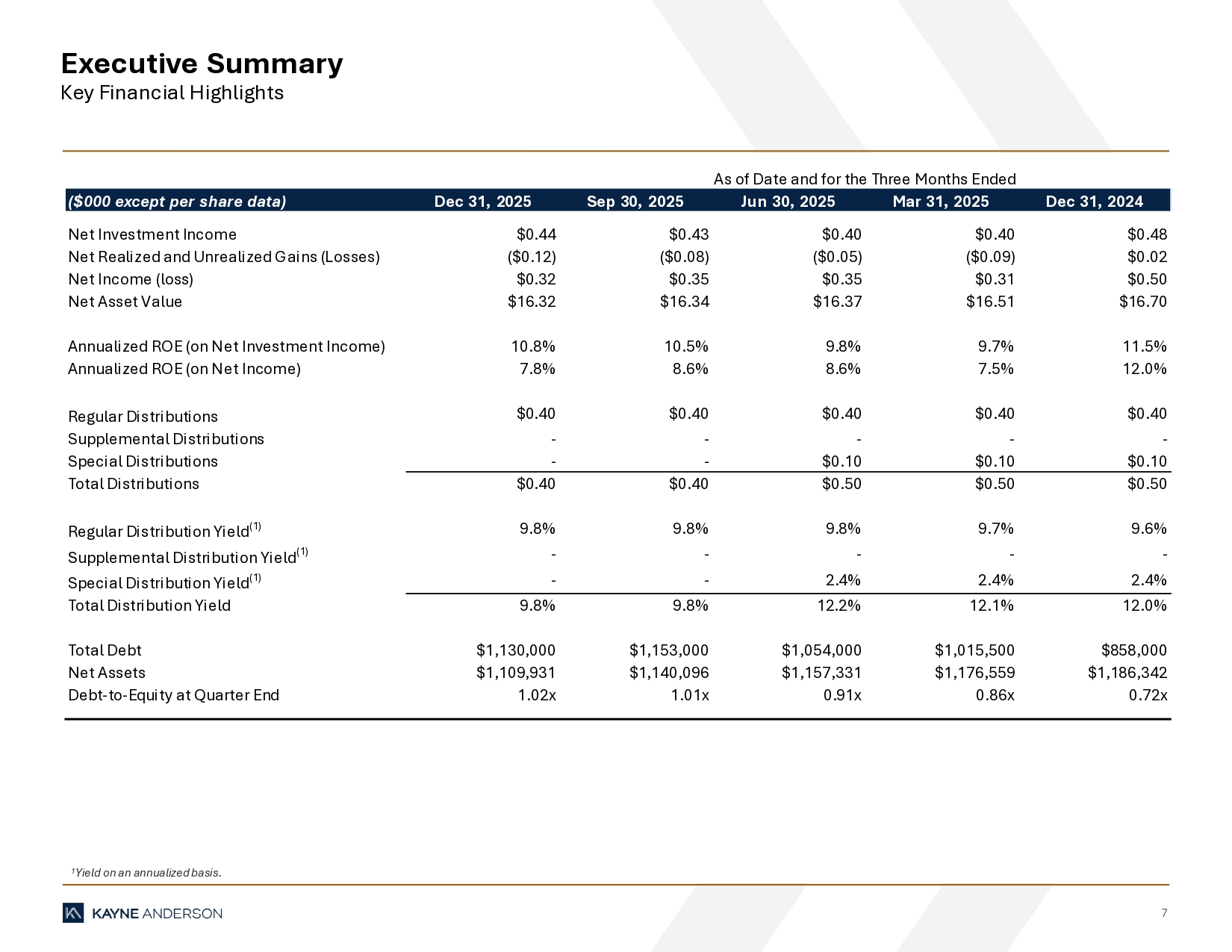 7 Executive Summary Key Financial Highlights 1 Yield on an annualized basis. ($000 except per share data) Dec 31, 2025 Sep 30, 2025 Jun 30, 2025 Mar 31, 2025 Dec 31, 2024 Net Investment Income $0.44 $0.43 $0.40 $0.40 $0.48 Net Realized and Unrealized Gains (Losses) ($0.12) ($0.08) ($0.05) ($0.09) $0.02 Net Income (loss) $0.32 $0.35 $0.35 $0.31 $0.50 Net Asset Value $16.32 $16.34 $16.37 $16.51 $16.70 Annualized ROE (on Net Investment Income) 10.8% 10.5% 9.8% 9.7% 11.5% Annualized ROE (on Net Income) 7.8% 8.6% 8.6% 7.5% 12.0% Regular Distributions $0.40 $0.40 $0.40 $0.40 $0.40 Supplemental Distributions - - - - - Special Distributions - - $0.10 $0.10 $0.10 Total Distributions $0.40 $0.40 $0.50 $0.50 $0.50 Regular Distribution Yield (1) 9.8% 9.8% 9.8% 9.7% 9.6% Supplemental Distribution Yield (1) - - - - - Special Distribution Yield (1) - - 2.4% 2.4% 2.4% Total Distribution Yield 9.8% 9.8% 12.2% 12.1% 12.0% Total Debt $1,130,000 $1,153,000 $1,054,000 $1,015,500 $858,000 Net Assets $1,109,931 $1,140,096 $1,157,331 $1,176,559 $1,186,342 Debt-to-Equity at Quarter End 1.02x 1.01x 0.91x 0.86x 0.72x As of Date and for the Three Months Ended