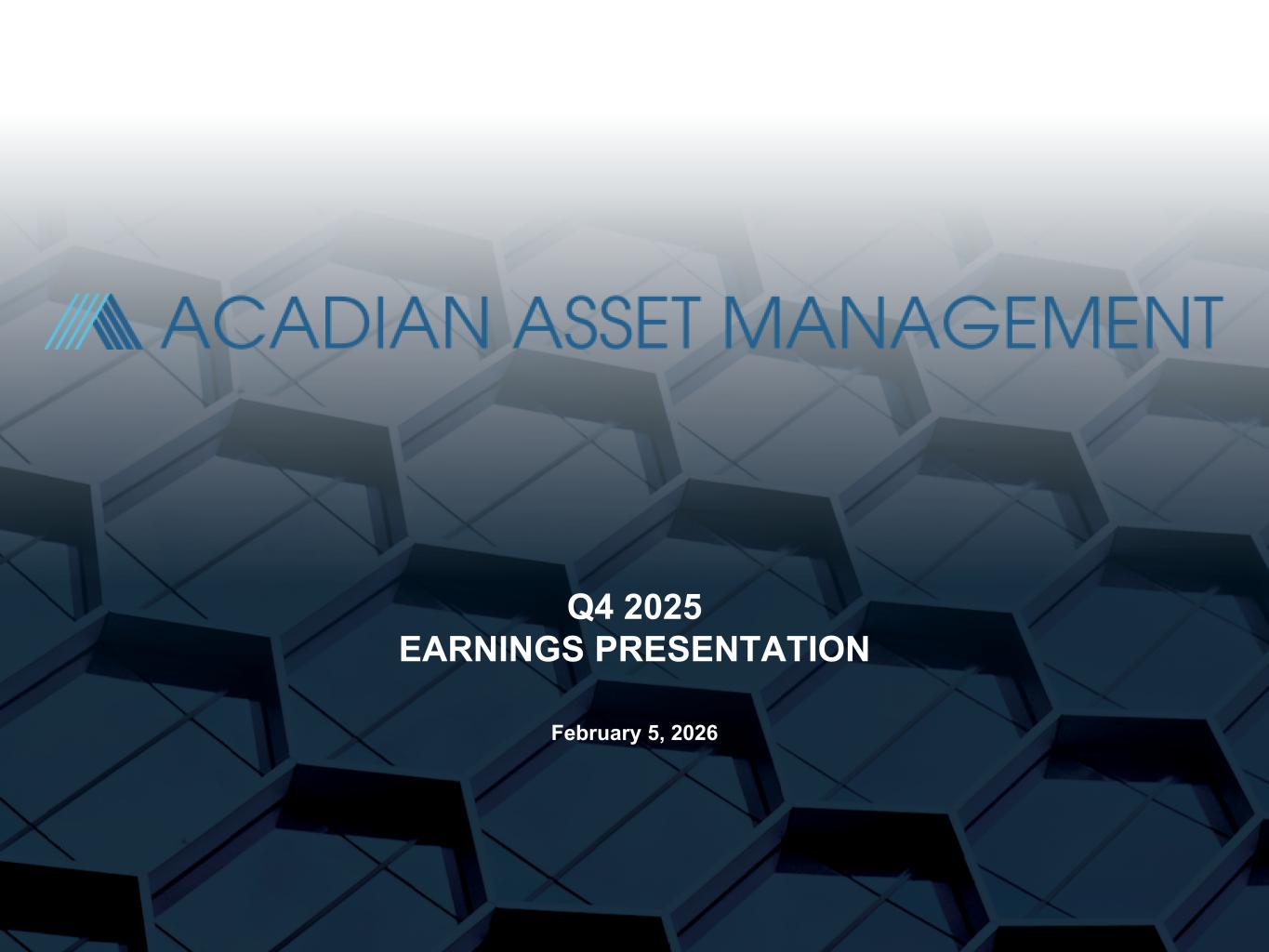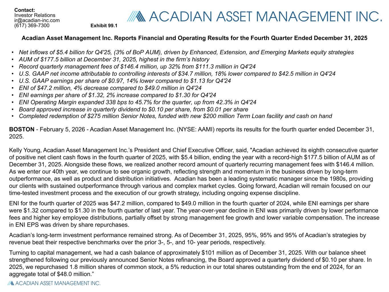 Acadian Asset Management Inc. Reports Financial and Operating Results for the Fourth Quarter Ended December 31, 2025 • Net inflows of $5.4 billion for Q4'25, (3% of BoP AUM), driven by Enhanced, Extension, and Emerging Markets equity strategies • AUM of $177.5 billion at December 31, 2025, highest in the firm’s history • Record quarterly management fees of $146.4 million, up 32% from $111.3 million in Q4'24 • U.S. GAAP net income attributable to controlling interests of $34.7 million, 18% lower compared to $42.5 million in Q4'24 • U.S. GAAP earnings per share of $0.97, 14% lower compared to $1.13 for Q4'24 • ENI of $47.2 million, 4% decrease compared to $49.0 million in Q4'24 • ENI earnings per share of $1.32, 2% increase compared to $1.30 for Q4'24 • ENI Operating Margin expanded 338 bps to 45.7% for the quarter, up from 42.3% in Q4'24 • Board approved increase in quarterly dividend to $0.10 per share, from $0.01 per share • Completed redemption of $275 million Senior Notes, funded with new $200 million Term Loan facility and cash on hand BOSTON - February 5, 2026 - Acadian Asset Management Inc. (NYSE: AAMI) reports its results for the fourth quarter ended December 31, 2025. Kelly Young, Acadian Asset Management Inc.’s President and Chief Executive Officer, said, "Acadian achieved its eighth consecutive quarter of positive net client cash flows in the fourth quarter of 2025, with $5.4 billion, ending the year with a record-high $177.5 billion of AUM as of December 31, 2025. Alongside these flows, we realized another record amount of quarterly recurring management fees with $146.4 million. As we enter our 40th year, we continue to see organic growth, reflecting strength and momentum in the business driven by long-term outperformance, as well as product and distribution initiatives. Acadian has been a leading systematic manager since the 1980s, providing our clients with sustained outperformance through various and complex market cycles. Going forward, Acadian will remain focused on our time-tested investment process and the execution of our growth strategy, including ongoing expense discipline. ENI for the fourth quarter of 2025 was $47.2 million, compared to $49.0 million in the fourth quarter of 2024, while ENI earnings per share were $1.32 compared to $1.30 in the fourth quarter of last year. The year-over-year decline in ENI was primarily driven by lower performance fees and higher key employee distributions, partially offset by strong management fee growth and lower variable compensation. The increase in ENI EPS was driven by share repurchases. Acadian’s long-term investment performance remained strong. As of December 31, 2025, 95%, 95% and 95% of Acadian’s strategies by revenue beat their respective benchmarks over the prior 3-, 5-, and 10- year periods, respectively. Turning to capital management, we had a cash balance of approximately $101 million as of December 31, 2025. With our balance sheet strengthened following our previously announced Senior Notes refinancing, the Board approved a quarterly dividend of $0.10 per share. In 2025, we repurchased 1.8 million shares of common stock, a 5% reduction in our total shares outstanding from the end of 2024, for an aggregate total of $48.0 million.” Contact: Investor Relations ir@acadian-inc.com (617) 369-7300 Exhibit 99.1