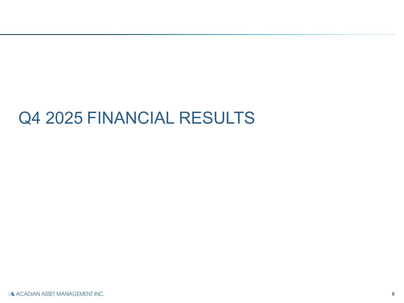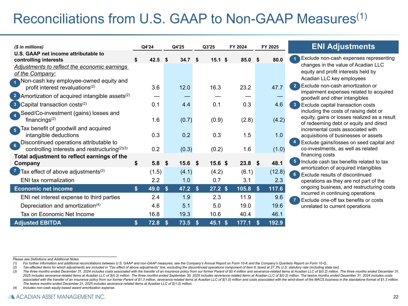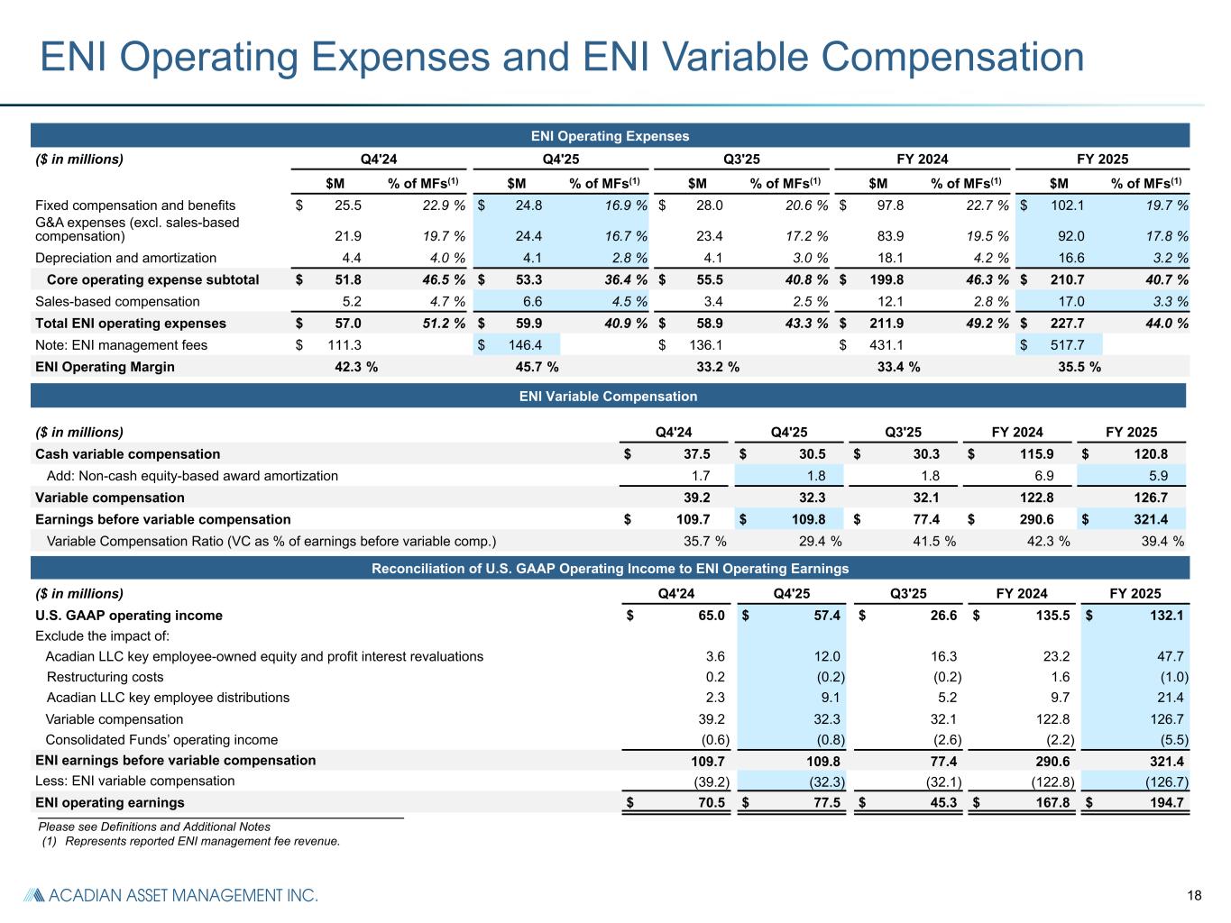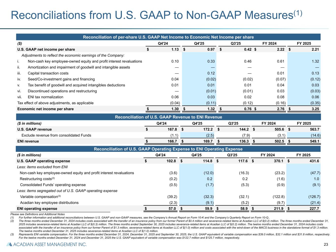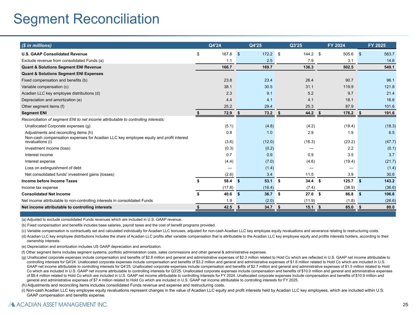 25 Segment Reconciliation ($ in millions) Q4'24 Q4'25 Q3'25 FY 2024 FY 2025 U.S. GAAP Consolidated Revenue $ 167.8 $ 172.2 $ 144.2 $ 505.6 $ 563.7 Exclude revenue from consolidated Funds (a) 1.1 2.5 7.9 3.1 14.6 Quant & Solutions Segment ENI Revenue 166.7 169.7 136.3 502.5 549.1 Quant & Solutions Segment ENI Expenses Fixed compensation and benefits (b) 23.8 23.4 26.4 90.7 96.1 Variable compensation (c) 38.1 30.5 31.1 119.9 121.8 Acadian LLC key employee distributions (d) 2.3 9.1 5.2 9.7 21.4 Depreciation and amortization (e) 4.4 4.1 4.1 18.1 16.6 Other segment items (f) 25.2 29.4 25.3 87.9 101.6 Segment ENI $ 72.9 $ 73.2 $ 44.2 $ 176.2 $ 191.6 Reconciliation of segment ENI to net income attributable to controlling interests: Unallocated Corporate expenses (g) (5.1) (4.8) (4.2) (19.4) (18.3) Adjustments and reconciling items (h) 0.8 1.0 2.9 1.9 6.5 Non-cash compensation expenses for Acadian LLC key employee equity and profit interest revaluations (i) (3.6) (12.0) (16.3) (23.2) (47.7) Investment income (loss) (0.3) (0.2) — 2.2 (0.1) Interest income 0.7 0.9 0.9 3.5 3.7 Interest expense (4.4) (7.0) (4.6) (19.4) (21.7) Loss on extinguishment of debt — (1.4) — — (1.4) Net consolidated funds' investment gains (losses) (2.6) 3.4 11.5 3.9 30.6 Income before Income Taxes $ 58.4 $ 53.1 $ 34.4 $ 125.7 $ 143.2 Income tax expense (17.8) (16.4) (7.4) (38.9) (36.6) Consolidated Net Income $ 40.6 $ 36.7 $ 27.0 $ 86.8 $ 106.6 Net income attributable to non-controlling interests in consolidated Funds 1.9 (2.0) (11.9) (1.8) (26.6) Net income attributable to controlling interests $ 42.5 $ 34.7 $ 15.1 $ 85.0 $ 80.0 (a) Adjusted to exclude consolidated Funds revenues which are included in U.S. GAAP revenue. (b) Fixed compensation and benefits includes base salaries, payroll taxes and the cost of benefit programs provided. (c) Variable compensation is contractually set and calculated individually for Acadian LLC bonuses, adjusted for non-cash Acadian LLC key employee equity revaluations and severance relating to restructuring costs. (d) Acadian LLC key employee distributions includes the share of Acadian LLC profits after variable compensation that is attributable to the Acadian LLC key employee equity and profits interests holders, according to their ownership interests. (e) Depreciation and amortization includes US GAAP depreciation and amortization. (f) Other segment items includes segment systems, portfolio administration costs, sales commissions and other general & administrative expenses. (g) Unallocated corporate expenses include compensation and benefits of $2.8 million and general and administrative expenses of $2.3 million related to Hold Co which are reflected in U.S. GAAP net income attributable to controlling interests for Q4'24. Unallocated corporate expenses include compensation and benefits of $3.2 million and general and administrative expenses of $1.6 million related to Hold Co which are included in U.S. GAAP net income attributable to controlling interests for Q4'25. Unallocated corporate expenses include compensation and benefits of $2.7 million and general and administrative expenses of $1.5 million related to Hold Co which are included in U.S. GAAP net income attributable to controlling interests for Q3'25. Unallocated corporate expenses include compensation and benefits of $10.0 million and general and administrative expenses of $9.4 million related to Hold Co which are included in U.S. GAAP net income attributable to controlling interests for FY 2024. Unallocated corporate expenses include compensation and benefits of $10.9 million and general and administrative expenses of $7.4 million related to Hold Co which are included in U.S. GAAP net income attributable to controlling interests for FY 2025. (h) Adjustments and reconciling items includes consolidated Funds revenue and expense and restructuring costs. (i) Non-cash Acadian LLC key employee equity revaluations represent changes in the value of Acadian LLC equity and profit interests held by Acadian LLC key employees, which are included within U.S. GAAP compensation and benefits expense.
