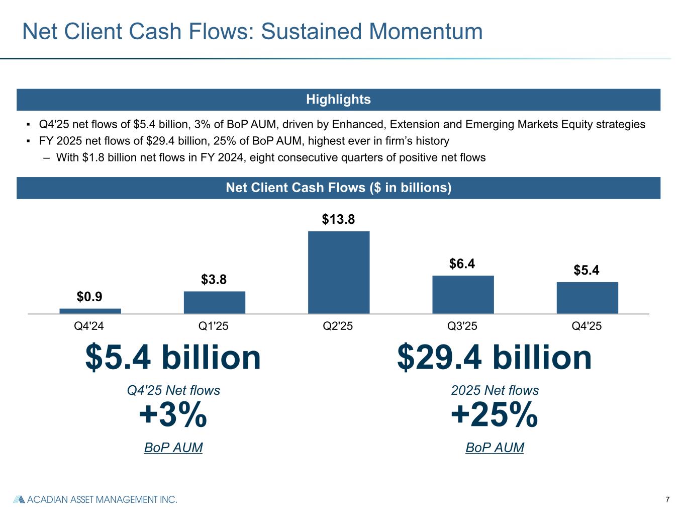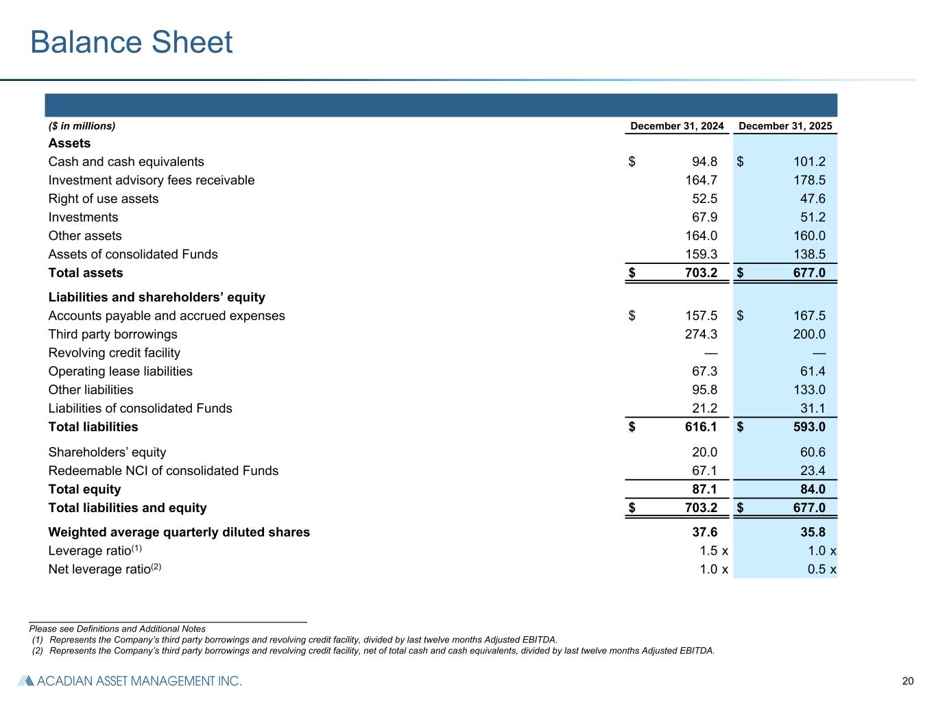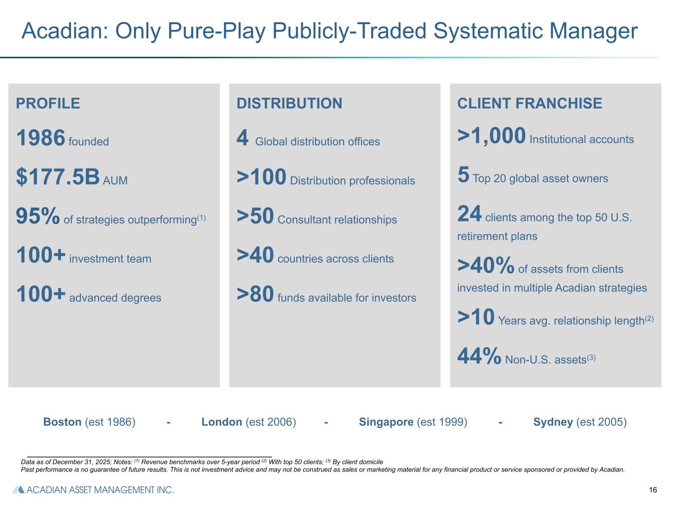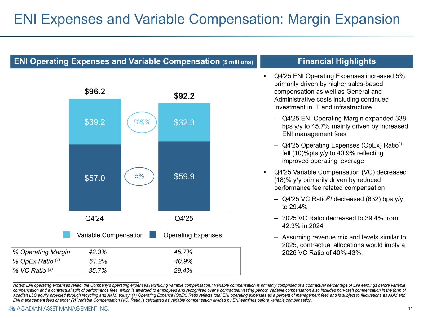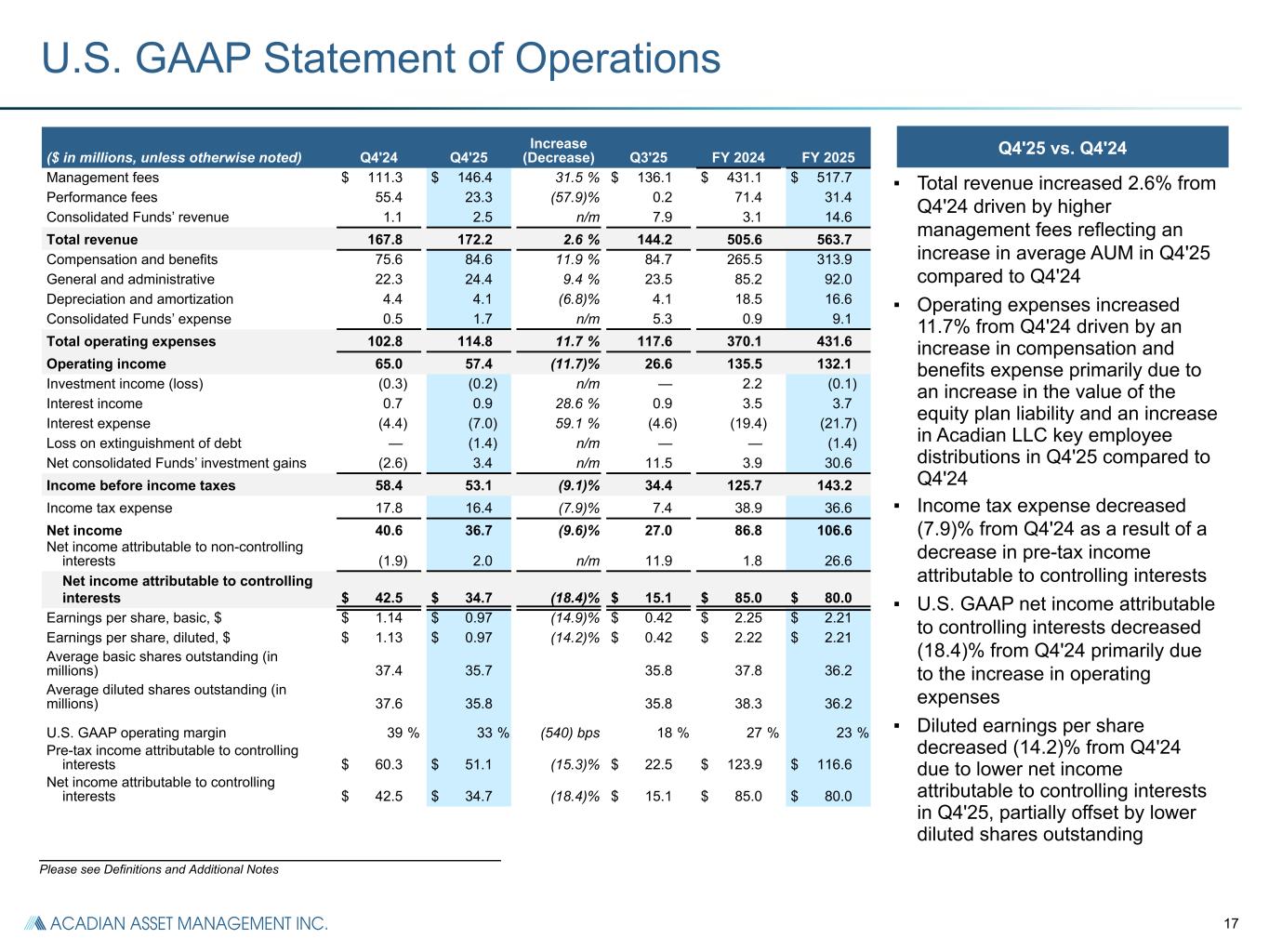 25 Segment Reconciliation ($ in millions) Q4'24 Q4'25 Q3'25 FY 2024 FY 2025 U.S. GAAP Consolidated Revenue $ 167.8 $ 172.2 $ 144.2 $ 505.6 $ 563.7 Exclude revenue from consolidated Funds (a) 1.1 2.5 7.9 3.1 14.6 Quant & Solutions Segment ENI Revenue 166.7 169.7 136.3 502.5 549.1 Quant & Solutions Segment ENI Expenses Fixed compensation and benefits (b) 23.8 23.4 26.4 90.7 96.1 Variable compensation (c) 38.1 30.5 31.1 119.9 121.8 Acadian LLC key employee distributions (d) 2.3 9.1 5.2 9.7 21.4 Depreciation and amortization (e) 4.4 4.1 4.1 18.1 16.6 Other segment items (f) 25.2 29.4 25.3 87.9 101.6 Segment ENI $ 72.9 $ 73.2 $ 44.2 $ 176.2 $ 191.6 Reconciliation of segment ENI to net income attributable to controlling interests: Unallocated Corporate expenses (g) (5.1) (4.8) (4.2) (19.4) (18.3) Adjustments and reconciling items (h) 0.8 1.0 2.9 1.9 6.5 Non-cash compensation expenses for Acadian LLC key employee equity and profit interest revaluations (i) (3.6) (12.0) (16.3) (23.2) (47.7) Investment income (loss) (0.3) (0.2) — 2.2 (0.1) Interest income 0.7 0.9 0.9 3.5 3.7 Interest expense (4.4) (7.0) (4.6) (19.4) (21.7) Loss on extinguishment of debt — (1.4) — — (1.4) Net consolidated funds' investment gains (losses) (2.6) 3.4 11.5 3.9 30.6 Income before Income Taxes $ 58.4 $ 53.1 $ 34.4 $ 125.7 $ 143.2 Income tax expense (17.8) (16.4) (7.4) (38.9) (36.6) Consolidated Net Income $ 40.6 $ 36.7 $ 27.0 $ 86.8 $ 106.6 Net income attributable to non-controlling interests in consolidated Funds 1.9 (2.0) (11.9) (1.8) (26.6) Net income attributable to controlling interests $ 42.5 $ 34.7 $ 15.1 $ 85.0 $ 80.0 (a) Adjusted to exclude consolidated Funds revenues which are included in U.S. GAAP revenue. (b) Fixed compensation and benefits includes base salaries, payroll taxes and the cost of benefit programs provided. (c) Variable compensation is contractually set and calculated individually for Acadian LLC bonuses, adjusted for non-cash Acadian LLC key employee equity revaluations and severance relating to restructuring costs. (d) Acadian LLC key employee distributions includes the share of Acadian LLC profits after variable compensation that is attributable to the Acadian LLC key employee equity and profits interests holders, according to their ownership interests. (e) Depreciation and amortization includes US GAAP depreciation and amortization. (f) Other segment items includes segment systems, portfolio administration costs, sales commissions and other general & administrative expenses. (g) Unallocated corporate expenses include compensation and benefits of $2.8 million and general and administrative expenses of $2.3 million related to Hold Co which are reflected in U.S. GAAP net income attributable to controlling interests for Q4'24. Unallocated corporate expenses include compensation and benefits of $3.2 million and general and administrative expenses of $1.6 million related to Hold Co which are included in U.S. GAAP net income attributable to controlling interests for Q4'25. Unallocated corporate expenses include compensation and benefits of $2.7 million and general and administrative expenses of $1.5 million related to Hold Co which are included in U.S. GAAP net income attributable to controlling interests for Q3'25. Unallocated corporate expenses include compensation and benefits of $10.0 million and general and administrative expenses of $9.4 million related to Hold Co which are included in U.S. GAAP net income attributable to controlling interests for FY 2024. Unallocated corporate expenses include compensation and benefits of $10.9 million and general and administrative expenses of $7.4 million related to Hold Co which are included in U.S. GAAP net income attributable to controlling interests for FY 2025. (h) Adjustments and reconciling items includes consolidated Funds revenue and expense and restructuring costs. (i) Non-cash Acadian LLC key employee equity revaluations represent changes in the value of Acadian LLC equity and profit interests held by Acadian LLC key employees, which are included within U.S. GAAP compensation and benefits expense.