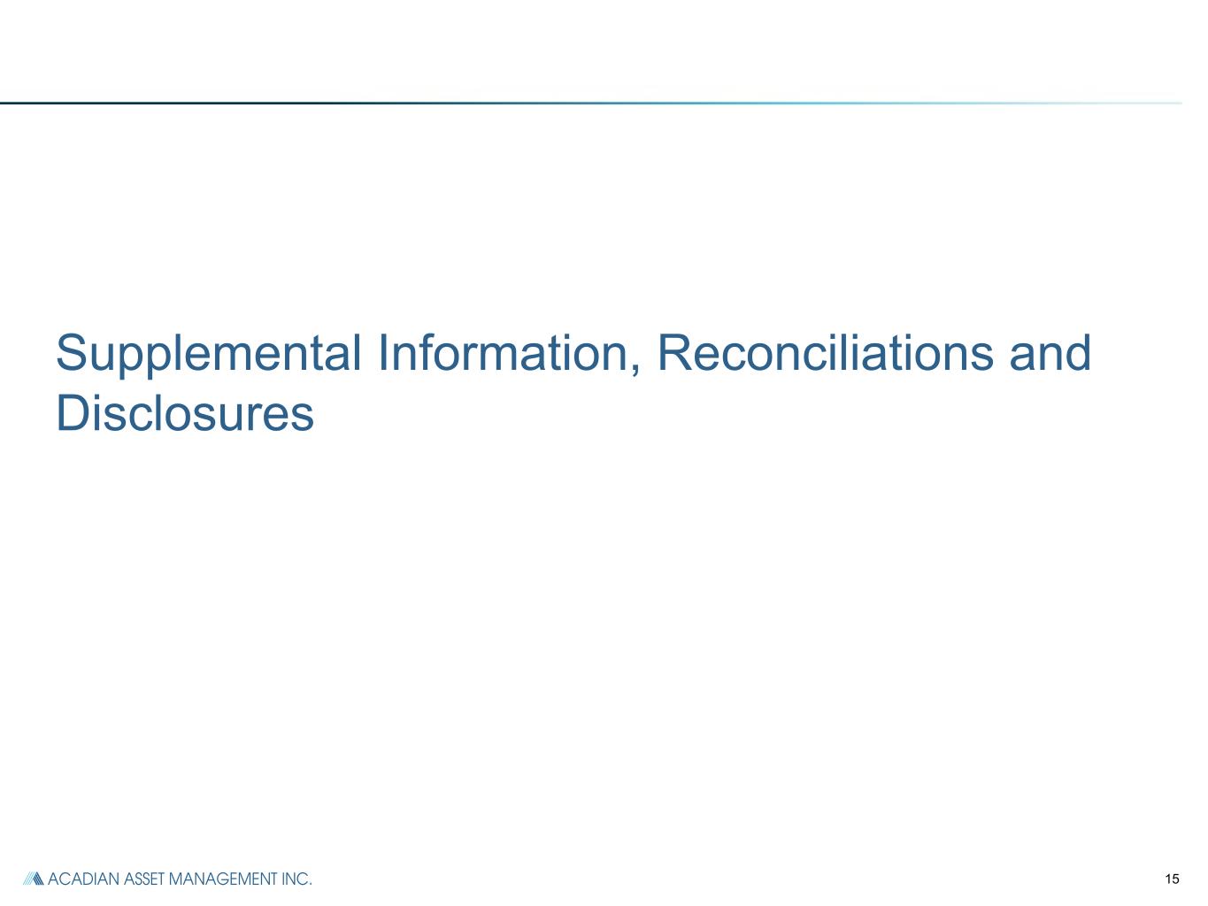 14 Closing: Acadian Compelling Investment Opportunity (1) Data as of December 31, 2025. Past performance is no guarantee of future results. This is not investment advice and may not be construed as sales or marketing material for any financial product or service sponsored or provided by Acadian. Competitive Position ■ Only pure-play, publicly traded systematic manager ■ 40-year track record with competitive edge in systematic investing ■ Strong performance track record with more than 95% of strategies by revenue outperforming benchmarks over 3- / 5- / 10- year periods(1) Business Momentum ■ Net inflows of $5.4 billion for Q4'25, (3% of BoP AUM), $29.4 billion for 2025 (25% of BoP AUM), highest annual net inflows in firm history ■ AUM of $177.5 billion(1), highest in the firm’s 40 year history Q4'25 Financial Results ■ Record quarterly management fees of $146.4 million, up 32% from Q4'24 ■ ENI EPS of $1.32, highest ever in the firms’s history, up 2% from Q4'24 ■ ENI Operating Margin expanded 338 bps to 45.7%, up from 42.3% in Q4'24 Capital Management ■ Senior Notes redemption and Term Loan A refinancing strengthens balance sheet ■ Dividend increased to $0.10 from $0.01 ■ Strong free cash flow positions us to continue to return excess capital to shareholders Positioned to continue to drive growth through targeted distribution initiatives and new product offerings