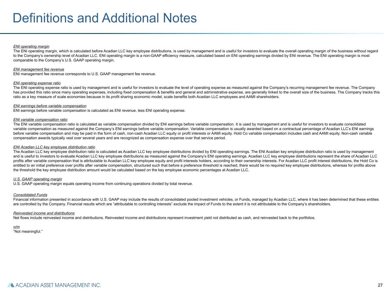 27 Definitions and Additional Notes ENI operating margin The ENI operating margin, which is calculated before Acadian LLC key employee distributions, is used by management and is useful for investors to evaluate the overall operating margin of the business without regard to the Company’s ownership level of Acadian LLC. ENI operating margin is a non-GAAP efficiency measure, calculated based on ENI operating earnings divided by ENI revenue. The ENI operating margin is most comparable to the Company’s U.S. GAAP operating margin. ENI management fee revenue ENI management fee revenue corresponds to U.S. GAAP management fee revenue. ENI operating expense ratio The ENI operating expense ratio is used by management and is useful for investors to evaluate the level of operating expense as measured against the Company’s recurring management fee revenue. The Company has provided this ratio since many operating expenses, including fixed compensation & benefits and general and administrative expense, are generally linked to the overall size of the business. The Company tracks this ratio as a key measure of scale economies because in its profit sharing economic model, scale benefits both Acadian LLC employees and AAMI shareholders. ENI earnings before variable compensation ENI earnings before variable compensation is calculated as ENI revenue, less ENI operating expense. ENI variable compensation ratio The ENI variable compensation ratio is calculated as variable compensation divided by ENI earnings before variable compensation. It is used by management and is useful for investors to evaluate consolidated variable compensation as measured against the Company’s ENI earnings before variable compensation. Variable compensation is usually awarded based on a contractual percentage of Acadian LLC’s ENI earnings before variable compensation and may be paid in the form of cash, non-cash Acadian LLC equity or profit interests or AAMI equity. Hold Co variable compensation includes cash and AAMI equity. Non-cash variable compensation awards typically vest over several years and are recognized as compensation expense over that service period. ENI Acadian LLC key employee distribution ratio The Acadian LLC key employee distribution ratio is calculated as Acadian LLC key employee distributions divided by ENI operating earnings. The ENI Acadian key employee distribution ratio is used by management and is useful to investors to evaluate Acadian LLC key employee distributions as measured against the Company’s ENI operating earnings. Acadian LLC key employee distributions represent the share of Acadian LLC profits after variable compensation that is attributable to Acadian LLC key employee equity and profit interests holders, according to their ownership interests. For Acadian LLC profit interest distributions, the Hold Co is entitled to an initial preference over profits after variable compensation, structured such that before a preference threshold is reached, there would be no required key employee distributions, whereas for profits above the threshold the key employee distribution amount would be calculated based on the key employee economic percentages at Acadian LLC. U.S. GAAP operating margin U.S. GAAP operating margin equals operating income from continuing operations divided by total revenue. Consolidated Funds Financial information presented in accordance with U.S. GAAP may include the results of consolidated pooled investment vehicles, or Funds, managed by Acadian LLC, where it has been determined that these entities are controlled by the Company. Financial results which are “attributable to controlling interests” exclude the impact of Funds to the extent it is not attributable to the Company’s shareholders. Reinvested income and distributions Net flows include reinvested income and distributions. Reinvested income and distributions represent investment yield not distributed as cash, and reinvested back to the portfolios. n/m “Not meaningful.”