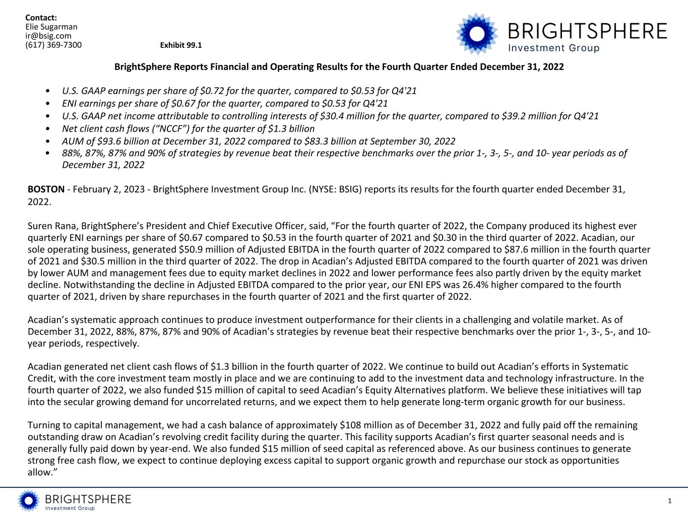 1 Contact: Elie Sugarman ir@bsig.com (617) 369-7300 Exhibit 99.1 BrightSphere Reports Financial and Operating Results for the Fourth Quarter Ended December 31, 2022 • U.S. GAAP earnings per share of $0.72 for the quarter, compared to $0.53 for Q4'21 • ENI earnings per share of $0.67 for the quarter, compared to $0.53 for Q4'21 • U.S. GAAP net income attributable to controlling interests of $30.4 million for the quarter, compared to $39.2 million for Q4'21 • Net client cash flows (“NCCF”) for the quarter of $1.3 billion • AUM of $93.6 billion at December 31, 2022 compared to $83.3 billion at September 30, 2022 • 88%, 87%, 87% and 90% of strategies by revenue beat their respective benchmarks over the prior 1-, 3-, 5-, and 10- year periods as of December 31, 2022 BOSTON - February 2, 2023 - BrightSphere Investment Group Inc. (NYSE: BSIG) reports its results for the fourth quarter ended December 31, 2022. Suren Rana, BrightSphere’s President and Chief Executive Officer, said, “For the fourth quarter of 2022, the Company produced its highest ever quarterly ENI earnings per share of $0.67 compared to $0.53 in the fourth quarter of 2021 and $0.30 in the third quarter of 2022. Acadian, our sole operating business, generated $50.9 million of Adjusted EBITDA in the fourth quarter of 2022 compared to $87.6 million in the fourth quarter of 2021 and $30.5 million in the third quarter of 2022. The drop in Acadian’s Adjusted EBITDA compared to the fourth quarter of 2021 was driven by lower AUM and management fees due to equity market declines in 2022 and lower performance fees also partly driven by the equity market decline. Notwithstanding the decline in Adjusted EBITDA compared to the prior year, our ENI EPS was 26.4% higher compared to the fourth quarter of 2021, driven by share repurchases in the fourth quarter of 2021 and the first quarter of 2022. Acadian’s systematic approach continues to produce investment outperformance for their clients in a challenging and volatile market. As of December 31, 2022, 88%, 87%, 87% and 90% of Acadian’s strategies by revenue beat their respective benchmarks over the prior 1-, 3-, 5-, and 10- year periods, respectively. Acadian generated net client cash flows of $1.3 billion in the fourth quarter of 2022. We continue to build out Acadian’s efforts in Systematic Credit, with the core investment team mostly in place and we are continuing to add to the investment data and technology infrastructure. In the fourth quarter of 2022, we also funded $15 million of capital to seed Acadian’s Equity Alternatives platform. We believe these initiatives will tap into the secular growing demand for uncorrelated returns, and we expect them to help generate long-term organic growth for our business. Turning to capital management, we had a cash balance of approximately $108 million as of December 31, 2022 and fully paid off the remaining outstanding draw on Acadian’s revolving credit facility during the quarter. This facility supports Acadian’s first quarter seasonal needs and is generally fully paid down by year-end. We also funded $15 million of seed capital as referenced above. As our business continues to generate strong free cash flow, we expect to continue deploying excess capital to support organic growth and repurchase our stock as opportunities allow.”