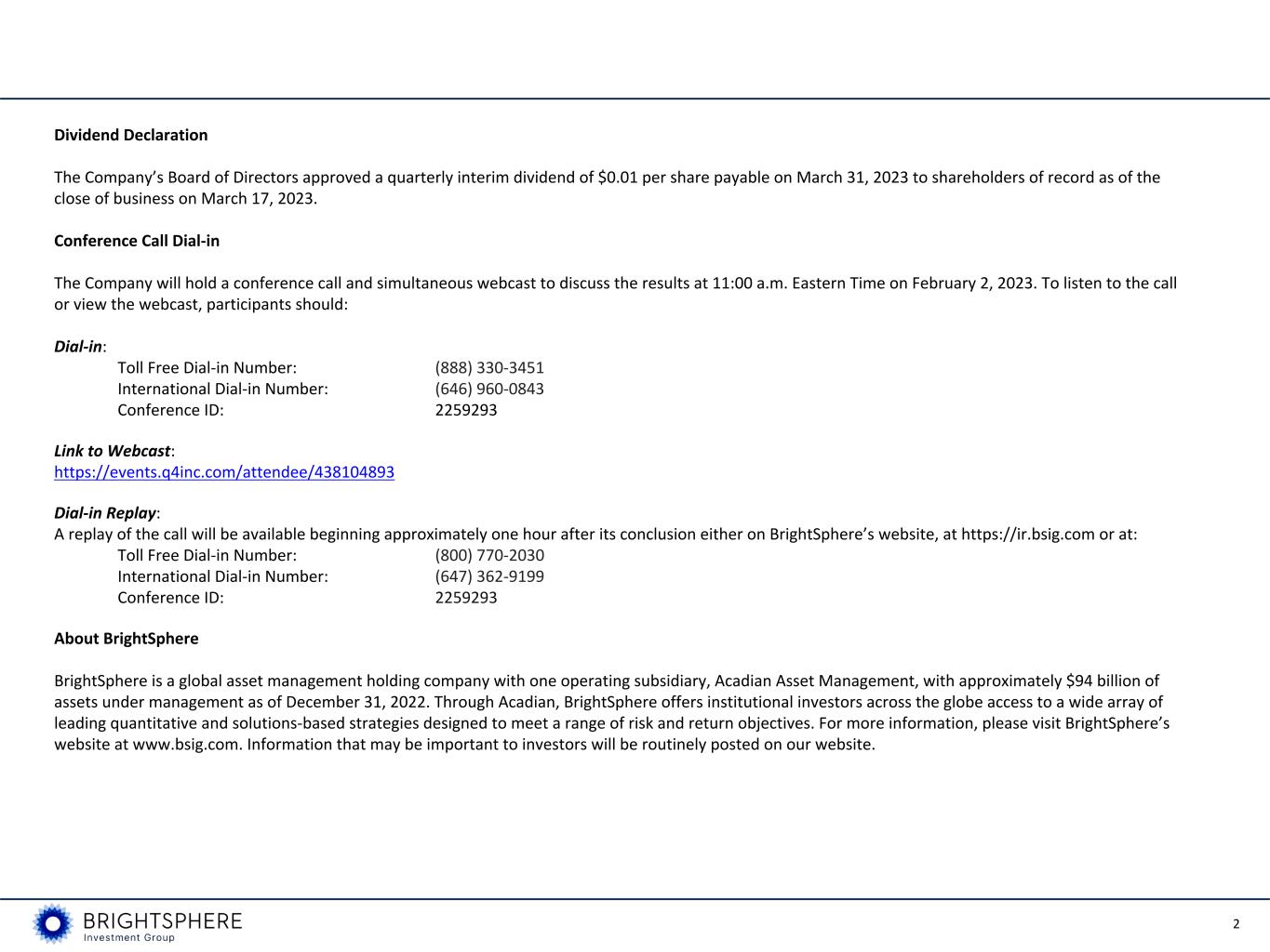 2 Dividend Declaration The Company’s Board of Directors approved a quarterly interim dividend of $0.01 per share payable on March 31, 2023 to shareholders of record as of the close of business on March 17, 2023. Conference Call Dial-in The Company will hold a conference call and simultaneous webcast to discuss the results at 11:00 a.m. Eastern Time on February 2, 2023. To listen to the call or view the webcast, participants should: Dial-in: Toll Free Dial-in Number: (888) 330-3451 International Dial-in Number: (646) 960-0843 Conference ID: 2259293 Link to Webcast: https://events.q4inc.com/attendee/438104893 Dial-in Replay: A replay of the call will be available beginning approximately one hour after its conclusion either on BrightSphere’s website, at https://ir.bsig.com or at: Toll Free Dial-in Number: (800) 770-2030 International Dial-in Number: (647) 362-9199 Conference ID: 2259293 About BrightSphere BrightSphere is a global asset management holding company with one operating subsidiary, Acadian Asset Management, with approximately $94 billion of assets under management as of December 31, 2022. Through Acadian, BrightSphere offers institutional investors across the globe access to a wide array of leading quantitative and solutions-based strategies designed to meet a range of risk and return objectives. For more information, please visit BrightSphere’s website at www.bsig.com. Information that may be important to investors will be routinely posted on our website.