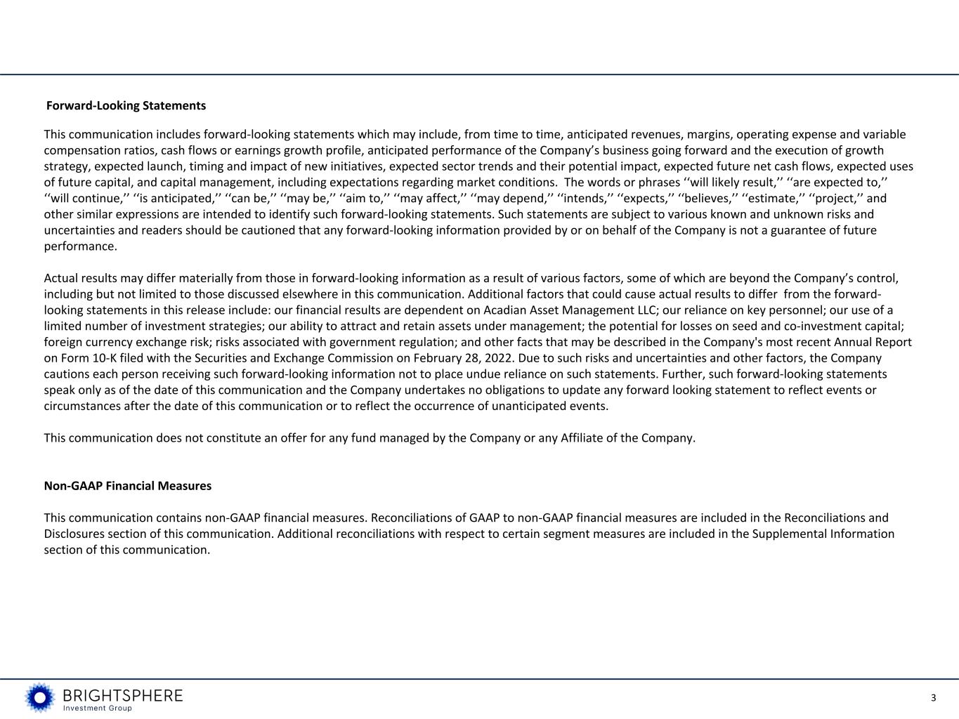 3 Forward-Looking Statements This communication includes forward-looking statements which may include, from time to time, anticipated revenues, margins, operating expense and variable compensation ratios, cash flows or earnings growth profile, anticipated performance of the Company’s business going forward and the execution of growth strategy, expected launch, timing and impact of new initiatives, expected sector trends and their potential impact, expected future net cash flows, expected uses of future capital, and capital management, including expectations regarding market conditions. The words or phrases ‘‘will likely result,’’ ‘‘are expected to,’’ ‘‘will continue,’’ ‘‘is anticipated,’’ ‘‘can be,’’ ‘‘may be,’’ ‘‘aim to,’’ ‘‘may affect,’’ ‘‘may depend,’’ ‘‘intends,’’ ‘‘expects,’’ ‘‘believes,’’ ‘‘estimate,’’ ‘‘project,’’ and other similar expressions are intended to identify such forward-looking statements. Such statements are subject to various known and unknown risks and uncertainties and readers should be cautioned that any forward-looking information provided by or on behalf of the Company is not a guarantee of future performance. Actual results may differ materially from those in forward-looking information as a result of various factors, some of which are beyond the Company’s control, including but not limited to those discussed elsewhere in this communication. Additional factors that could cause actual results to differ from the forward- looking statements in this release include: our financial results are dependent on Acadian Asset Management LLC; our reliance on key personnel; our use of a limited number of investment strategies; our ability to attract and retain assets under management; the potential for losses on seed and co-investment capital; foreign currency exchange risk; risks associated with government regulation; and other facts that may be described in the Company's most recent Annual Report on Form 10-K filed with the Securities and Exchange Commission on February 28, 2022. Due to such risks and uncertainties and other factors, the Company cautions each person receiving such forward-looking information not to place undue reliance on such statements. Further, such forward-looking statements speak only as of the date of this communication and the Company undertakes no obligations to update any forward looking statement to reflect events or circumstances after the date of this communication or to reflect the occurrence of unanticipated events. This communication does not constitute an offer for any fund managed by the Company or any Affiliate of the Company. Non-GAAP Financial Measures This communication contains non-GAAP financial measures. Reconciliations of GAAP to non-GAAP financial measures are included in the Reconciliations and Disclosures section of this communication. Additional reconciliations with respect to certain segment measures are included in the Supplemental Information section of this communication.