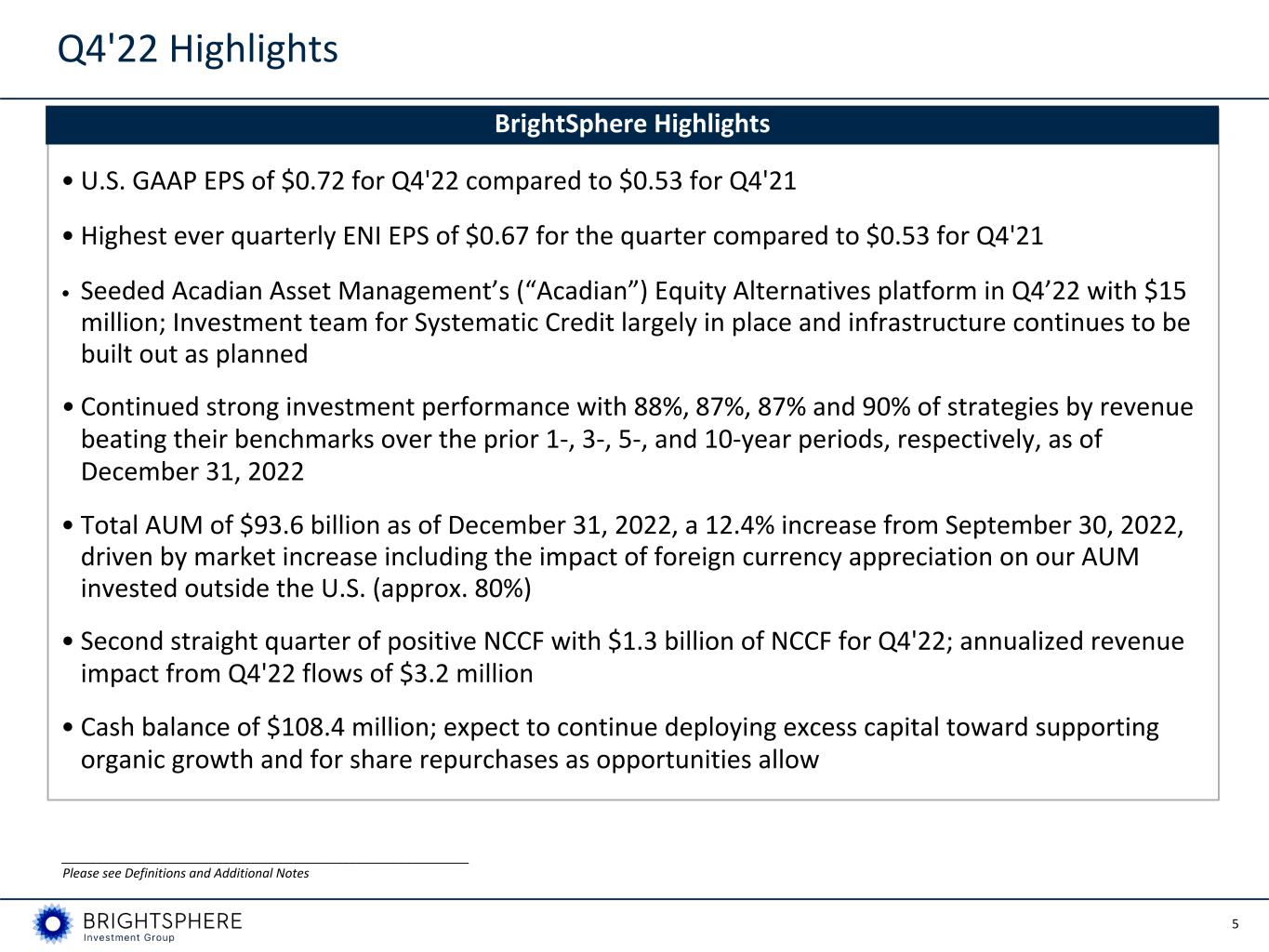 5 • U.S. GAAP EPS of $0.72 for Q4'22 compared to $0.53 for Q4'21 • Highest ever quarterly ENI EPS of $0.67 for the quarter compared to $0.53 for Q4'21 • Seeded Acadian Asset Management’s (“Acadian”) Equity Alternatives platform in Q4’22 with $15 million; Investment team for Systematic Credit largely in place and infrastructure continues to be built out as planned • Continued strong investment performance with 88%, 87%, 87% and 90% of strategies by revenue beating their benchmarks over the prior 1-, 3-, 5-, and 10-year periods, respectively, as of December 31, 2022 • Total AUM of $93.6 billion as of December 31, 2022, a 12.4% increase from September 30, 2022, driven by market increase including the impact of foreign currency appreciation on our AUM invested outside the U.S. (approx. 80%) • Second straight quarter of positive NCCF with $1.3 billion of NCCF for Q4'22; annualized revenue impact from Q4'22 flows of $3.2 million • Cash balance of $108.4 million; expect to continue deploying excess capital toward supporting organic growth and for share repurchases as opportunities allow BrightSphere Highlights Q4'22 Highlights __________________________________________________________ Please see Definitions and Additional Notes