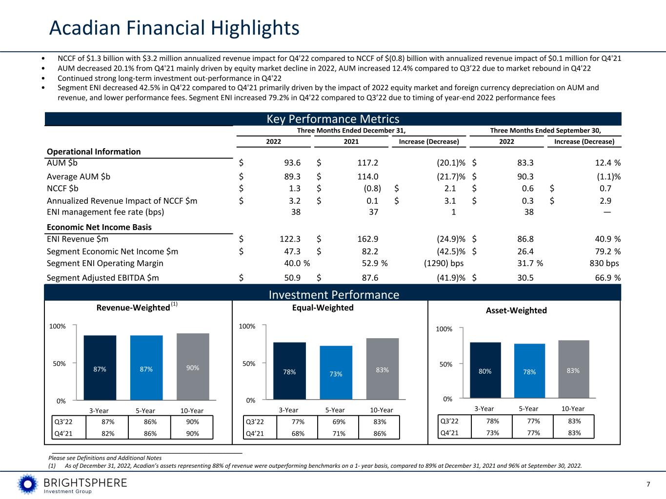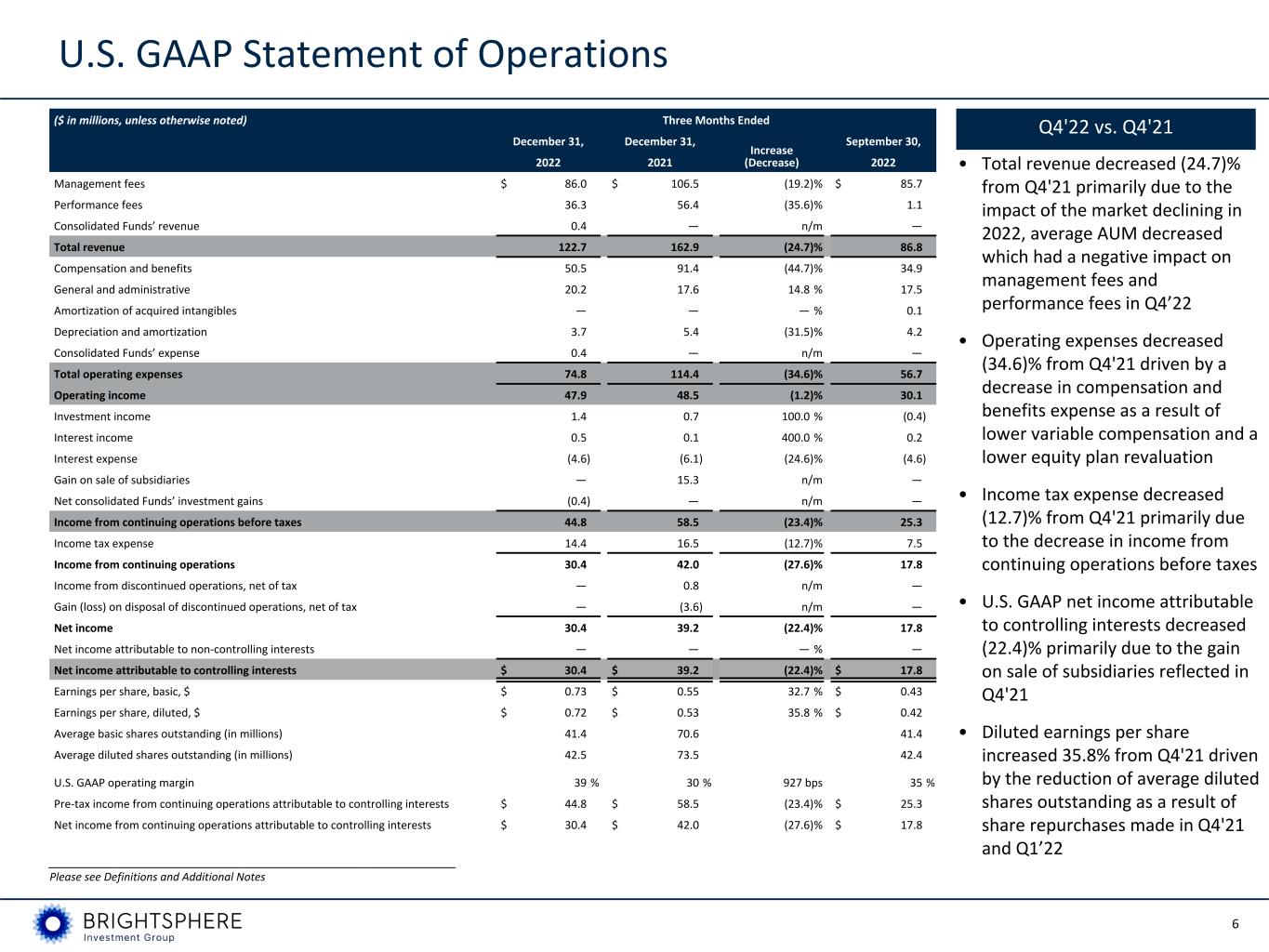 6 • Total revenue decreased (24.7)% from Q4'21 primarily due to the impact of the market declining in 2022, average AUM decreased which had a negative impact on management fees and performance fees in Q4’22 • Operating expenses decreased (34.6)% from Q4'21 driven by a decrease in compensation and benefits expense as a result of lower variable compensation and a lower equity plan revaluation • Income tax expense decreased (12.7)% from Q4'21 primarily due to the decrease in income from continuing operations before taxes • U.S. GAAP net income attributable to controlling interests decreased (22.4)% primarily due to the gain on sale of subsidiaries reflected in Q4'21 • Diluted earnings per share increased 35.8% from Q4'21 driven by the reduction of average diluted shares outstanding as a result of share repurchases made in Q4'21 and Q1’22 U.S. GAAP Statement of Operations ($ in millions, unless otherwise noted) Three Months Ended December 31, December 31, Increase (Decrease) September 30, 2022 2021 2022 Management fees $ 86.0 $ 106.5 (19.2) % $ 85.7 Performance fees 36.3 56.4 (35.6) % 1.1 Consolidated Funds’ revenue 0.4 — n/m — Total revenue 122.7 162.9 (24.7) % 86.8 Compensation and benefits 50.5 91.4 (44.7) % 34.9 General and administrative 20.2 17.6 14.8 % 17.5 Amortization of acquired intangibles — — — % 0.1 Depreciation and amortization 3.7 5.4 (31.5) % 4.2 Consolidated Funds’ expense 0.4 — n/m — Total operating expenses 74.8 114.4 (34.6) % 56.7 Operating income 47.9 48.5 (1.2) % 30.1 Investment income 1.4 0.7 100.0 % (0.4) Interest income 0.5 0.1 400.0 % 0.2 Interest expense (4.6) (6.1) (24.6) % (4.6) Gain on sale of subsidiaries — 15.3 n/m — Net consolidated Funds’ investment gains (0.4) — n/m — Income from continuing operations before taxes 44.8 58.5 (23.4) % 25.3 Income tax expense 14.4 16.5 (12.7) % 7.5 Income from continuing operations 30.4 42.0 (27.6) % 17.8 Income from discontinued operations, net of tax — 0.8 n/m — Gain (loss) on disposal of discontinued operations, net of tax — (3.6) n/m — Net income 30.4 39.2 (22.4) % 17.8 Net income attributable to non-controlling interests — — — % — Net income attributable to controlling interests $ 30.4 $ 39.2 (22.4) % $ 17.8 Earnings per share, basic, $ $ 0.73 $ 0.55 32.7 % $ 0.43 Earnings per share, diluted, $ $ 0.72 $ 0.53 35.8 % $ 0.42 Average basic shares outstanding (in millions) 41.4 70.6 41.4 Average diluted shares outstanding (in millions) 42.5 73.5 42.4 U.S. GAAP operating margin 39 % 30 % 927 bps 35 % Pre-tax income from continuing operations attributable to controlling interests $ 44.8 $ 58.5 (23.4) % $ 25.3 Net income from continuing operations attributable to controlling interests $ 30.4 $ 42.0 (27.6) % $ 17.8 Q4'22 vs. Q4'21 __________________________________________________________ Please see Definitions and Additional Notes
