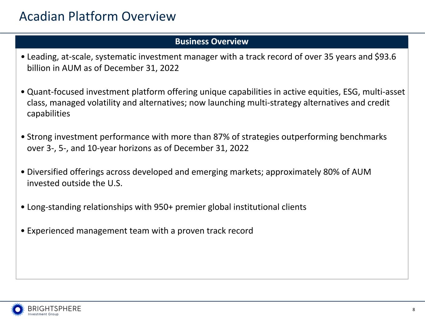 7 Revenue-Weighted 87% 87% 90% 3-Year 5-Year 10-Year 0% 50% 100% Equal-Weighted 78% 73% 83% 3-Year 5-Year 10-Year 0% 50% 100% Acadian Financial Highlights • NCCF of $1.3 billion with $3.2 million annualized revenue impact for Q4'22 compared to NCCF of $(0.8) billion with annualized revenue impact of $0.1 million for Q4'21 • AUM decreased 20.1% from Q4'21 mainly driven by equity market decline in 2022, AUM increased 12.4% compared to Q3’22 due to market rebound in Q4'22 • Continued strong long-term investment out-performance in Q4'22 • Segment ENI decreased 42.5% in Q4'22 compared to Q4'21 primarily driven by the impact of 2022 equity market and foreign currency depreciation on AUM and revenue, and lower performance fees. Segment ENI increased 79.2% in Q4'22 compared to Q3’22 due to timing of year-end 2022 performance fees Investment Performance Q3’22 87% 86% 90% Q4’21 82% 86% 90% Q3’22 77% 69% 83% Q4’21 68% 71% 86% Asset-Weighted 80% 78% 83% 3-Year 5-Year 10-Year 0% 50% 100% Q3’22 78% 77% 83% Q4’21 73% 77% 83% Key Performance Metrics Three Months Ended December 31, Three Months Ended September 30, 2022 2021 Increase (Decrease) 2022 Increase (Decrease) Operational Information AUM $b $ 93.6 $ 117.2 (20.1) % $ 83.3 12.4 % Average AUM $b $ 89.3 $ 114.0 (21.7) % $ 90.3 (1.1) % NCCF $b $ 1.3 $ (0.8) $ 2.1 $ 0.6 $ 0.7 Annualized Revenue Impact of NCCF $m $ 3.2 $ 0.1 $ 3.1 $ 0.3 $ 2.9 ENI management fee rate (bps) 38 37 1 38 — Economic Net Income Basis ENI Revenue $m $ 122.3 $ 162.9 (24.9) % $ 86.8 40.9 % Segment Economic Net Income $m $ 47.3 $ 82.2 (42.5) % $ 26.4 79.2 % Segment ENI Operating Margin 40.0 % 52.9 % (1290) bps 31.7 % 830 bps Segment Adjusted EBITDA $m $ 50.9 $ 87.6 (41.9) % $ 30.5 66.9 % ___________________________________________________________ Please see Definitions and Additional Notes (1) As of December 31, 2022, Acadian’s assets representing 88% of revenue were outperforming benchmarks on a 1- year basis, compared to 89% at December 31, 2021 and 96% at September 30, 2022. (1)