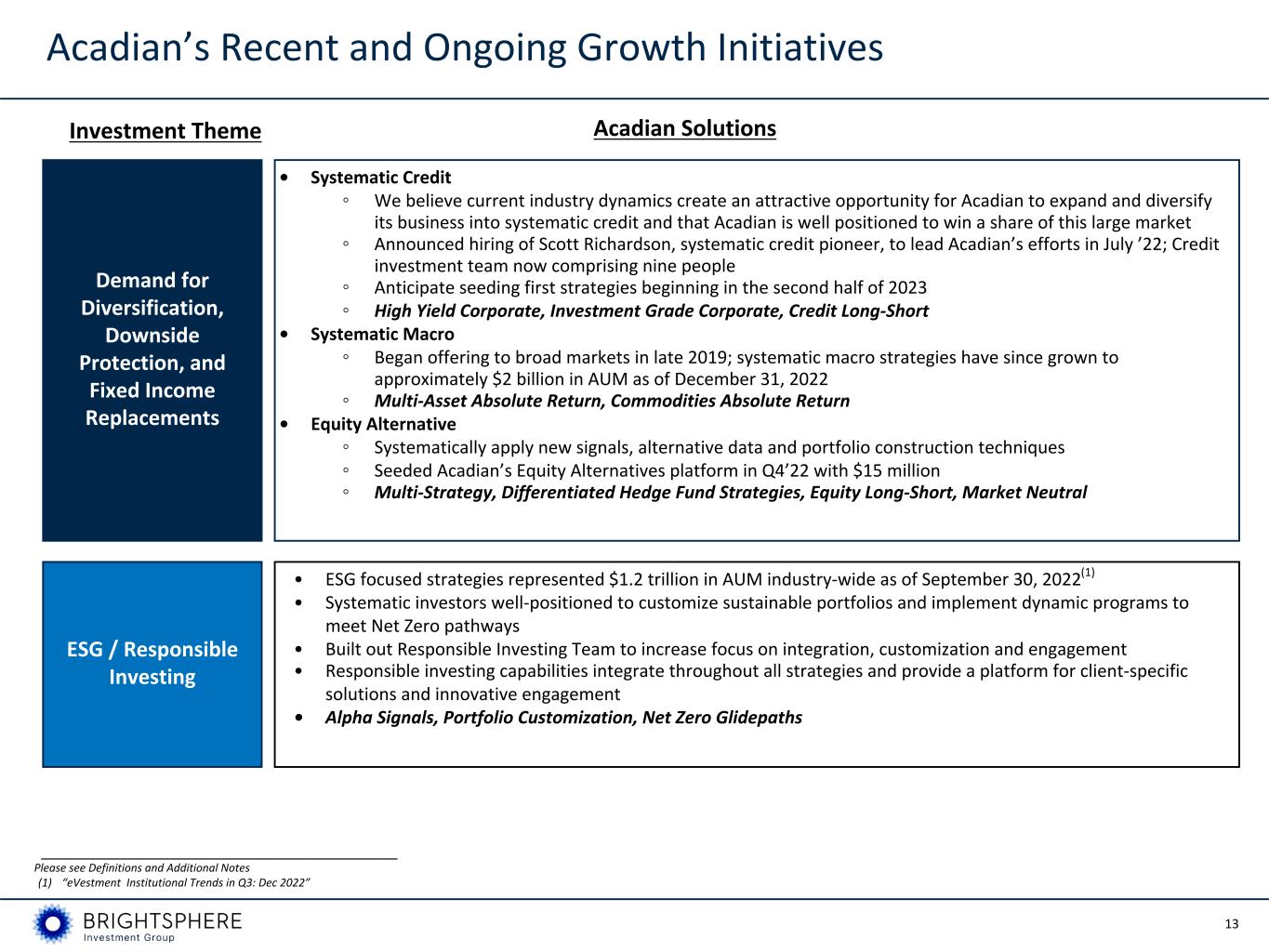 12 Sector Tailwinds Expected to Support Organic Long-term Growth Alpha Secular Trends Anticipated Impact for Acadian Acadian Brand and Barriers to Entry Organic Growth Applying Data and Expertise to New Capabilities Explosive Growth in Alternative Data Continued Development of Advanced Techniques: Machine Learning, AI Scale of Investment in Data, Technology, and Talent Increasingly Important Growing Demand for Uncorrelated Strategies and Customization