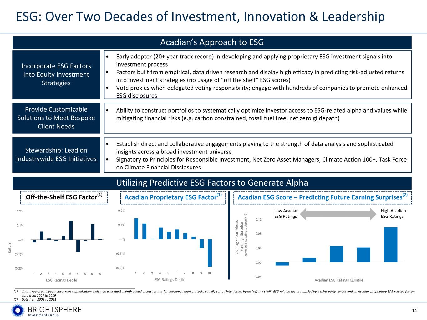 13 • ESG focused strategies represented $1.2 trillion in AUM industry-wide as of September 30, 2022(1) • Systematic investors well-positioned to customize sustainable portfolios and implement dynamic programs to meet Net Zero pathways • Built out Responsible Investing Team to increase focus on integration, customization and engagement • Responsible investing capabilities integrate throughout all strategies and provide a platform for client-specific solutions and innovative engagement • Alpha Signals, Portfolio Customization, Net Zero Glidepaths • Systematic Credit ◦ We believe current industry dynamics create an attractive opportunity for Acadian to expand and diversify its business into systematic credit and that Acadian is well positioned to win a share of this large market ◦ Announced hiring of Scott Richardson, systematic credit pioneer, to lead Acadian’s efforts in July ’22; Credit investment team now comprising nine people ◦ Anticipate seeding first strategies beginning in the second half of 2023 ◦ High Yield Corporate, Investment Grade Corporate, Credit Long-Short • Systematic Macro ◦ Began offering to broad markets in late 2019; systematic macro strategies have since grown to approximately $2 billion in AUM as of December 31, 2022 ◦ Multi-Asset Absolute Return, Commodities Absolute Return • Equity Alternative ◦ Systematically apply new signals, alternative data and portfolio construction techniques ◦ Seeded Acadian’s Equity Alternatives platform in Q4’22 with $15 million ◦ Multi-Strategy, Differentiated Hedge Fund Strategies, Equity Long-Short, Market Neutral Demand for Diversification, Downside Protection, and Fixed Income Replacements Acadian’s Recent and Ongoing Growth Initiatives Investment Theme Acadian Solutions ESG / Responsible Investing __________________________________________________________ Please see Definitions and Additional Notes (1) “eVestment Institutional Trends in Q3: Dec 2022”