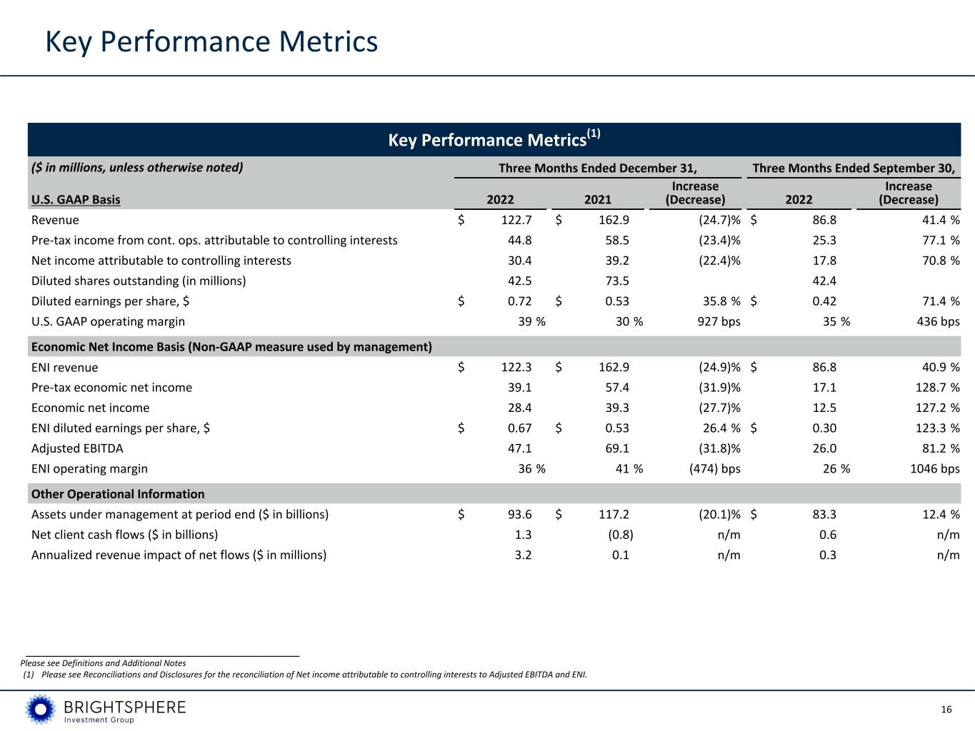 16 Key Performance Metrics Key Performance Metrics(1) ($ in millions, unless otherwise noted) Three Months Ended December 31, Three Months Ended September 30, U.S. GAAP Basis 2022 2021 Increase (Decrease) 2022 Increase (Decrease) Revenue $ 122.7 $ 162.9 (24.7) % $ 86.8 41.4 % Pre-tax income from cont. ops. attributable to controlling interests 44.8 58.5 (23.4) % 25.3 77.1 % Net income attributable to controlling interests 30.4 39.2 (22.4) % 17.8 70.8 % Diluted shares outstanding (in millions) 42.5 73.5 42.4 Diluted earnings per share, $ $ 0.72 $ 0.53 35.8 % $ 0.42 71.4 % U.S. GAAP operating margin 39 % 30 % 927 bps 35 % 436 bps Economic Net Income Basis (Non-GAAP measure used by management) ENI revenue $ 122.3 $ 162.9 (24.9) % $ 86.8 40.9 % Pre-tax economic net income 39.1 57.4 (31.9) % 17.1 128.7 % Economic net income 28.4 39.3 (27.7) % 12.5 127.2 % ENI diluted earnings per share, $ $ 0.67 $ 0.53 26.4 % $ 0.30 123.3 % Adjusted EBITDA 47.1 69.1 (31.8) % 26.0 81.2 % ENI operating margin 36 % 41 % (474) bps 26 % 1046 bps Other Operational Information Assets under management at period end ($ in billions) $ 93.6 $ 117.2 (20.1) % $ 83.3 12.4 % Net client cash flows ($ in billions) 1.3 (0.8) n/m 0.6 n/m Annualized revenue impact of net flows ($ in millions) 3.2 0.1 n/m 0.3 n/m __________________________________________________________ Please see Definitions and Additional Notes (1) Please see Reconciliations and Disclosures for the reconciliation of Net income attributable to controlling interests to Adjusted EBITDA and ENI.