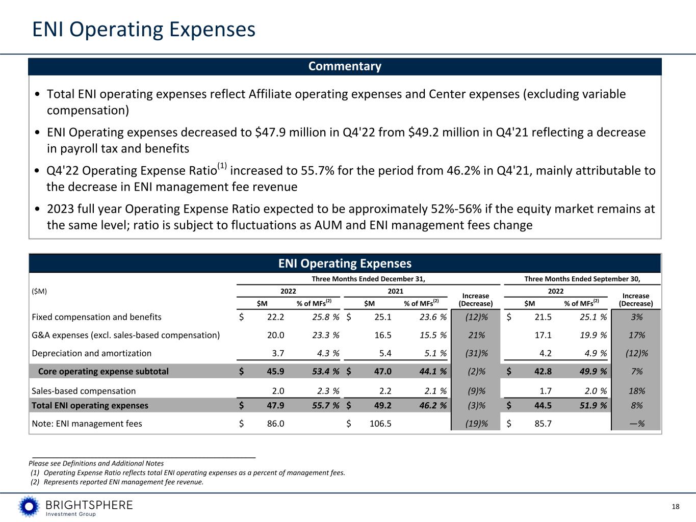 17 ENI Revenue • ENI revenue includes management fees and performance fees • Q4'22 ENI revenue of $122.3 million decreased from Q4'21 by (25)% primarily due to market decline and lower performance fees • Management fees decreased (19)% from Q4'21 due to a 22% decrease in average AUM mainly as the result of 2022 market depreciation Commentary ENI Revenue ($M) Three Months Ended December 31, Three Months Ended September 30, 2022 2021 Increase (Decrease) 2022 Increase (Decrease) Management fees $ 86.0 $ 106.5 (19)% $ 85.7 —% Performance fees 36.3 56.4 (36)% 1.1 n/m ENI revenue $ 122.3 $ 162.9 (25)% $ 86.8 41% __________________________________________________________ Please see Definitions and Additional Notes