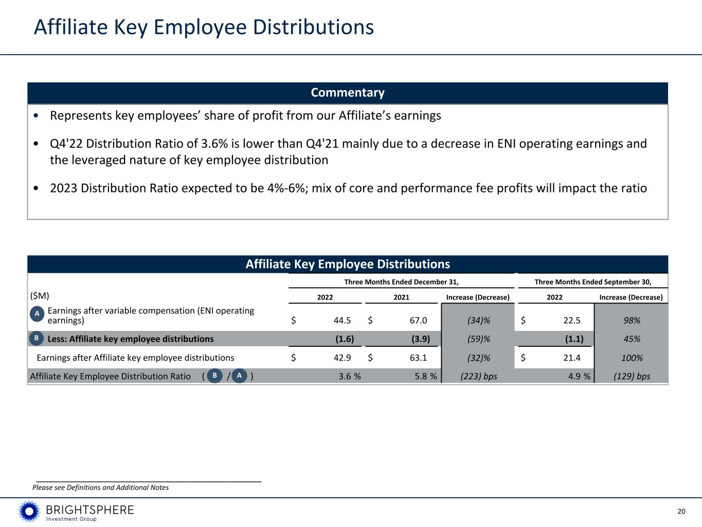 19 ENI Variable Compensation ($M) Three Months Ended December 31, Three Months Ended September 30, 2022 2021 Increase (Decrease) 2022 Increase (Decrease) Cash variable compensation $ 27.6 $ 45.1 (39)% $ 17.6 57% Add: Non-cash equity-based award amortization 2.3 1.6 44% 2.2 5% Variable compensation 29.9 46.7 (36)% 19.8 51% Earnings before variable compensation $ 74.4 $ 113.7 (35)% $ 42.3 76% Variable Compensation Ratio (VC as % of earnings before variable comp.) 40.2 % 41.1 % (88) bps 46.8 % (662) bps • Variable compensation is typically awarded based on contractual percentage of our Affiliate’s ENI earnings before variable compensation plus Center bonuses and also includes a contractual split of certain performance fees which is recognized over the contractual vesting period ◦ Affiliate variable compensation includes cash and equity provided through recycling ◦ Center variable compensation includes cash and BSIG equity • Q4'22 Variable Compensation Ratio decreased to 40.2% from 41.1% in Q4'21 due to lower profit before variable compensation and performance fees • 2023 full year Variable Compensation Ratio expected to be 46%-52% ___________________________________________________________ Please see Definitions and Additional Notes ENI Variable Compensation Commentary