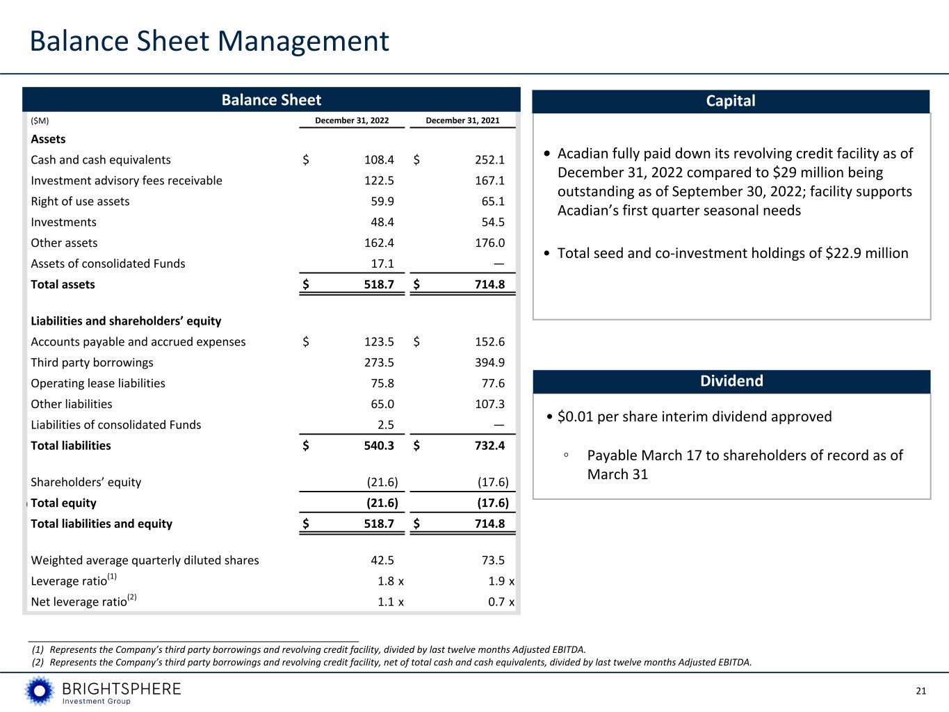 21 Balance Sheet ($M) December 31, 2022 December 31, 2021 Assets Cash and cash equivalents $ 108.4 $ 252.1 Investment advisory fees receivable 122.5 167.1 Right of use assets 59.9 65.1 Investments 48.4 54.5 Other assets 162.4 176.0 Assets of consolidated Funds 17.1 — Total assets $ 518.7 $ 714.8 Liabilities and shareholders’ equity Accounts payable and accrued expenses $ 123.5 $ 152.6 Third party borrowings 273.5 394.9 Operating lease liabilities 75.8 77.6 Other liabilities 65.0 107.3 Liabilities of consolidated Funds 2.5 — Total liabilities $ 540.3 $ 732.4 Shareholders’ equity (21.6) (17.6) @Total equity (21.6) (17.6) Total liabilities and equity $ 518.7 $ 714.8 Weighted average quarterly diluted shares 42.5 73.5 Leverage ratio(1) 1.8 x 1.9 x Net leverage ratio(2) 1.1 x 0.7 x Balance Sheet Management • $0.01 per share interim dividend approved ◦ Payable March 17 to shareholders of record as of March 31 • Acadian fully paid down its revolving credit facility as of December 31, 2022 compared to $29 million being outstanding as of September 30, 2022; facility supports Acadian’s first quarter seasonal needs • Total seed and co-investment holdings of $22.9 million Capital Dividend _______________________________________________________________ (1) Represents the Company’s third party borrowings and revolving credit facility, divided by last twelve months Adjusted EBITDA. (2) Represents the Company’s third party borrowings and revolving credit facility, net of total cash and cash equivalents, divided by last twelve months Adjusted EBITDA.
