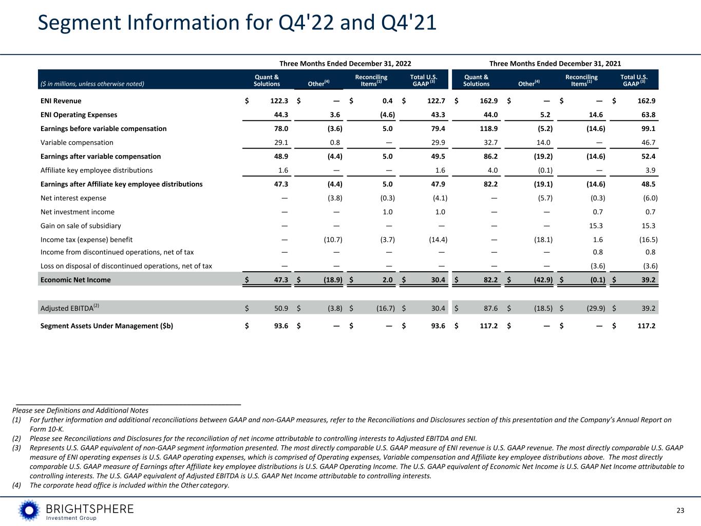 24 Three Months Ended September 30, 2022 ($ in millions, unless otherwise noted) Quant & Solutions Other(4) Reconciling Items(1) Total U.S. GAAP (3) ENI Revenue $ 86.8 $ — $ — $ 86.8 ENI Operating Expenses 40.4 4.1 (8.7) 35.8 Earnings before variable compensation 46.4 (4.1) 8.7 51.0 Variable compensation 18.9 0.9 — 19.8 Earnings after variable compensation 27.5 (5.0) 8.7 31.2 Affiliate key employee distributions 1.1 — — 1.1 Earnings after Affiliate key employee distributions 26.4 (5.0) 8.7 30.1 Net interest expense — (4.3) (0.1) (4.4) Net investment loss — — (0.4) (0.4) Income tax expense — (4.6) (2.9) (7.5) Economic Net Income $ 26.4 $ (13.9) $ 5.3 $ 17.8 Adjusted EBITDA(2) $ 30.5 $ (4.5) $ (8.2) $ 17.8 Segment Assets Under Management ($b) $ 83.3 $ — $ — $ 83.3 Segment Information for Q3'22 __________________________________________________________ Please see Definitions and Additional Notes (1) For further information and additional reconciliations between GAAP and non-GAAP measures, refer to the Reconciliations and Disclosures section of this presentation and the Company’s Annual Report on Form 10-K. (2) Please see Reconciliations and Disclosures for the reconciliation of net income attributable to controlling interests to Adjusted EBITDA and ENI. (3) Represents U.S. GAAP equivalent of non-GAAP segment information presented. The most directly comparable U.S. GAAP measure of ENI revenue is U.S. GAAP revenue. The most directly comparable U.S. GAAP measure of ENI operating expenses is U.S. GAAP operating expenses, which is comprised of Operating expenses, Variable compensation and Affiliate key employee distributions above. The most directly comparable U.S. GAAP measure of Earnings after Affiliate key employee distributions is U.S. GAAP Operating Income. The U.S. GAAP equivalent of Economic Net Income is U.S. GAAP Net Income attributable to controlling interests. The U.S. GAAP equivalent of Adjusted EBITDA is U.S. GAAP Net Income attributable to controlling interests. (4) The corporate head office is included within the Other category.