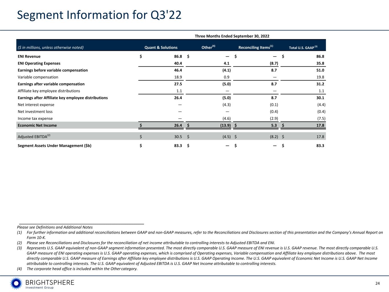 23 Segment Information for Q4'22 and Q4'21 Three Months Ended December 31, 2022 Three Months Ended December 31, 2021 ($ in millions, unless otherwise noted) Quant & Solutions Other(4) Reconciling Items(1) Total U.S. GAAP (3) Quant & Solutions Other(4) Reconciling Items(1) Total U.S. GAAP (3) ENI Revenue $ 122.3 $ — $ 0.4 $ 122.7 $ 162.9 $ — $ — $ 162.9 ENI Operating Expenses 44.3 3.6 (4.6) 43.3 44.0 5.2 14.6 63.8 Earnings before variable compensation 78.0 (3.6) 5.0 79.4 118.9 (5.2) (14.6) 99.1 Variable compensation 29.1 0.8 — 29.9 32.7 14.0 — 46.7 Earnings after variable compensation 48.9 (4.4) 5.0 49.5 86.2 (19.2) (14.6) 52.4 Affiliate key employee distributions 1.6 — — 1.6 4.0 (0.1) — 3.9 Earnings after Affiliate key employee distributions 47.3 (4.4) 5.0 47.9 82.2 (19.1) (14.6) 48.5 Net interest expense — (3.8) (0.3) (4.1) — (5.7) (0.3) (6.0) Net investment income — — 1.0 1.0 — — 0.7 0.7 Gain on sale of subsidiary — — — — — — 15.3 15.3 Income tax (expense) benefit — (10.7) (3.7) (14.4) — (18.1) 1.6 (16.5) Income from discontinued operations, net of tax — — — — — — 0.8 0.8 Loss on disposal of discontinued operations, net of tax — — — — — — (3.6) (3.6) Economic Net Income $ 47.3 $ (18.9) $ 2.0 $ 30.4 $ 82.2 $ (42.9) $ (0.1) $ 39.2 Adjusted EBITDA(2) $ 50.9 $ (3.8) $ (16.7) $ 30.4 $ 87.6 $ (18.5) $ (29.9) $ 39.2 Segment Assets Under Management ($b) $ 93.6 $ — $ — $ 93.6 $ 117.2 $ — $ — $ 117.2 __________________________________________________________ Please see Definitions and Additional Notes (1) For further information and additional reconciliations between GAAP and non-GAAP measures, refer to the Reconciliations and Disclosures section of this presentation and the Company’s Annual Report on Form 10-K. (2) Please see Reconciliations and Disclosures for the reconciliation of net income attributable to controlling interests to Adjusted EBITDA and ENI. (3) Represents U.S. GAAP equivalent of non-GAAP segment information presented. The most directly comparable U.S. GAAP measure of ENI revenue is U.S. GAAP revenue. The most directly comparable U.S. GAAP measure of ENI operating expenses is U.S. GAAP operating expenses, which is comprised of Operating expenses, Variable compensation and Affiliate key employee distributions above. The most directly comparable U.S. GAAP measure of Earnings after Affiliate key employee distributions is U.S. GAAP Operating Income. The U.S. GAAP equivalent of Economic Net Income is U.S. GAAP Net Income attributable to controlling interests. The U.S. GAAP equivalent of Adjusted EBITDA is U.S. GAAP Net Income attributable to controlling interests. (4) The corporate head office is included within the Other category.