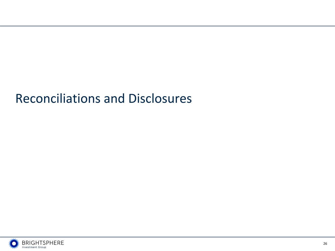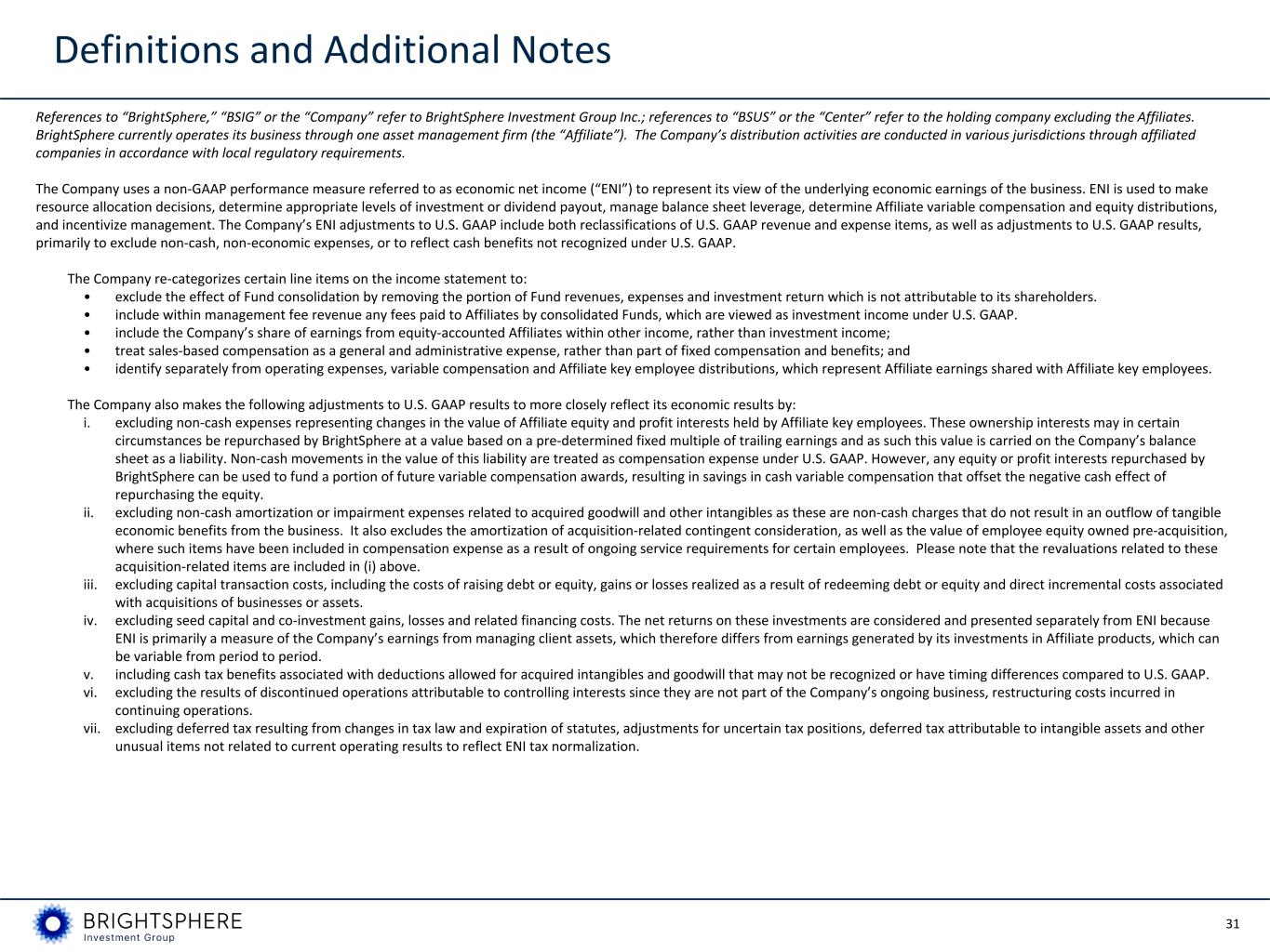 31 Definitions and Additional Notes References to “BrightSphere,” “BSIG” or the “Company” refer to BrightSphere Investment Group Inc.; references to “BSUS” or the “Center” refer to the holding company excluding the Affiliates. BrightSphere currently operates its business through one asset management firm (the “Affiliate”). The Company’s distribution activities are conducted in various jurisdictions through affiliated companies in accordance with local regulatory requirements. The Company uses a non-GAAP performance measure referred to as economic net income (“ENI”) to represent its view of the underlying economic earnings of the business. ENI is used to make resource allocation decisions, determine appropriate levels of investment or dividend payout, manage balance sheet leverage, determine Affiliate variable compensation and equity distributions, and incentivize management. The Company’s ENI adjustments to U.S. GAAP include both reclassifications of U.S. GAAP revenue and expense items, as well as adjustments to U.S. GAAP results, primarily to exclude non-cash, non-economic expenses, or to reflect cash benefits not recognized under U.S. GAAP. The Company re-categorizes certain line items on the income statement to: • exclude the effect of Fund consolidation by removing the portion of Fund revenues, expenses and investment return which is not attributable to its shareholders. • include within management fee revenue any fees paid to Affiliates by consolidated Funds, which are viewed as investment income under U.S. GAAP. • include the Company’s share of earnings from equity-accounted Affiliates within other income, rather than investment income; • treat sales-based compensation as a general and administrative expense, rather than part of fixed compensation and benefits; and • identify separately from operating expenses, variable compensation and Affiliate key employee distributions, which represent Affiliate earnings shared with Affiliate key employees. The Company also makes the following adjustments to U.S. GAAP results to more closely reflect its economic results by: i. excluding non-cash expenses representing changes in the value of Affiliate equity and profit interests held by Affiliate key employees. These ownership interests may in certain circumstances be repurchased by BrightSphere at a value based on a pre-determined fixed multiple of trailing earnings and as such this value is carried on the Company’s balance sheet as a liability. Non-cash movements in the value of this liability are treated as compensation expense under U.S. GAAP. However, any equity or profit interests repurchased by BrightSphere can be used to fund a portion of future variable compensation awards, resulting in savings in cash variable compensation that offset the negative cash effect of repurchasing the equity. ii. excluding non-cash amortization or impairment expenses related to acquired goodwill and other intangibles as these are non-cash charges that do not result in an outflow of tangible economic benefits from the business. It also excludes the amortization of acquisition-related contingent consideration, as well as the value of employee equity owned pre-acquisition, where such items have been included in compensation expense as a result of ongoing service requirements for certain employees. Please note that the revaluations related to these acquisition-related items are included in (i) above. iii. excluding capital transaction costs, including the costs of raising debt or equity, gains or losses realized as a result of redeeming debt or equity and direct incremental costs associated with acquisitions of businesses or assets. iv. excluding seed capital and co-investment gains, losses and related financing costs. The net returns on these investments are considered and presented separately from ENI because ENI is primarily a measure of the Company’s earnings from managing client assets, which therefore differs from earnings generated by its investments in Affiliate products, which can be variable from period to period. v. including cash tax benefits associated with deductions allowed for acquired intangibles and goodwill that may not be recognized or have timing differences compared to U.S. GAAP. vi. excluding the results of discontinued operations attributable to controlling interests since they are not part of the Company’s ongoing business, restructuring costs incurred in continuing operations. vii. excluding deferred tax resulting from changes in tax law and expiration of statutes, adjustments for uncertain tax positions, deferred tax attributable to intangible assets and other unusual items not related to current operating results to reflect ENI tax normalization.