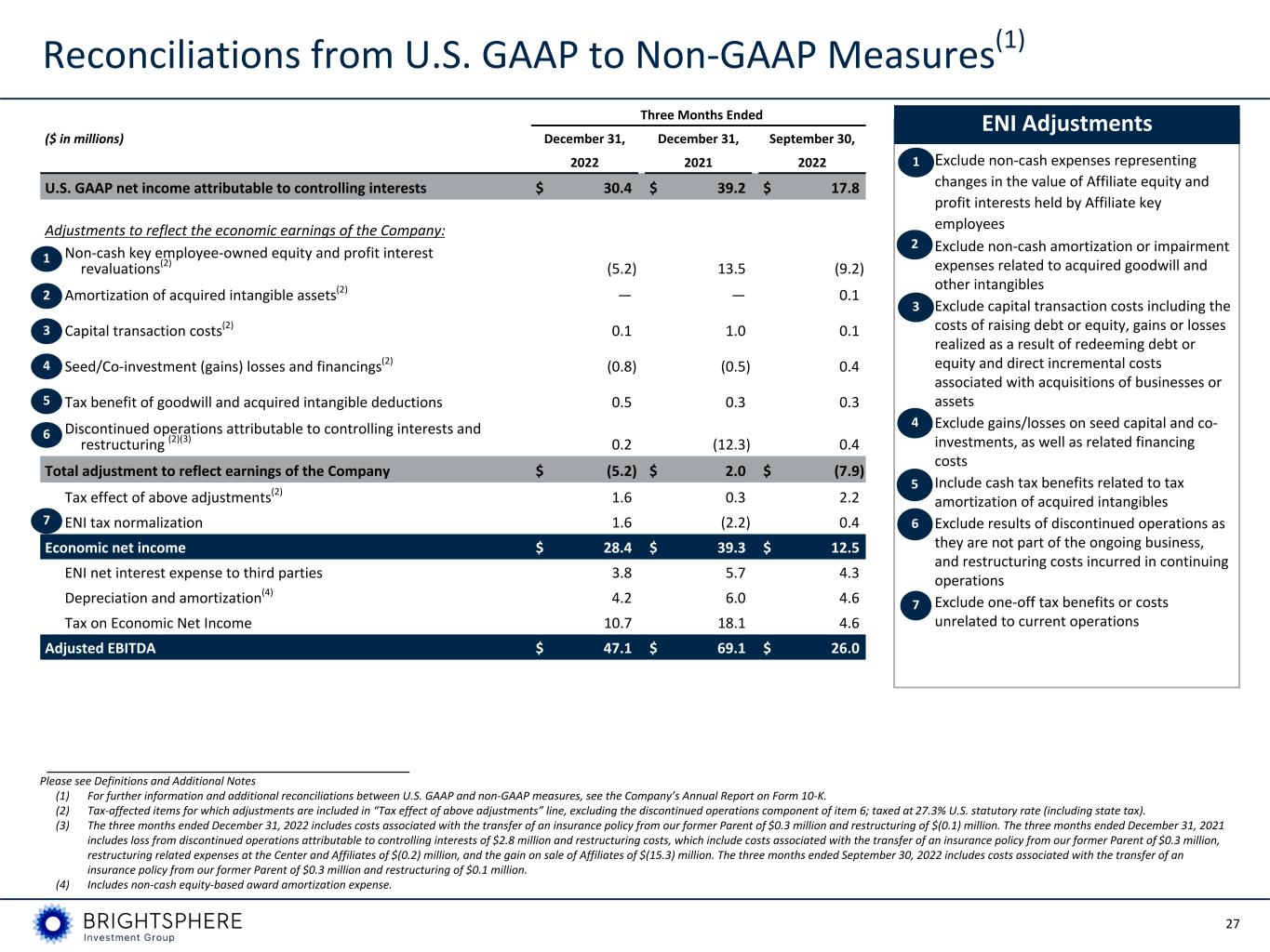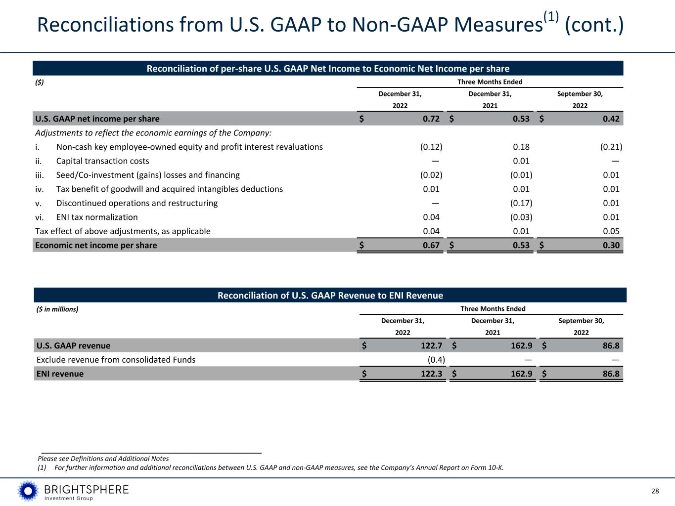 27 Three Months Ended ($ in millions) December 31, December 31, September 30, 2022 2021 2022 U.S. GAAP net income attributable to controlling interests $ 30.4 $ 39.2 $ 17.8 Adjustments to reflect the economic earnings of the Company: Non-cash key employee-owned equity and profit interest revaluations(2) (5.2) 13.5 (9.2) Amortization of acquired intangible assets(2) — — 0.1 Capital transaction costs(2) 0.1 1.0 0.1 Seed/Co-investment (gains) losses and financings(2) (0.8) (0.5) 0.4 Tax benefit of goodwill and acquired intangible deductions 0.5 0.3 0.3 Discontinued operations attributable to controlling interests and restructuring (2)(3) 0.2 (12.3) 0.4 Total adjustment to reflect earnings of the Company $ (5.2) $ 2.0 $ (7.9) Tax effect of above adjustments(2) 1.6 0.3 2.2 ENI tax normalization 1.6 (2.2) 0.4 Economic net income $ 28.4 $ 39.3 $ 12.5 ENI net interest expense to third parties 3.8 5.7 4.3 Depreciation and amortization(4) 4.2 6.0 4.6 Tax on Economic Net Income 10.7 18.1 4.6 Adjusted EBITDA $ 47.1 $ 69.1 $ 26.0 Reconciliations from U.S. GAAP to Non-GAAP Measures(1) i. Exclude non-cash expenses representing changes in the value of Affiliate equity and profit interests held by Affiliate key employees ii. Exclude non-cash amortization or impairment expenses related to acquired goodwill and other intangibles iii.Exclude capital transaction costs including the costs of raising debt or equity, gains or losses realized as a result of redeeming debt or equity and direct incremental costs associated with acquisitions of businesses or assets iv.Exclude gains/losses on seed capital and co- investments, as well as related financing costs v. Include cash tax benefits related to tax amortization of acquired intangibles vi.Exclude results of discontinued operations as they are not part of the ongoing business, and restructuring costs incurred in continuing operations vii. Exclude one-off tax benefits or costs unrelated to current operations ENI Adjustments ___________________________________________________________ Please see Definitions and Additional Notes (1) For further information and additional reconciliations between U.S. GAAP and non-GAAP measures, see the Company’s Annual Report on Form 10-K. (2) Tax-affected items for which adjustments are included in “Tax effect of above adjustments” line, excluding the discontinued operations component of item 6; taxed at 27.3% U.S. statutory rate (including state tax). (3) The three months ended December 31, 2022 includes costs associated with the transfer of an insurance policy from our former Parent of $0.3 million and restructuring of $(0.1) million. The three months ended December 31, 2021 includes loss from discontinued operations attributable to controlling interests of $2.8 million and restructuring costs, which include costs associated with the transfer of an insurance policy from our former Parent of $0.3 million, restructuring related expenses at the Center and Affiliates of $(0.2) million, and the gain on sale of Affiliates of $(15.3) million. The three months ended September 30, 2022 includes costs associated with the transfer of an insurance policy from our former Parent of $0.3 million and restructuring of $0.1 million. (4) Includes non-cash equity-based award amortization expense. 1 3 2 3 4 5 7 6 2 1 4 5 6 7